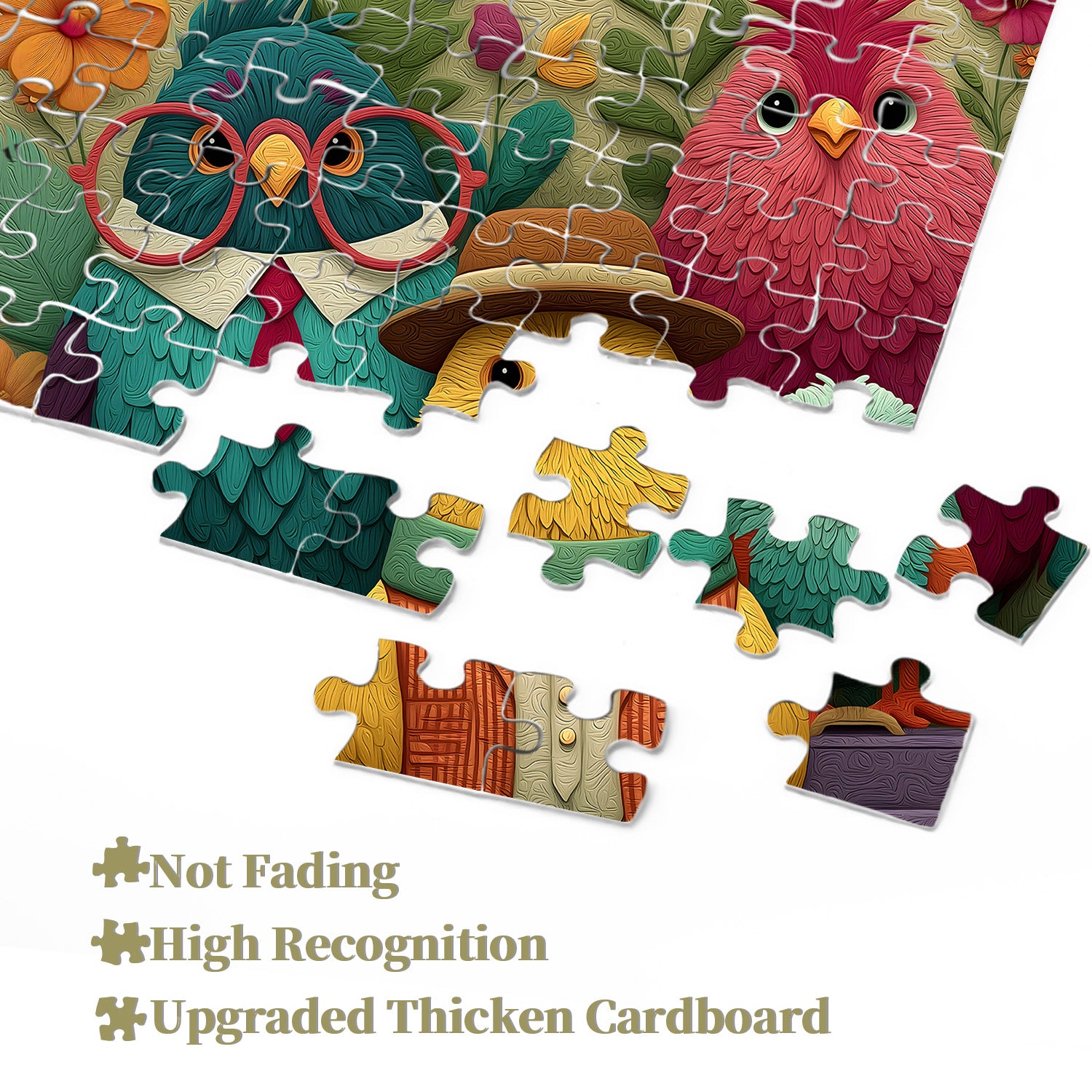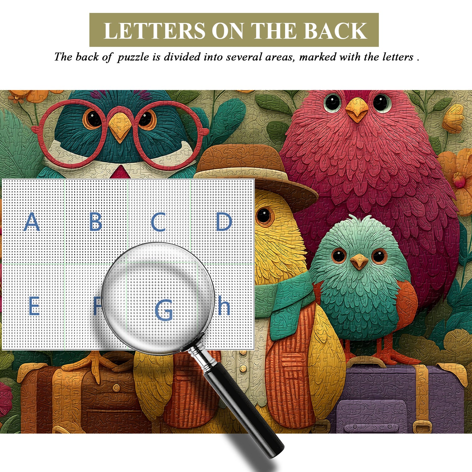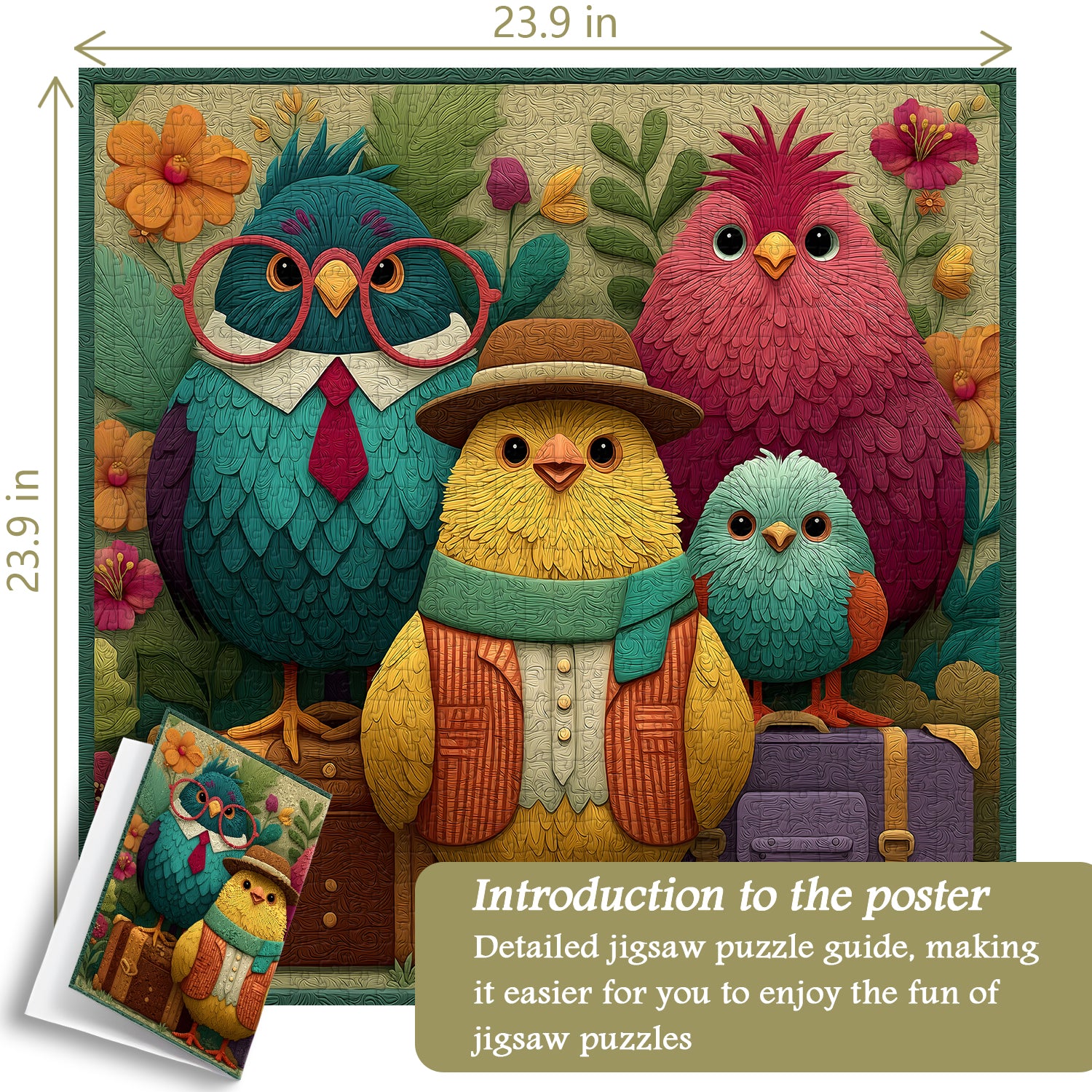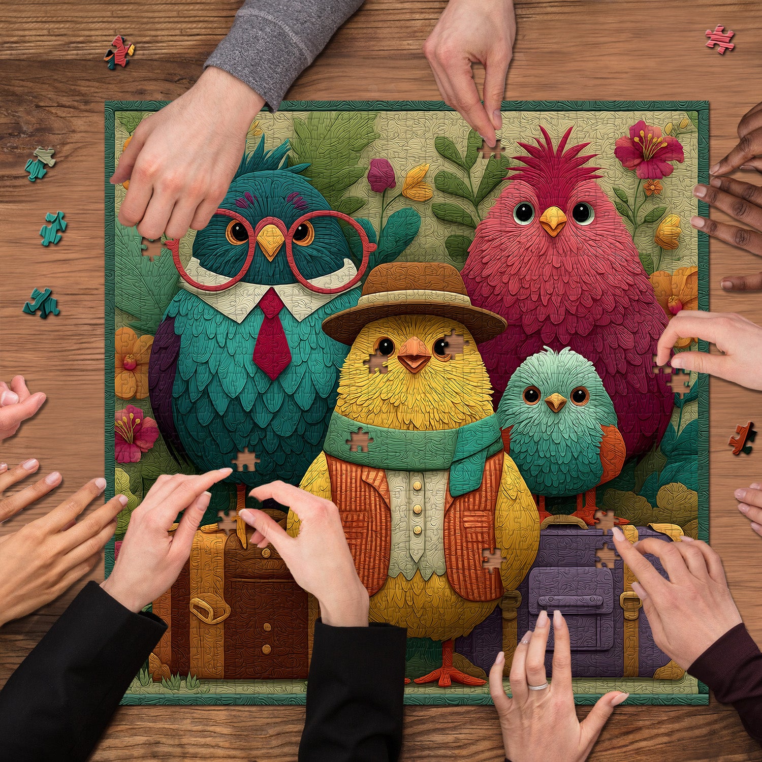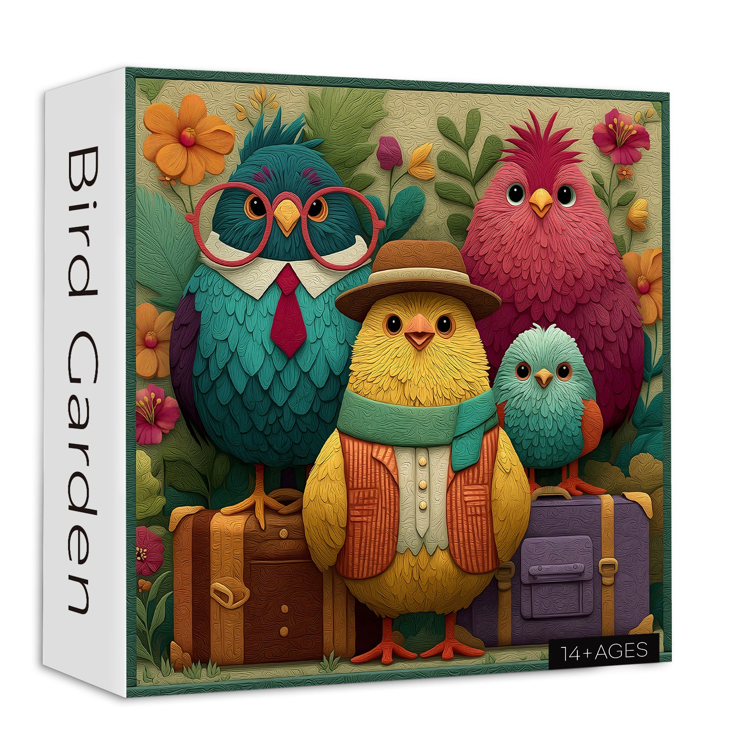 🐦👓【Bird Garden】This puzzle features a group of stylishly dressed birds standing beside a suitcase, seemingly ready to embark on a wondrous journey. Each bird boasts a unique outfit, from retro glasses and a fedora to a colorful scarf, each piece showcasing their personality and style.💐🌈
