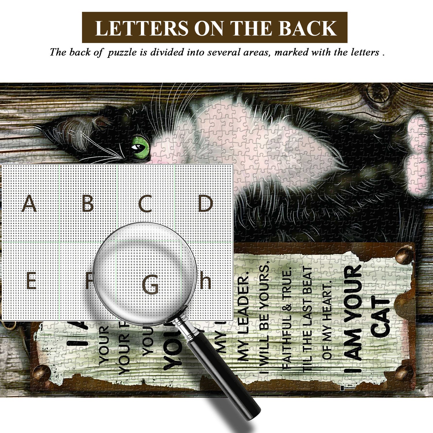 🧩Exquisite Workmenship: 1000 piece jigsaw puzzle cat is printed on three layers of thick white cardboard, precision cutting and clear printing, features vivid color and smooth surface, also has the letters on the back, will help you complete the puzzle.