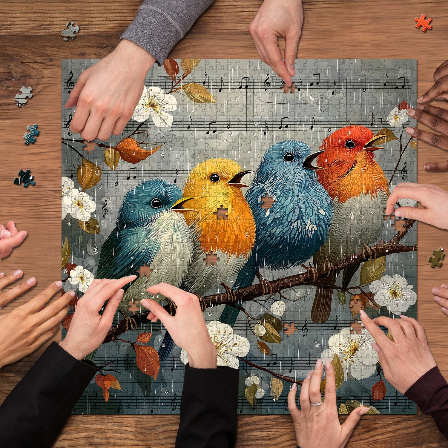 🐦🎶Birds' Rain SonataThe puzzle depicts four brightly colored birds singing merrily on a branch, as if playing a springtime melody. The birds, along with the surrounding leaves and flowers, create a vivid natural scene. The musical symbols and staff background add an artistic atmosphere, with each puzzle piece meticulously showcasing the texture of the bird's feathers and the delicacy of the musical score.🌺🌈