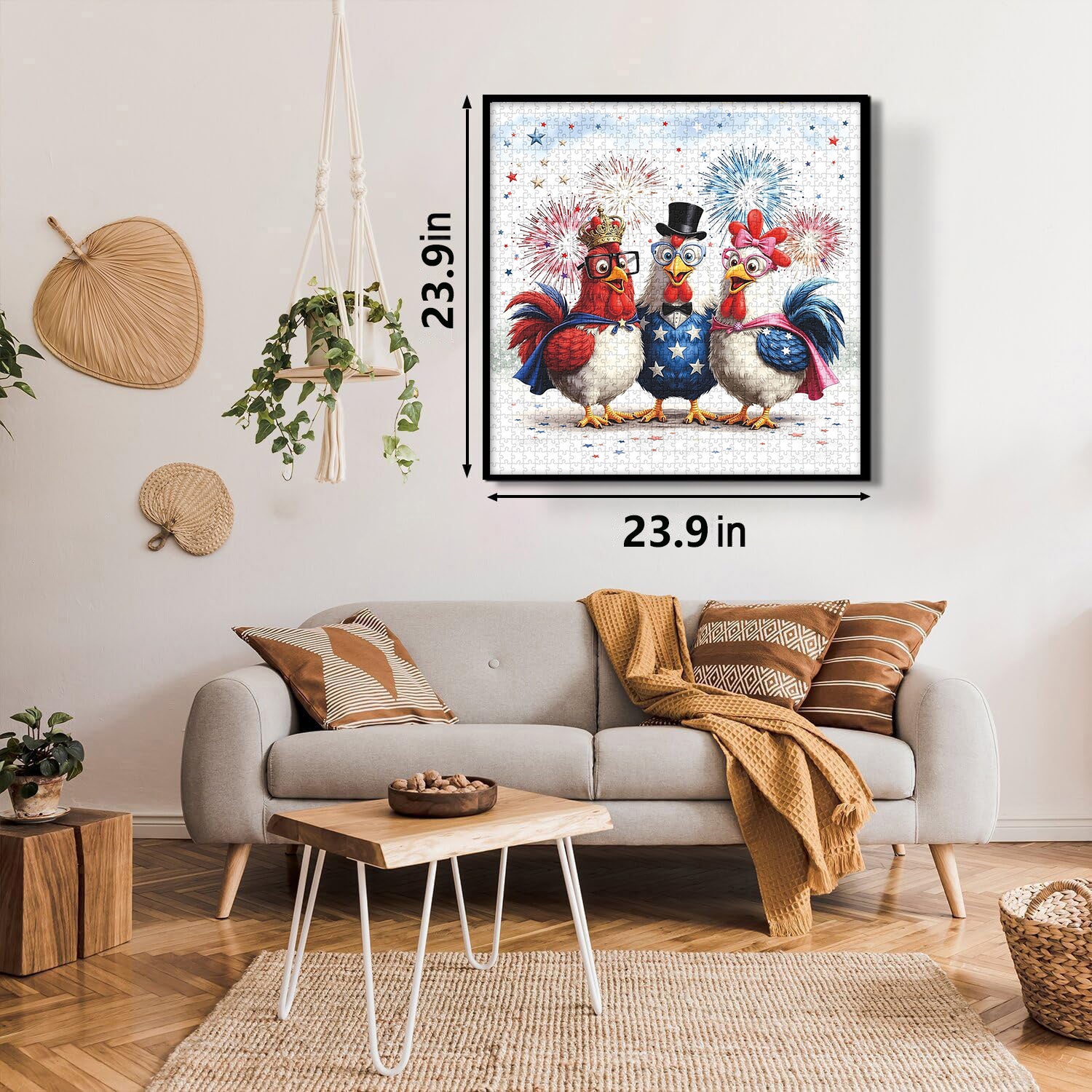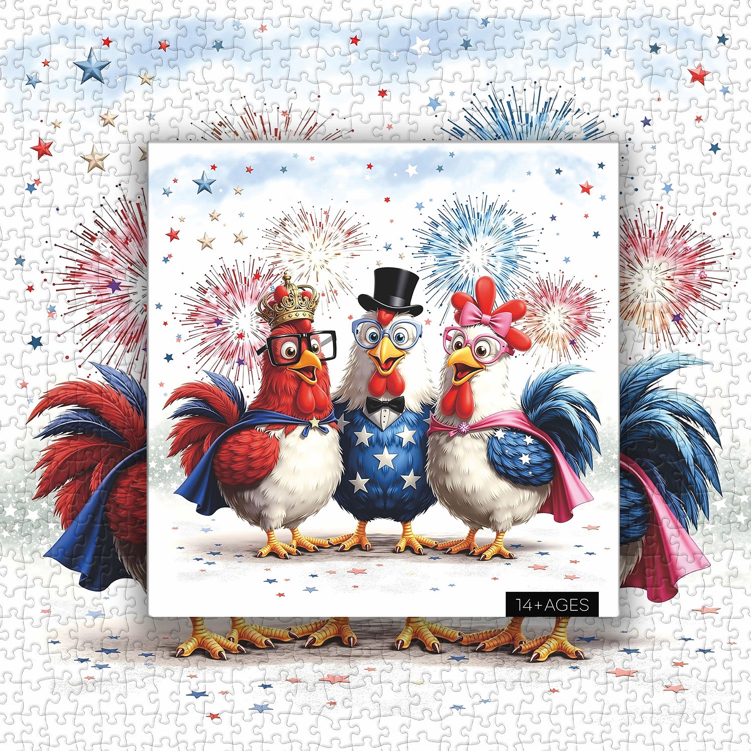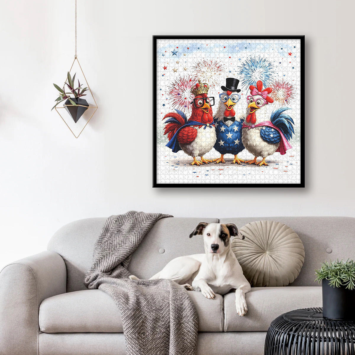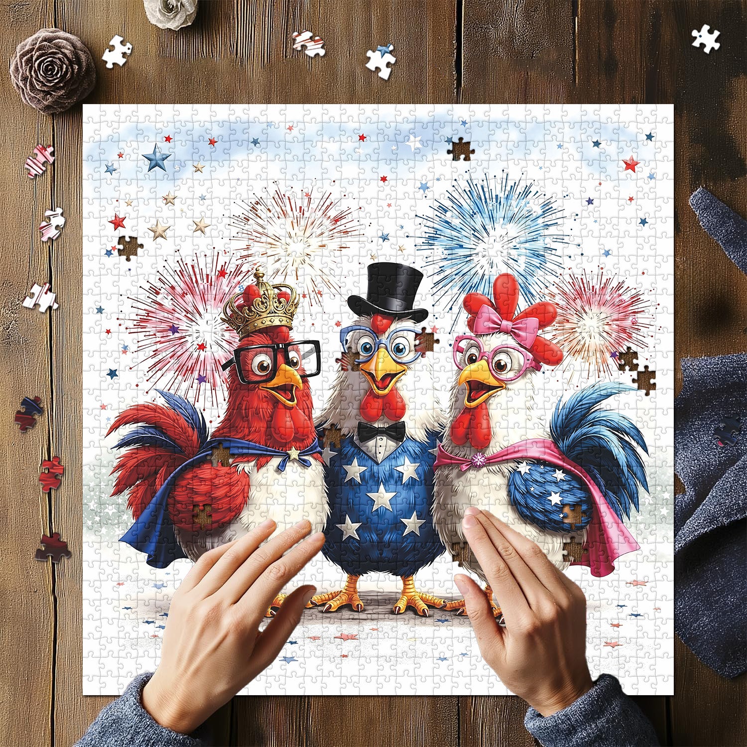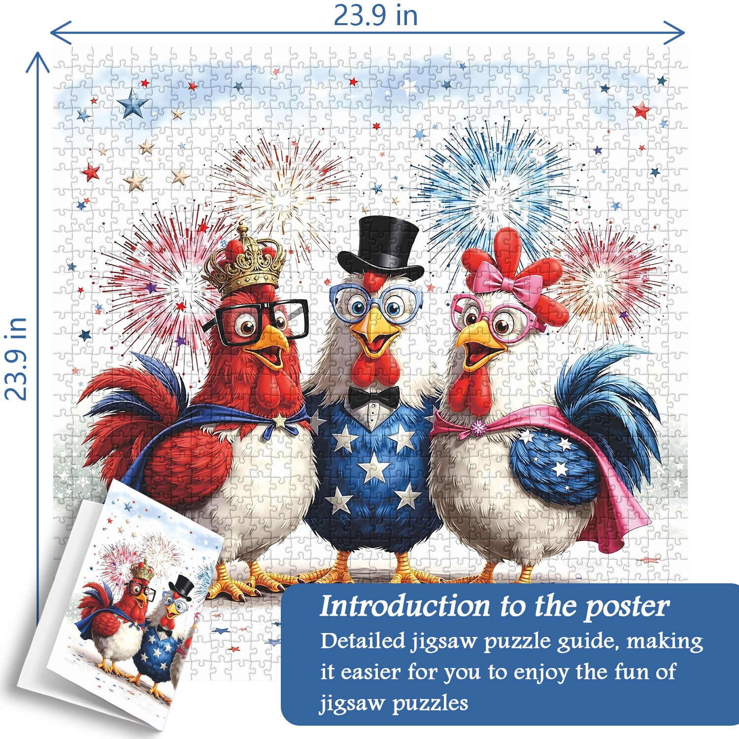 🐤✨Cheerful ChickensThe puzzle depicts three roosters dressed as celebration stars, each radiating a festive atmosphere. The roosters, dressed in party hats, glasses, and bow ties, add a touch of humor and fun. From vibrant red to deep blue, the puzzle pieces are richly colored and full of energy.🌺🌈