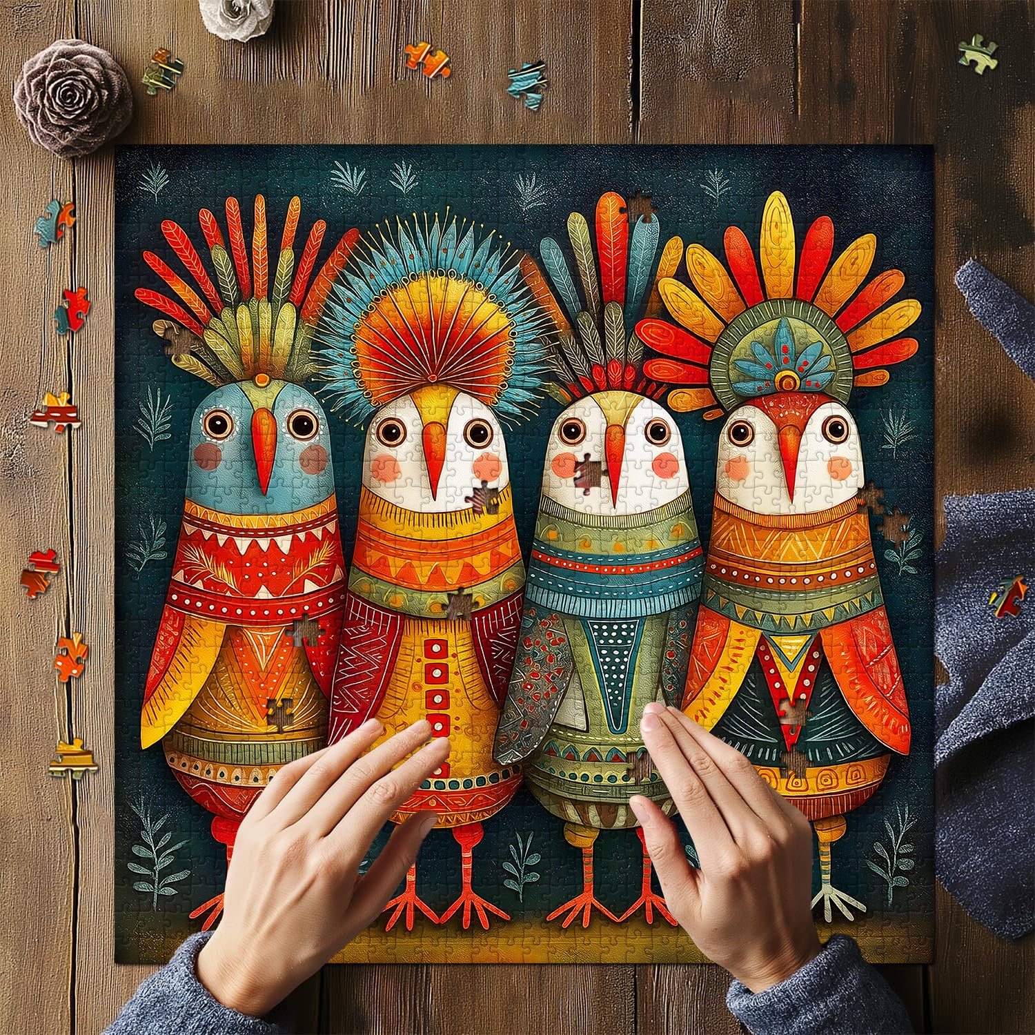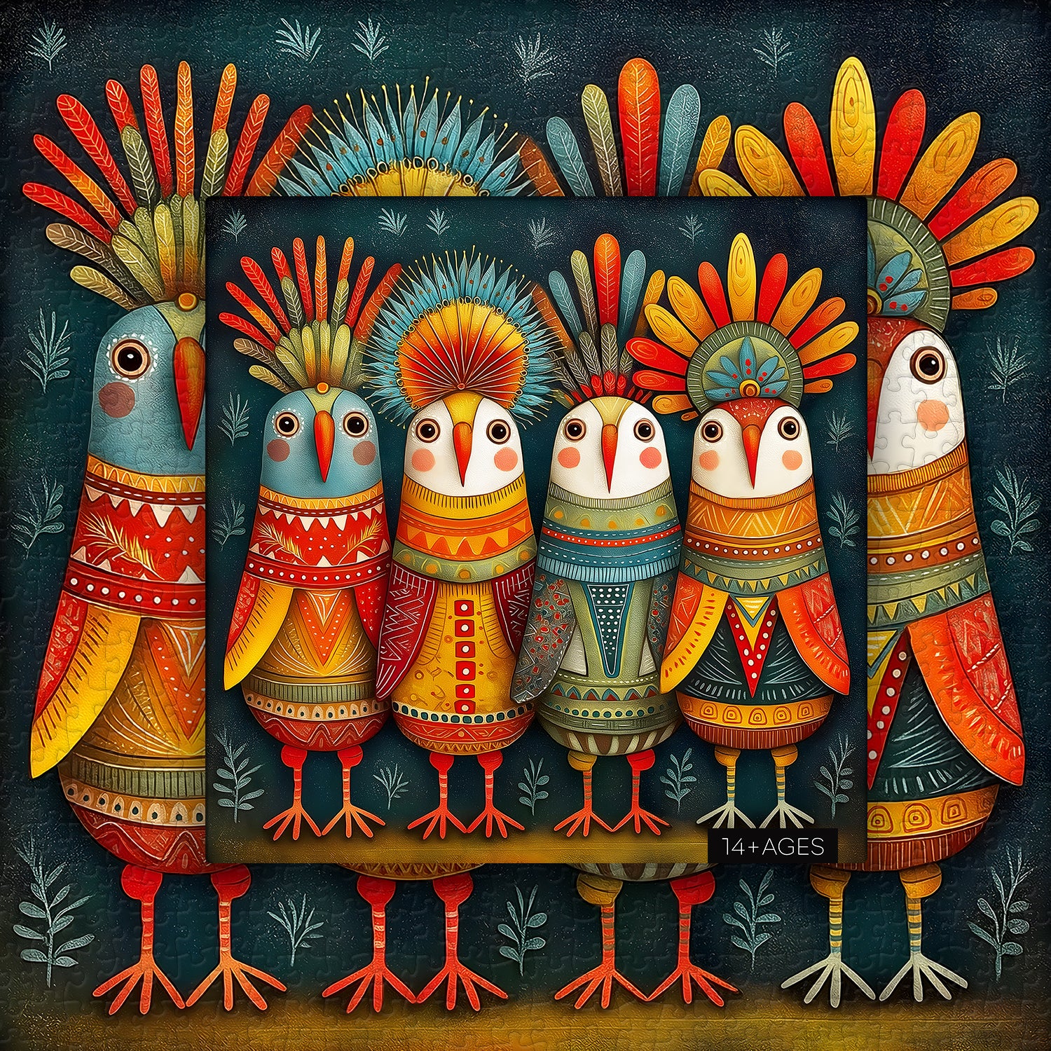 🐦🌈Feather Crown Tribe:The jigsaw puzzle showcases a group of colorful totem birds, each representing a different cultural story. From vibrant red to bright yellow, each puzzle piece is bursting with vivid color.✨