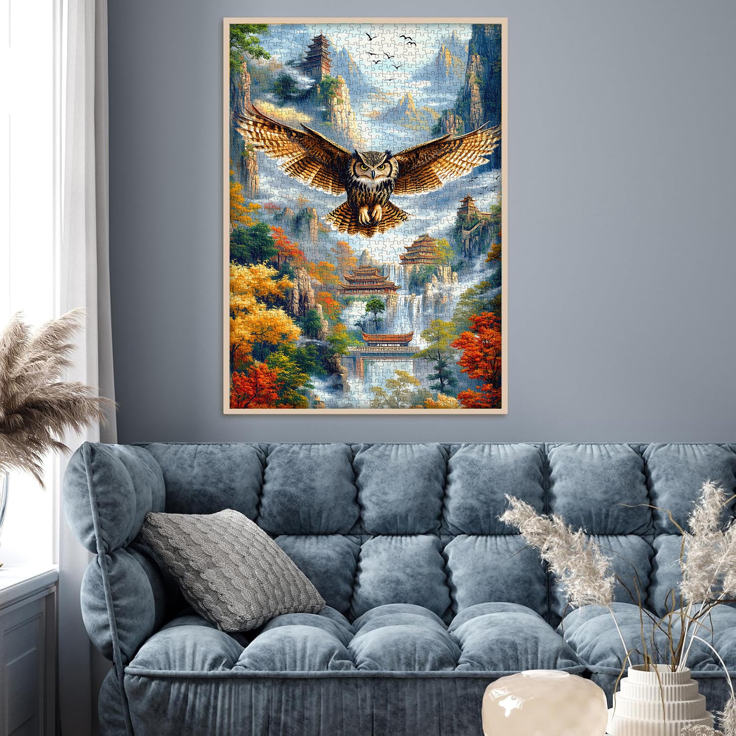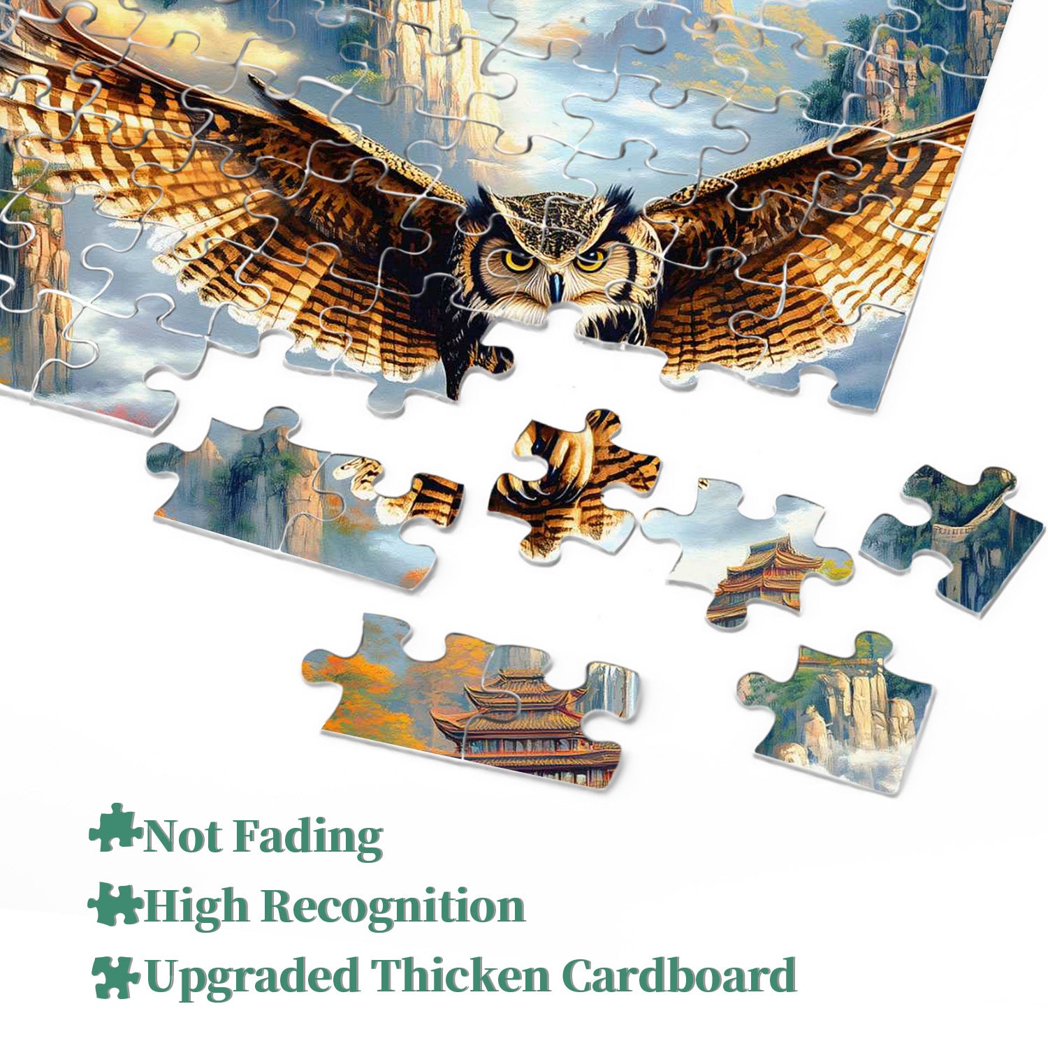 🦅✨【Mountain Owl】An eagle soars amidst the ancient and mysterious landscapes of the East, each piece of the puzzle brimming with mystery and historical atmosphere. The ancient architecture and natural landscape in the jigsaw puzzle blend perfectly, showcasing the elegance and harmony of Eastern architecture.💐❤️