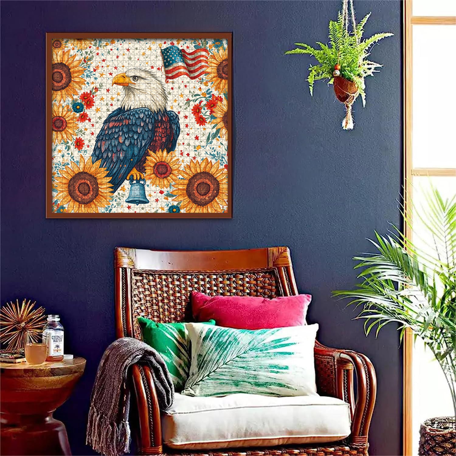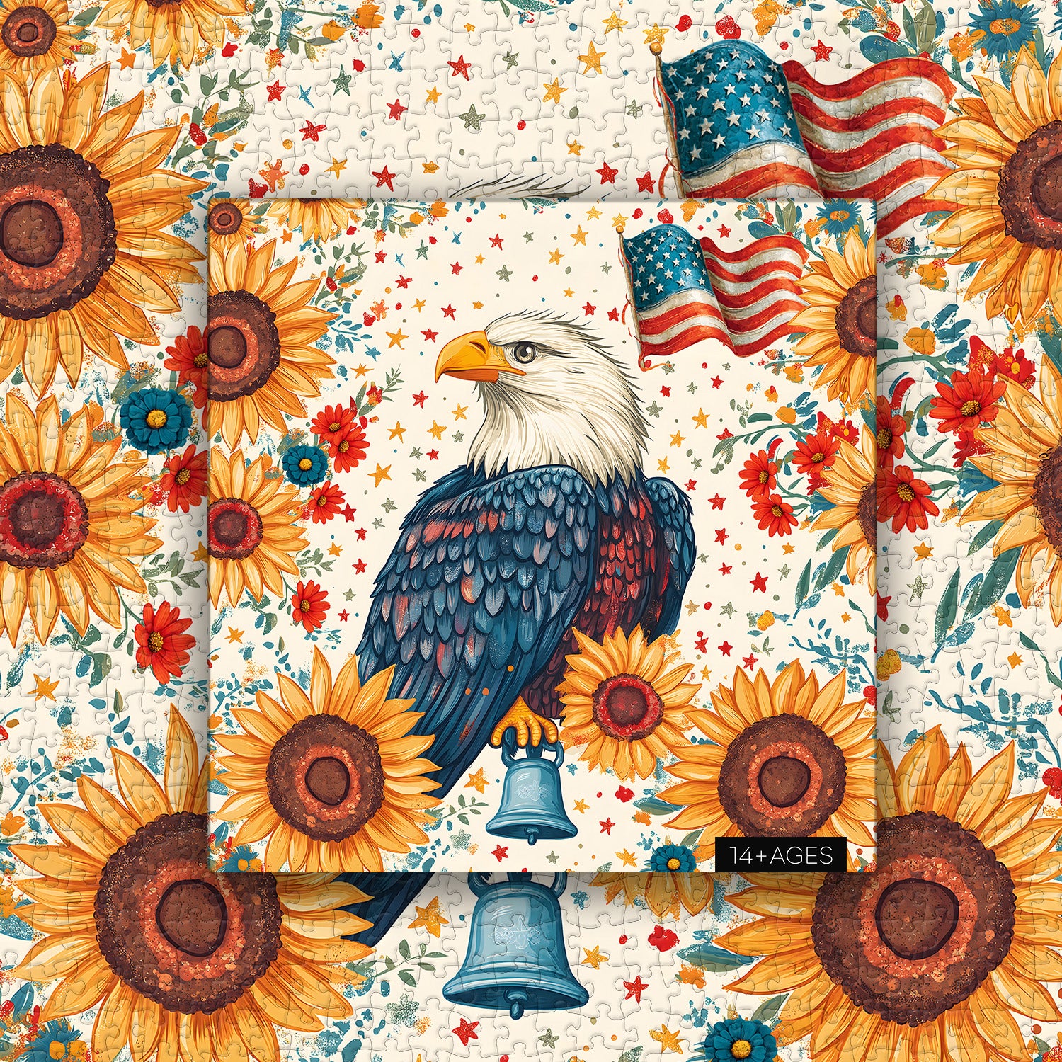 🦅🌻 Patriotic Eagle: This puzzle depicts a majestic bald eagle standing amidst a field of sunflowers—the American flag fluttering behind it, a vintage bell held in its talons, and red and blue stars scattered throughout. American pastoral style and patriotism are gently intertwined. The bright, warm colors are calming and stress-relieving, resulting in a retro work of art brimming with sunny energy.🔔✨