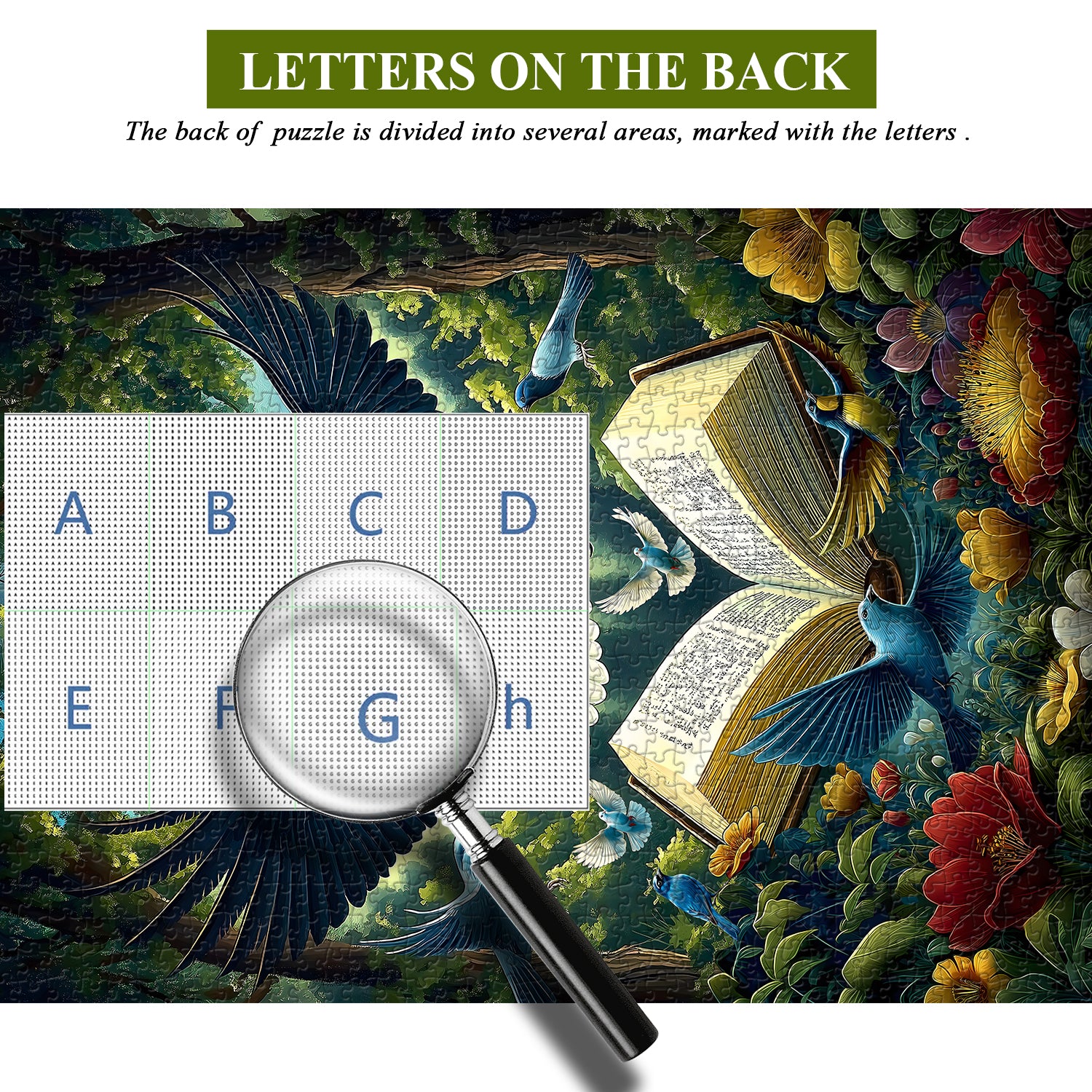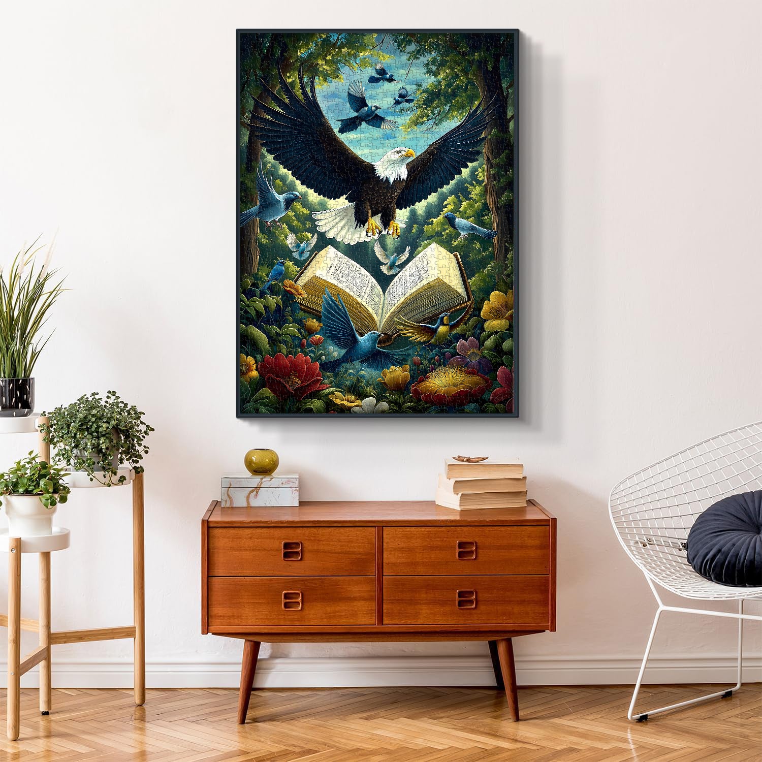 🦅📖【Eagle Plumes Pages】The puzzle's background is a vibrant forest, with colorful flowers and soaring birds adding to the scene's energy. An open book floats in the air, its pages seemingly fluttering in the wind, conveying wisdom. At the center of the puzzle is a soaring eagle, symbolizing freedom and power.🐦🌲
