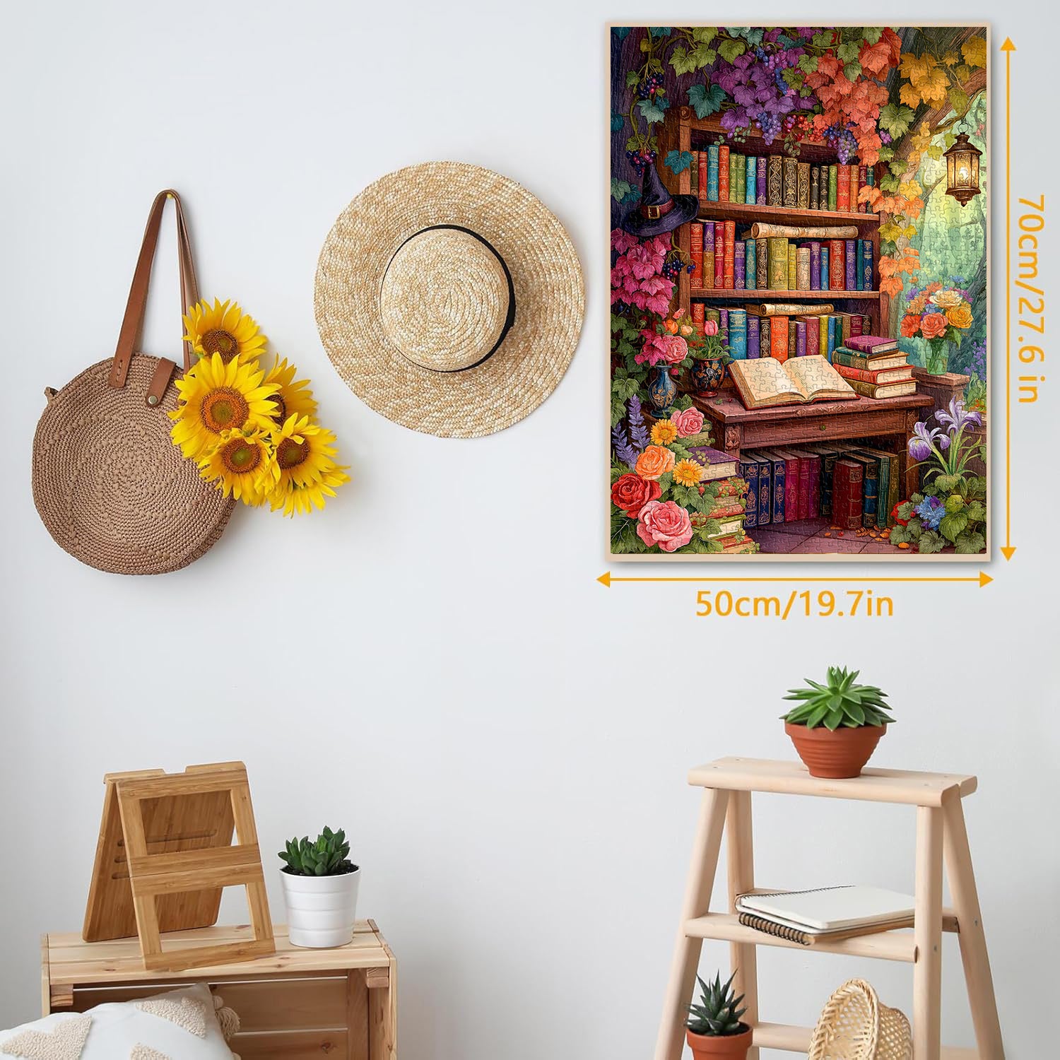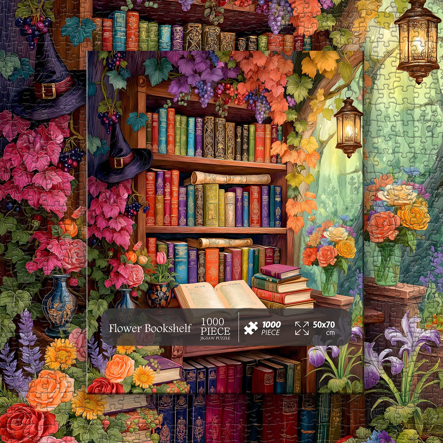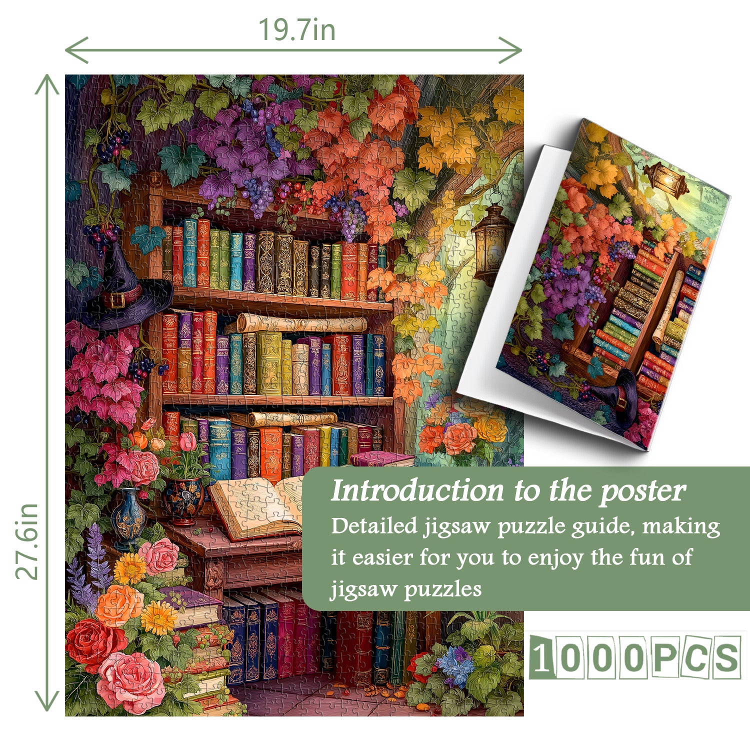 🖼️【Packaging and Dimensions: This 1,000-piece Flower Bookshelf puzzle measures 19.7 x 27.6 inches. Once framed, it becomes a "mobile art exhibit" that will captivate your living room! Includes a high-definition reference poster for zoning, so even beginners can pinpoint every "artistic highlight"~