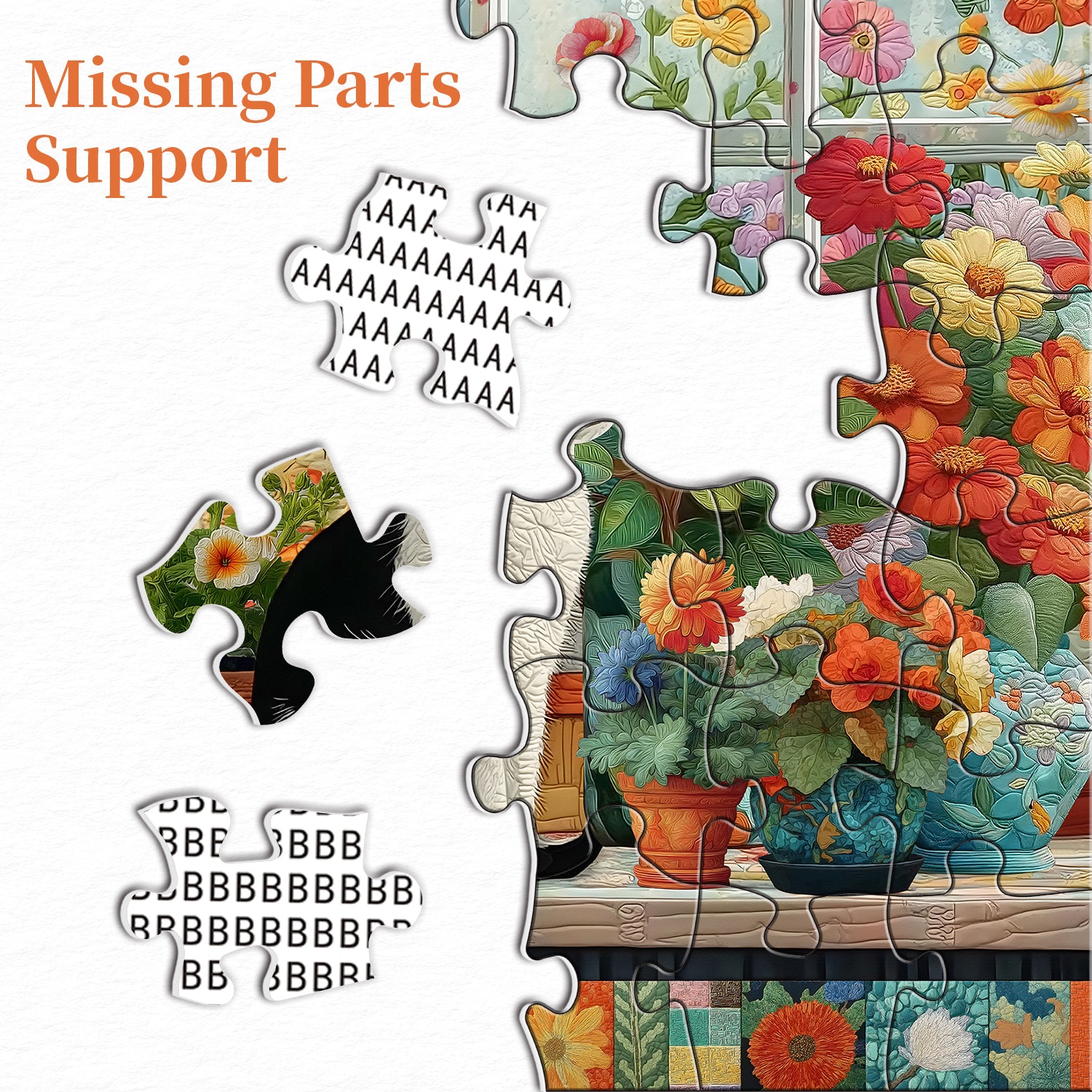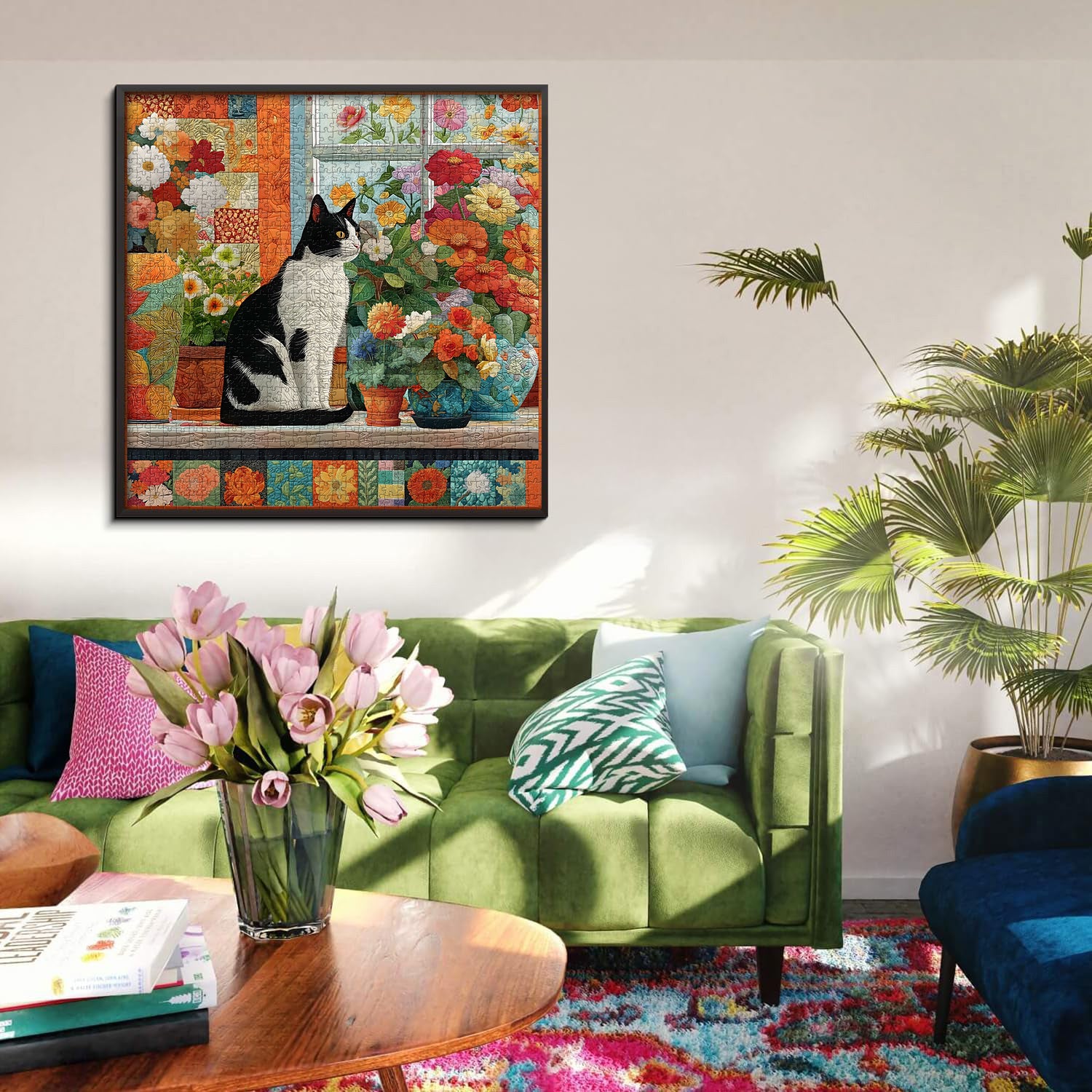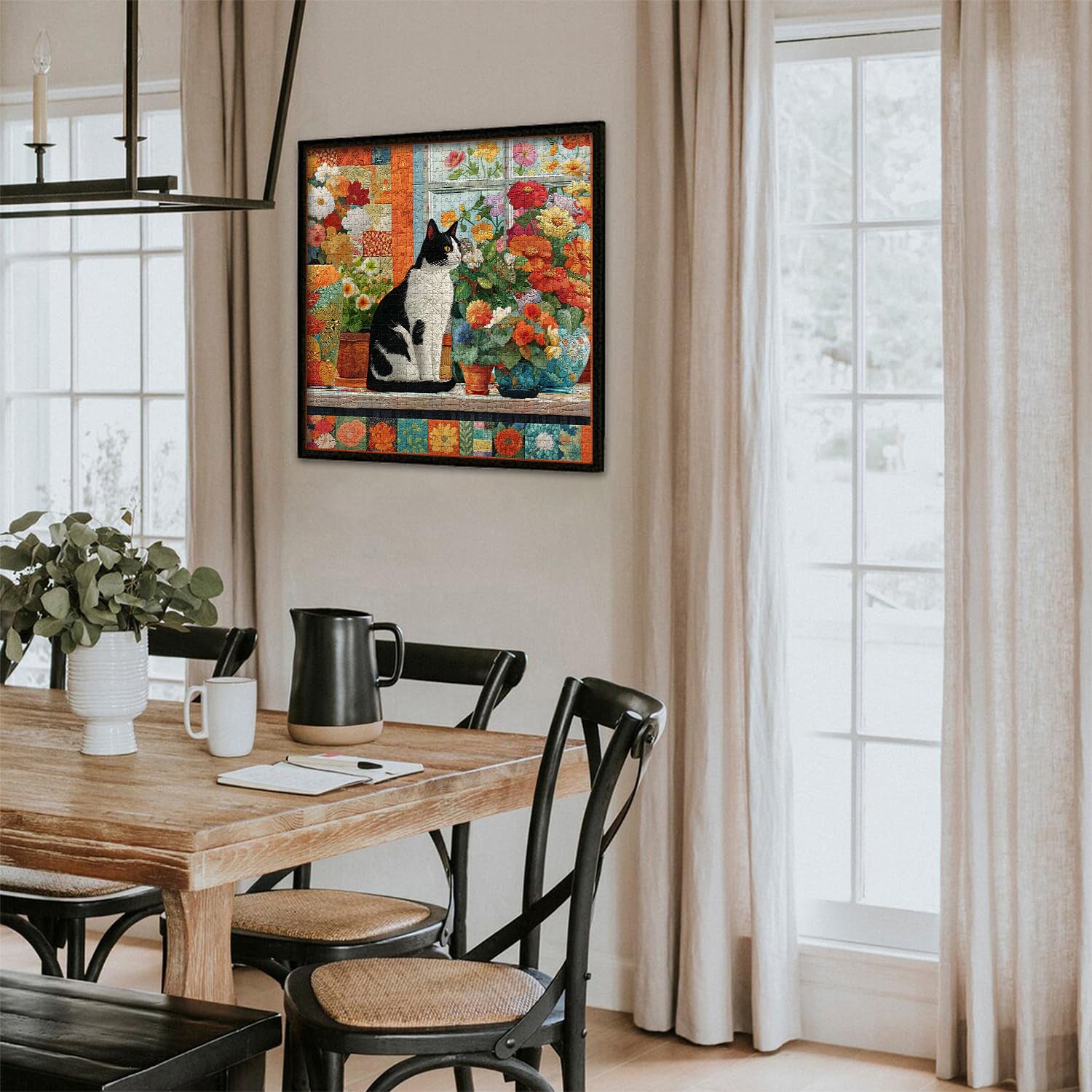😺Quilted Cat: This puzzle depicts a black and white cat sitting in front of a flower-filled window. The handmade patchwork-like color blocks adorn the wall, creating a vibrant and elegant effect. Each piece is a fragment of art, and once completed, it resembles a delicate oil painting, immersing you in a tranquil and poetic atmosphere.