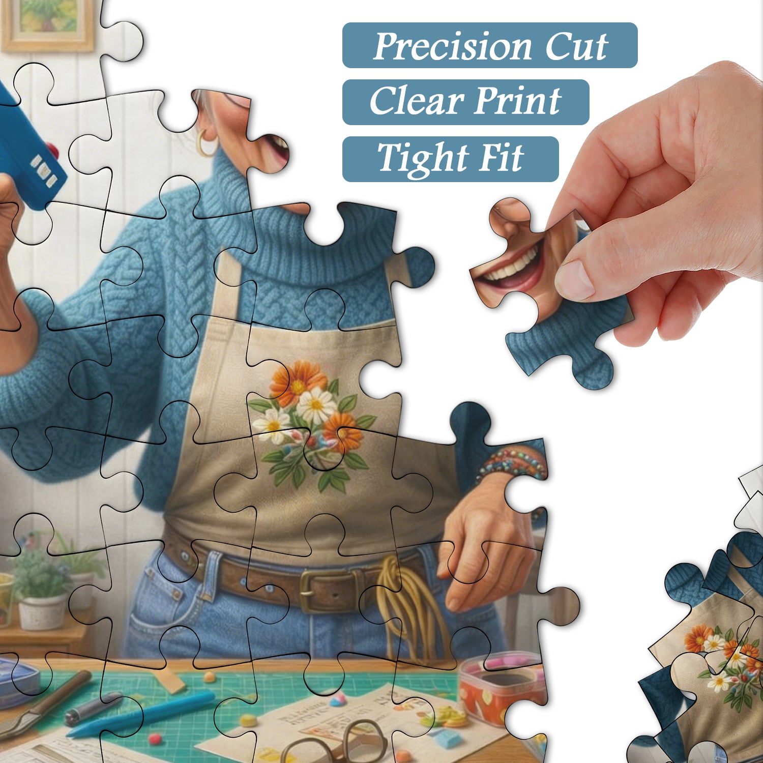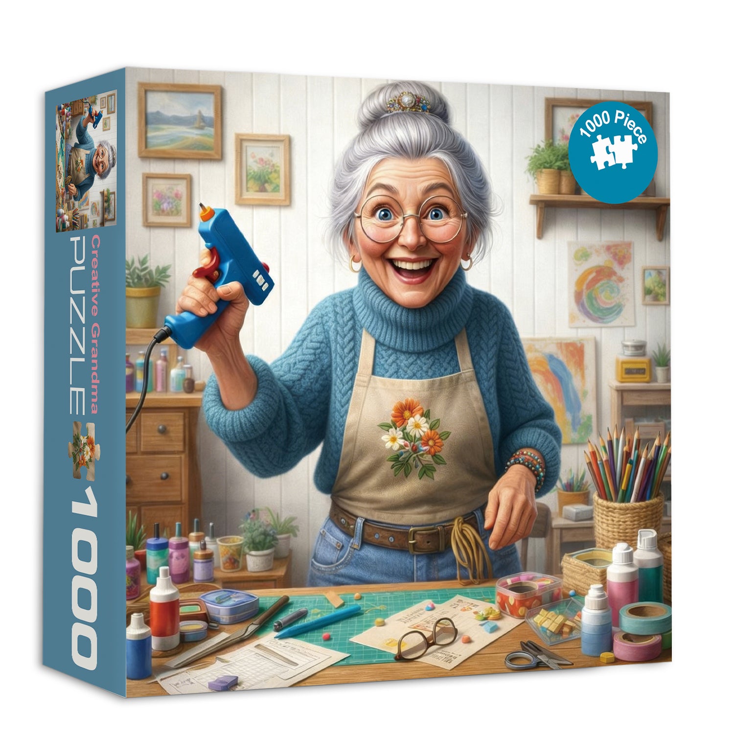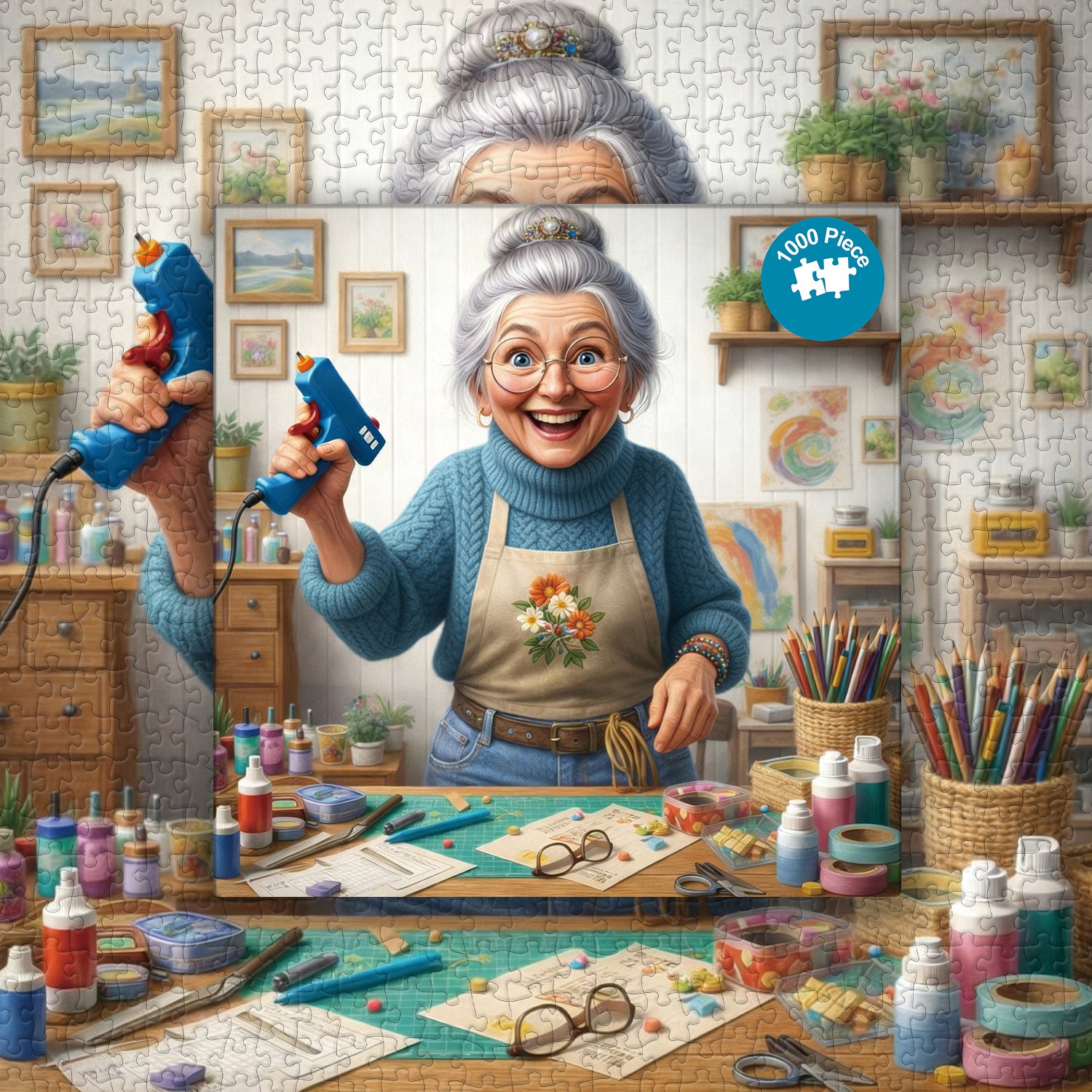 👵🎨【Creative Grandma Jigsaw Puzzle】This puzzle brings a vibrant craft workshop to life—a silver-haired grandmother wearing glasses, holding a hot glue gun, her smile as bright as a child's, surrounded by paints, brushes, scissors, and various craft materials. Building it feels like stepping into a perpetually enthusiastic studio, each piece embodying the joy and warmth of creation.🧵🌈