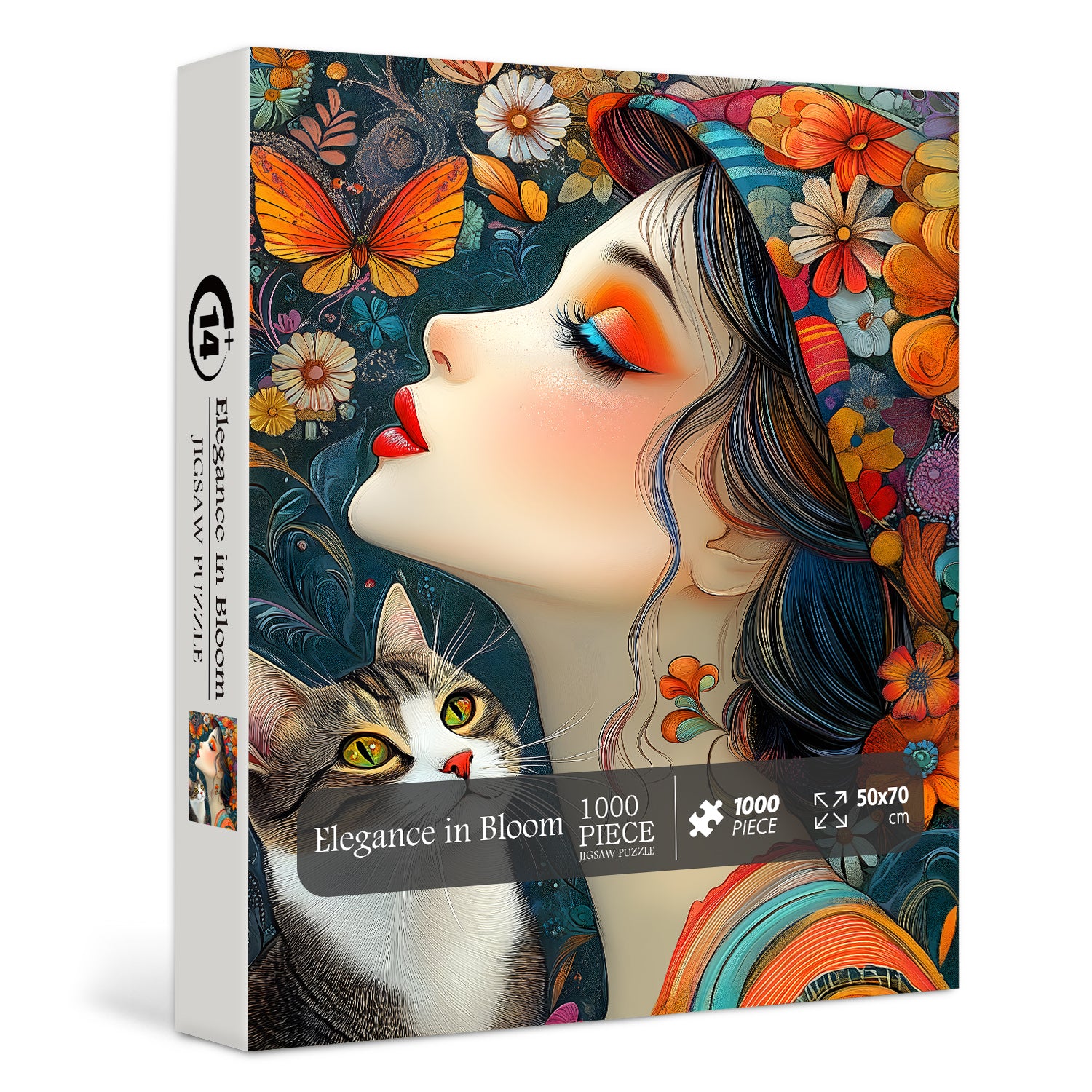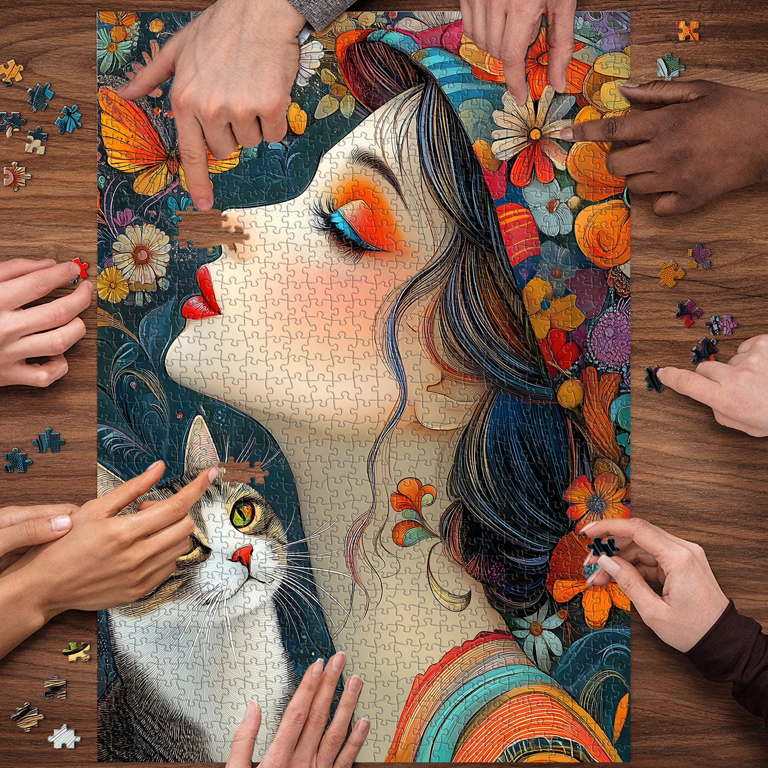 👩🐱【Elegance in BloomThis Bohemian girl and tabby cat puzzle is presented in a bold hand-drawn style: the girl, looking up in profile, has vibrant makeup, with striking orange-red eyeshadow and fiery red lips, her dark blue curly hair entwined with colorful wildflowers and a striped headscarf; beside her, a white tabby cat gazes upwards with open green eyes, against a deep blue background of blooming flowers and fluttering butterflies—the high-saturation color contrast exudes a free and wild Bohemian vibe.🌼💖