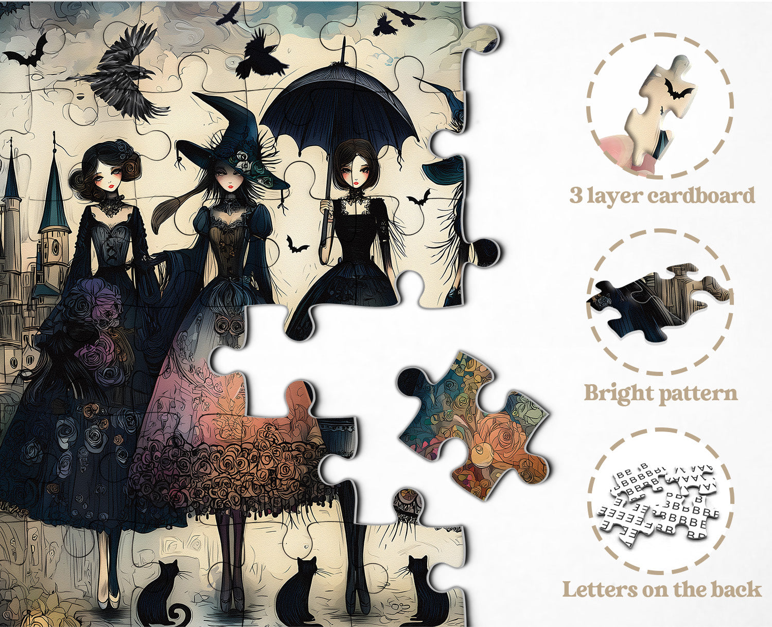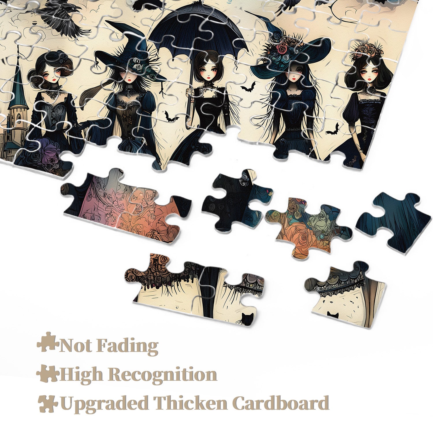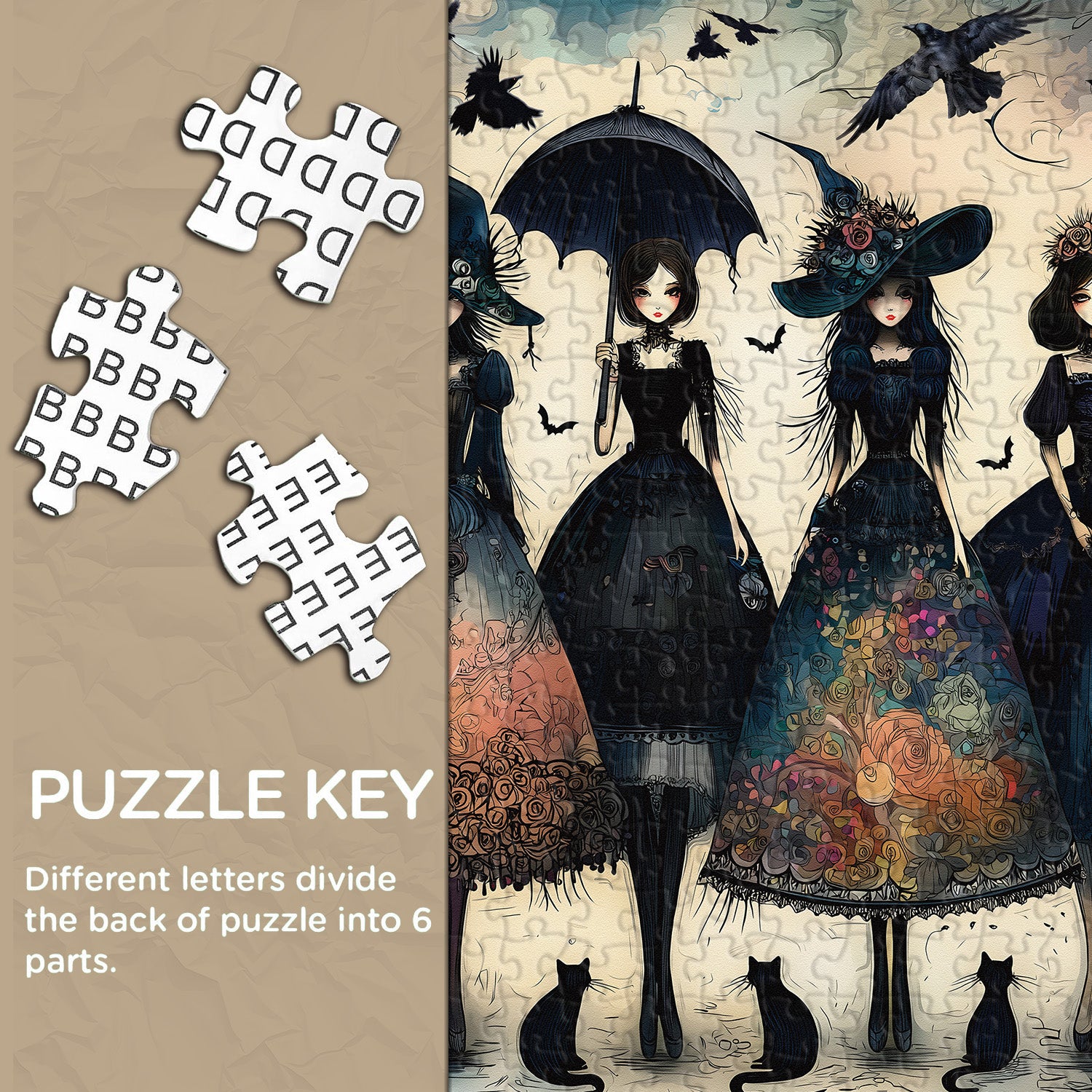 🧙🐈Raven Night Girls: This puzzle centers on a group of gothic witches in elaborate costumes, their enigmatic aura captivating. Each garment is presented with unique colors and patterns, ranging from deep blue to dark red, making them highly distinctive. A black cat accompanies each witch's feet, adding a touch of mystery and whimsy, evoking a magical world.🐦🏘️
