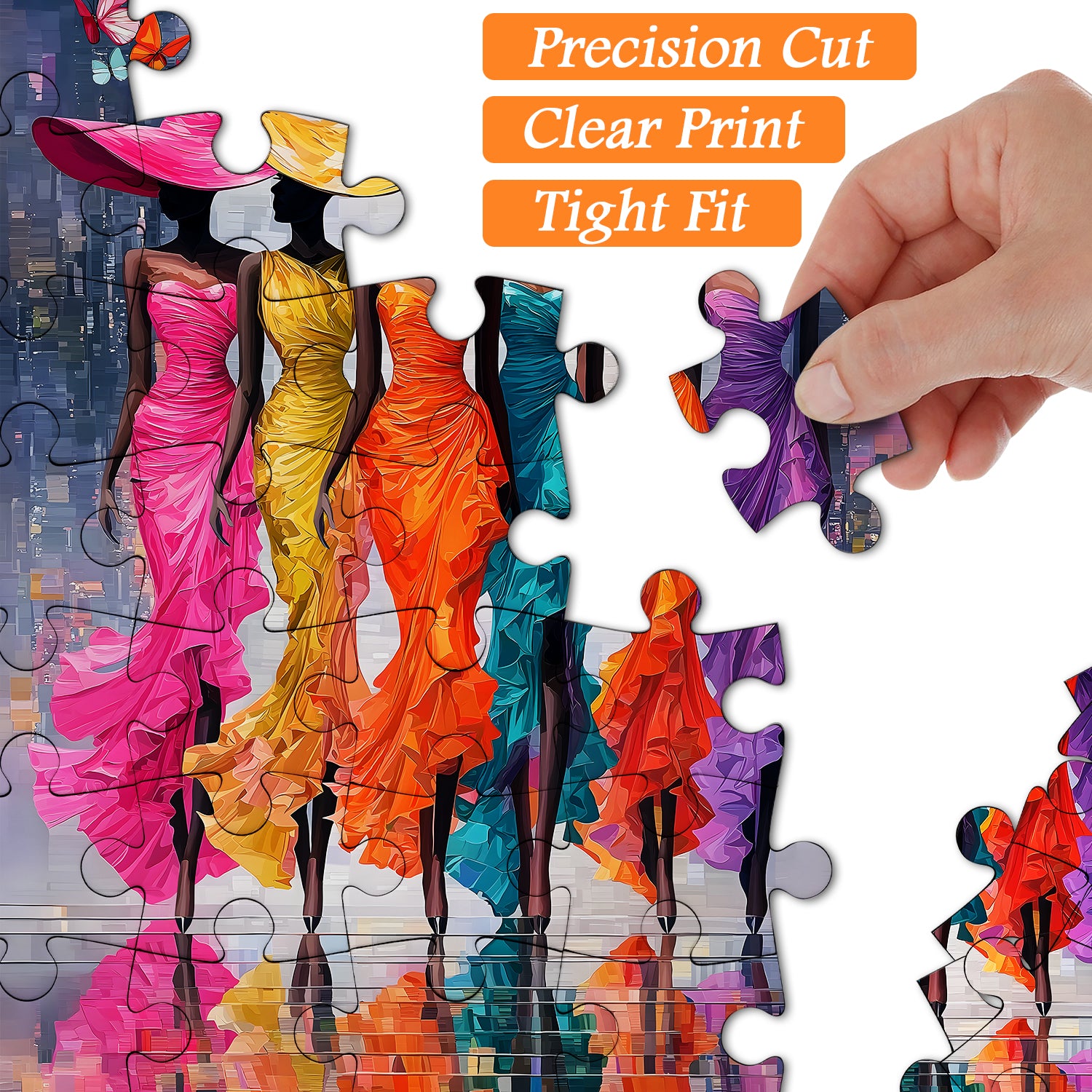 💃🦋【Butterfly and Muse】This puzzle features six dancers in vibrant, long gowns, their silhouettes appearing exceptionally elegant and mysterious under the lights. The dancers' skirts are predominantly pink, yellow, orange, blue, and purple, each a flowing feast of color.🌺🌈