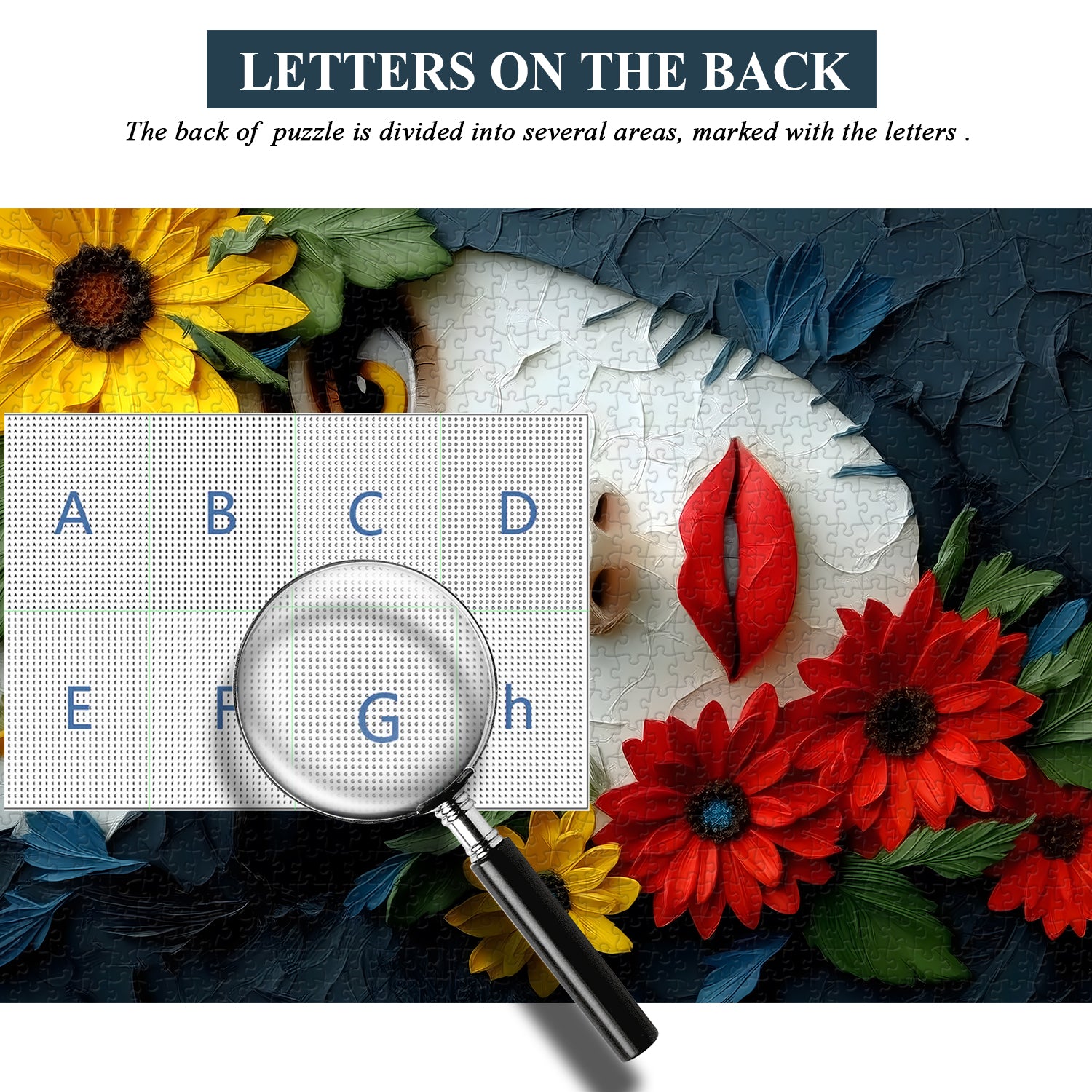 👩🌺Colorful Flower Woman: This puzzle presents a pattern of a woman's face intertwined with natural flowers, mysterious and captivating, as if telling an unfinished story. The woman's red lips contrast sharply with the yellow and red flowers, while the deep blue background adds harmony and tranquility to the overall effect.