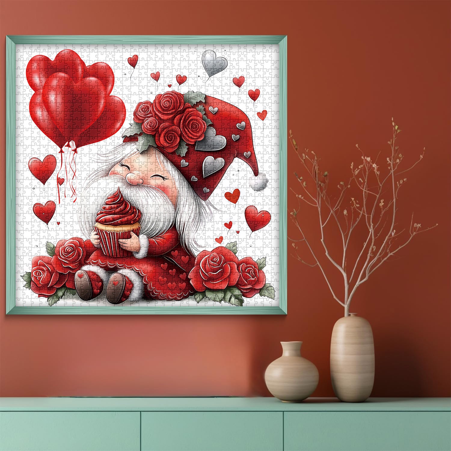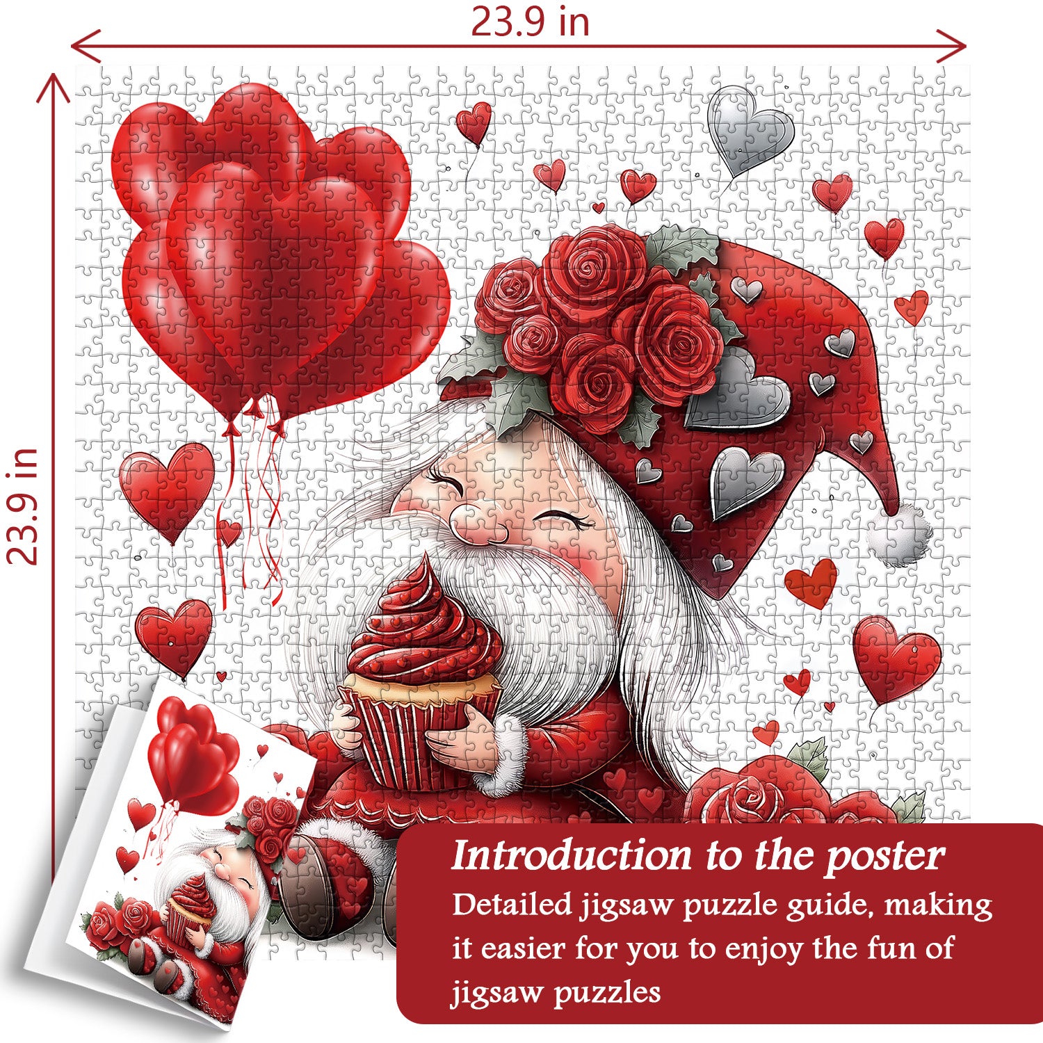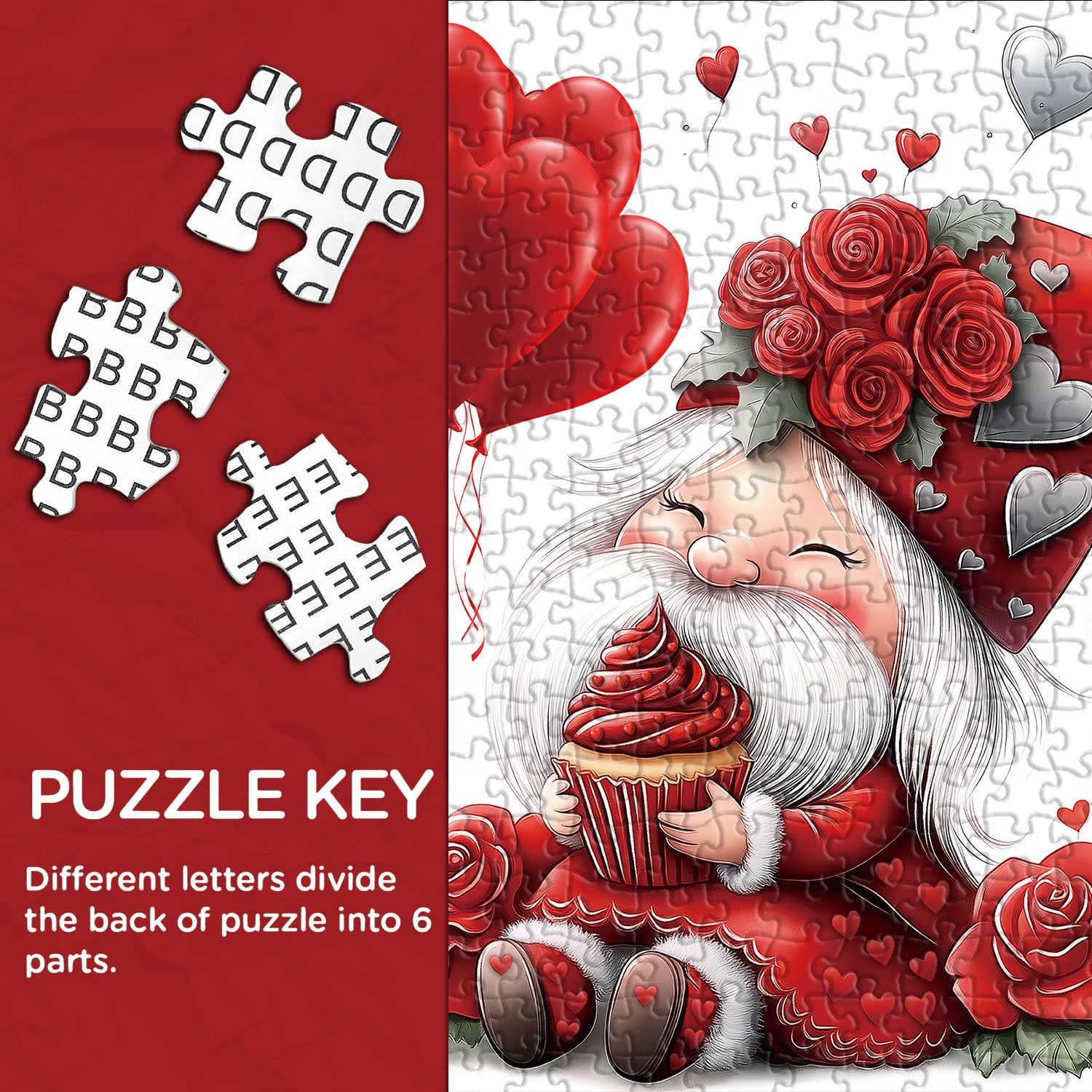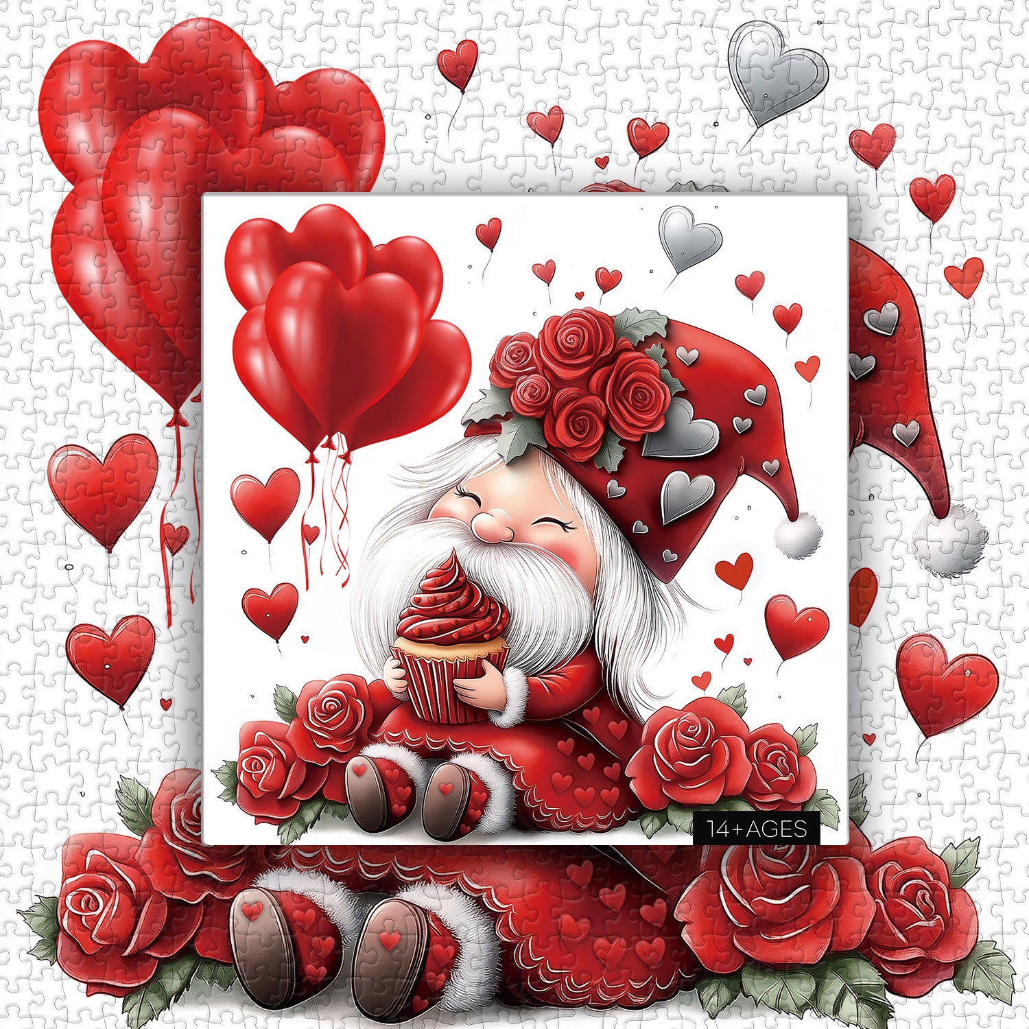 🧙🍰【Valentine Gnome】🌹This puzzle features a dwarf lost in a dessert dream, clutching a tempting red velvet cupcake and beaming with a satisfied smile. Surrounded by vibrant red roses, each symbolizing romance and love, the dwarf adds warmth and sweetness to the scene.🎈💕