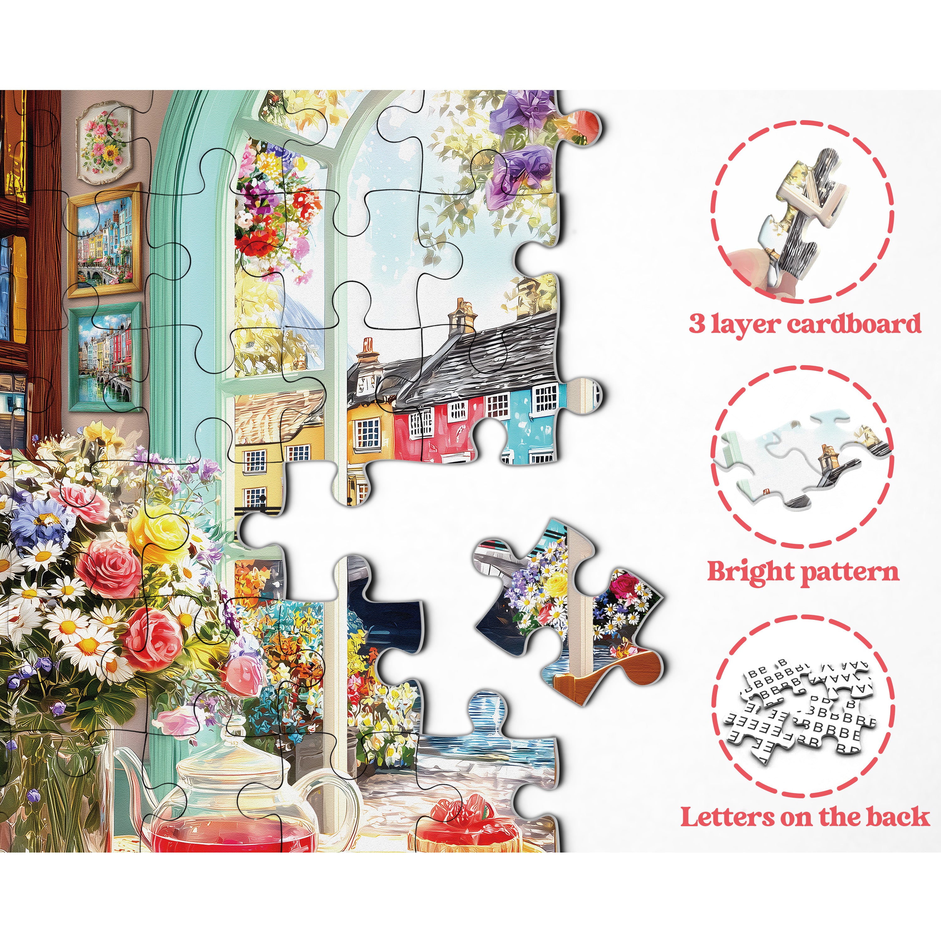 💐🏡【Teatime Canal CottageThis jigsaw puzzle perfectly blends the poetry of an English town with a cozy afternoon tea: through mint green arched windows, you can see colorful terraced houses, canals, and small bridges; inside, there's a table laden with flowers, vintage bookshelves, and stained-glass chandeliers, along with steaming fruit tea, desserts, and hand-painted books.🍰🌈