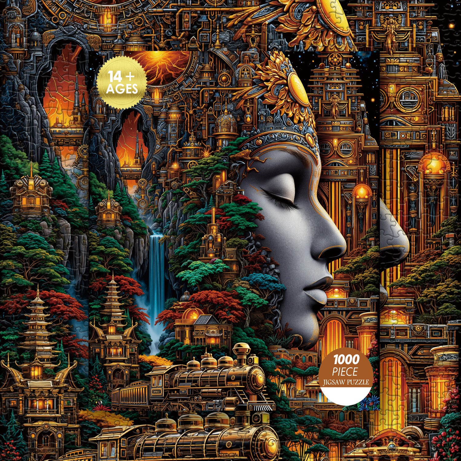 🧘🚂【Dreamscape CityThis is a steampunk dream city jigsaw puzzle—a giant female head, adorned with a mechanical crown, sleeps peacefully in the center of the image. A stargate burns with orange-red energy, a Gothic clock tower stands side-by-side with an oriental tower, and steam pipes wind around the eaves and brackets. At the bottom, a retro locomotive trails golden light as it heads into the depths. Once completed, it's like possessing a spiritual sanctuary and an adventure park; Buddha sleeps within the gears, and your gaze is the incantation to awaken him.🏛️🌲