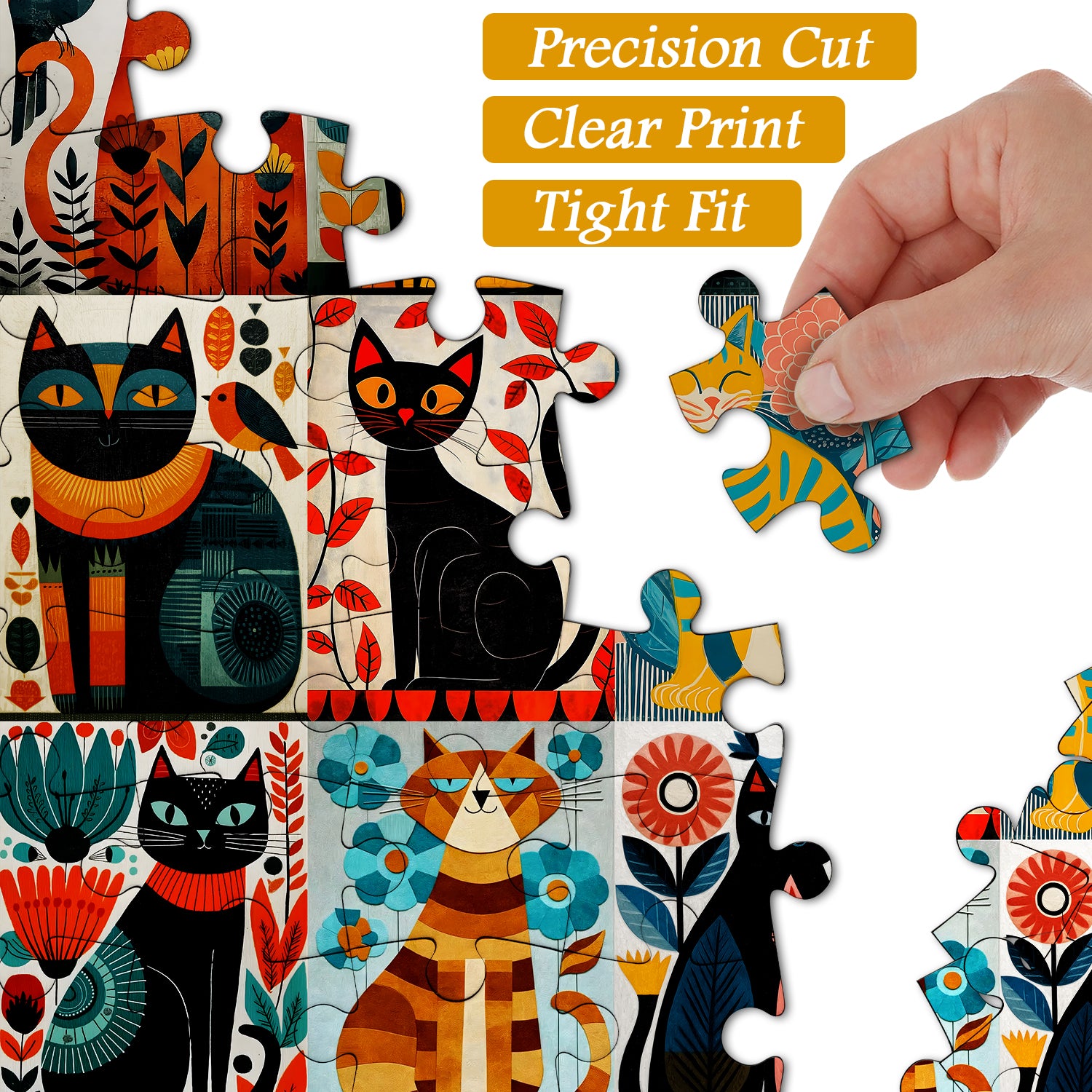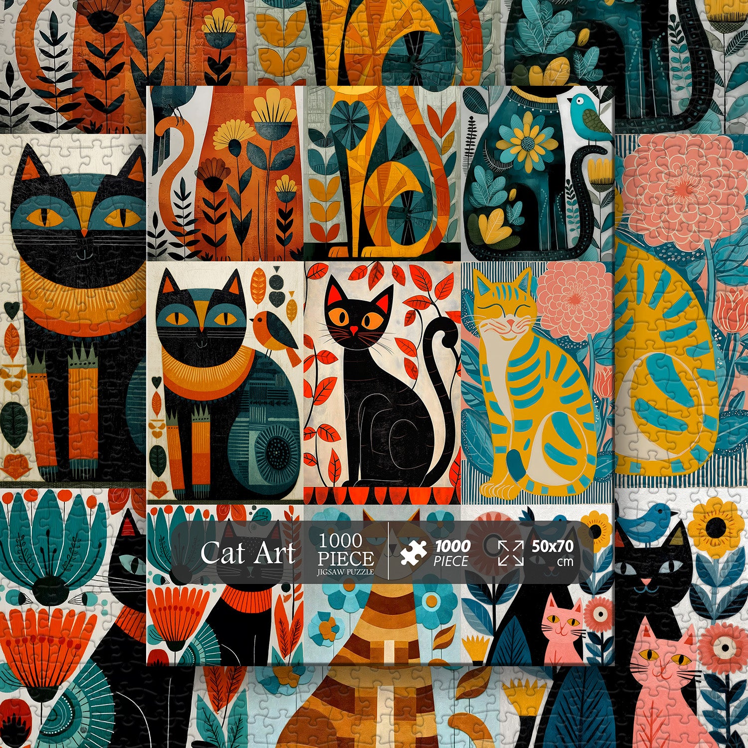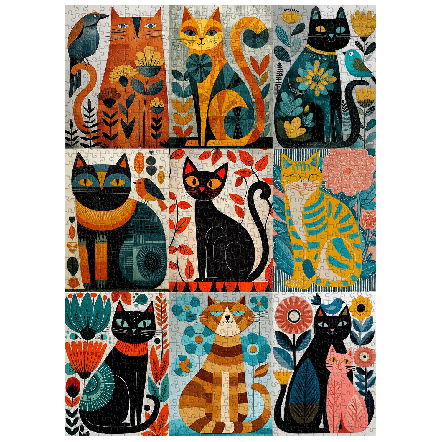 🐱🎨【KatzenkunstDies ist ein Katzenpuzzle im Retro-Kunststil – neun geometrisch gemusterte Katzen sind in karamellorangen und pfauenblauen Farbblöcken versteckt, jede mit blühenden Blumen auf ihrem Körper. Sobald es fertig ist, ähnelt es einem mittelalterlichen Druck, der an der Wand hängt.🌿🔷