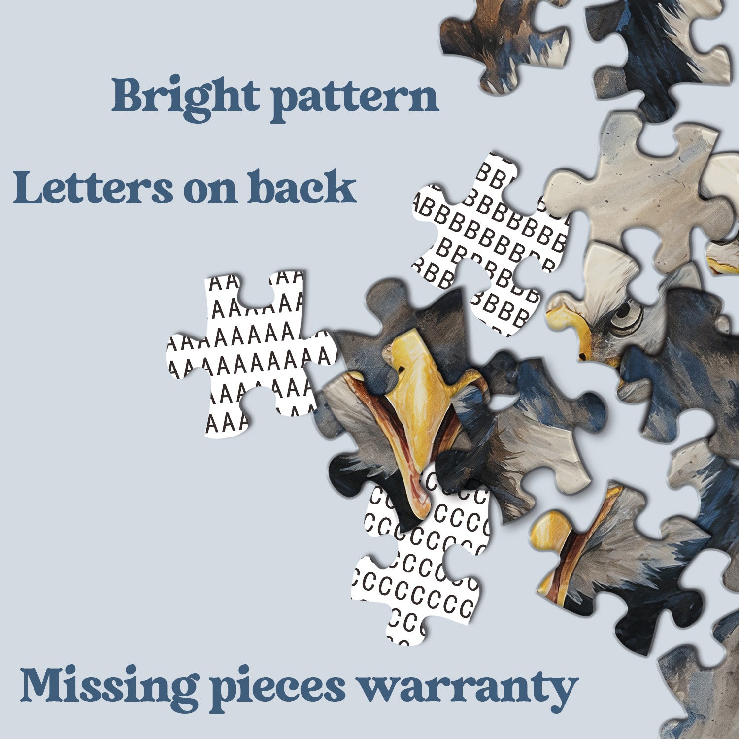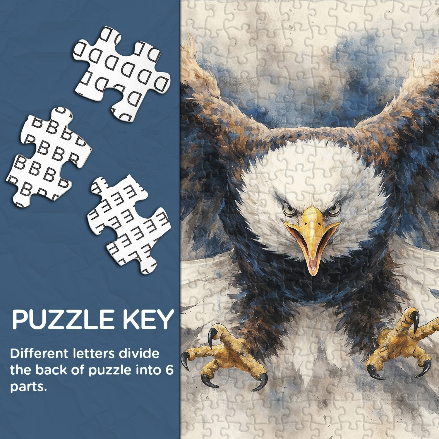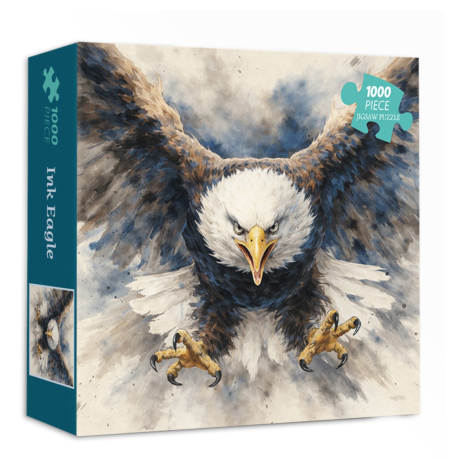 🦅🌿Tintenadler: Im Mittelpunkt dieses Puzzles steht ein hochfliegender Adler, dessen scharfe Augen und mächtige Flügel Freiheit und Stärke symbolisieren. Die überwiegend schwarzen und weißen Federn des Adlers kontrastieren stark mit dem blassblauen Hintergrund und machen jedes Stück zu einer Farbexpedition.🌲🖼️