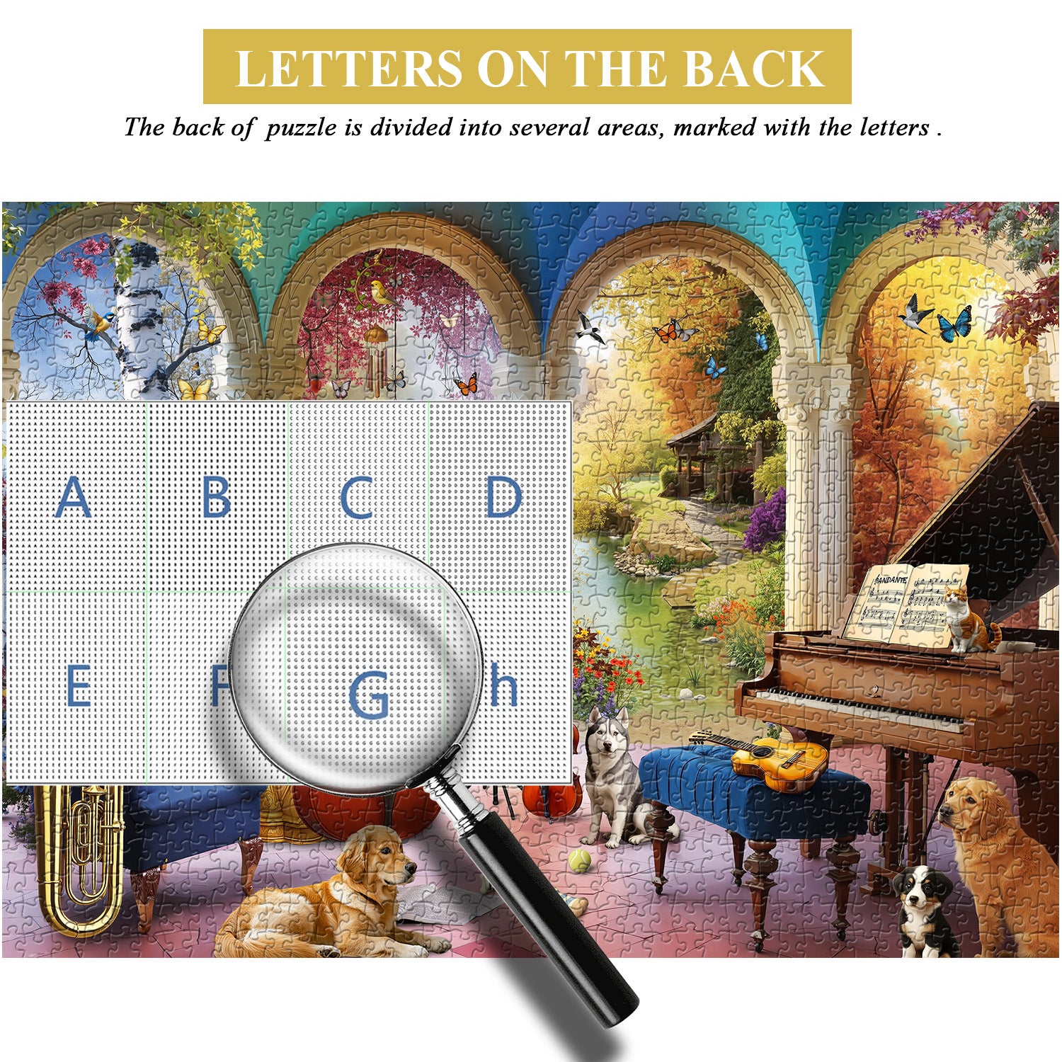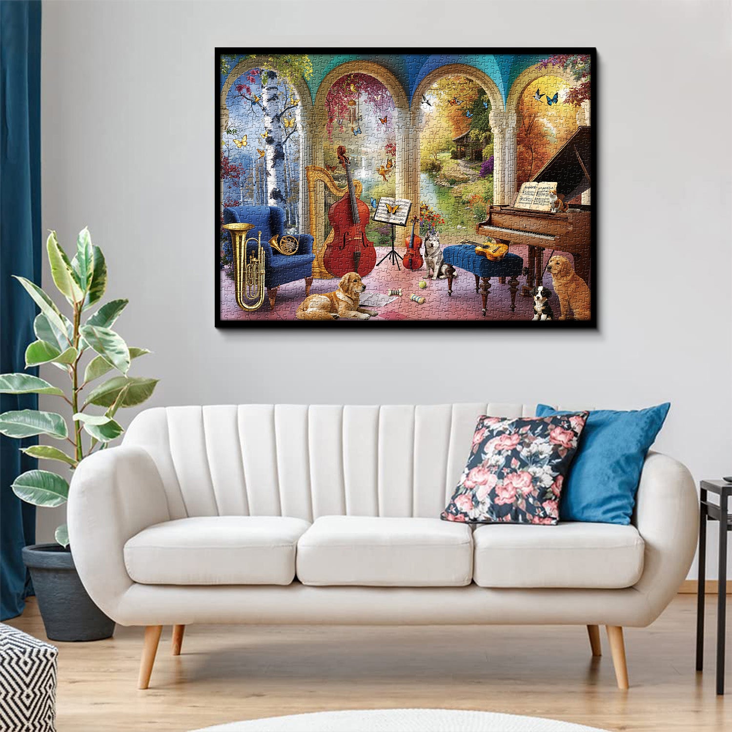 🎻🌸Seasons Chamber Jigsaw Puzzle:This puzzle transports you to a temple filled with music and natural beauty. Various musical instruments are quietly arranged in a beautifully decorated interior, awaiting the arrival of performers. Through arched windows, the changing seasons unfold outside, everything brimming with life. An elegant piano stands quietly, while several adorable dogs sit on the floor, becoming devoted listeners to the concert.🎹🎼🐶