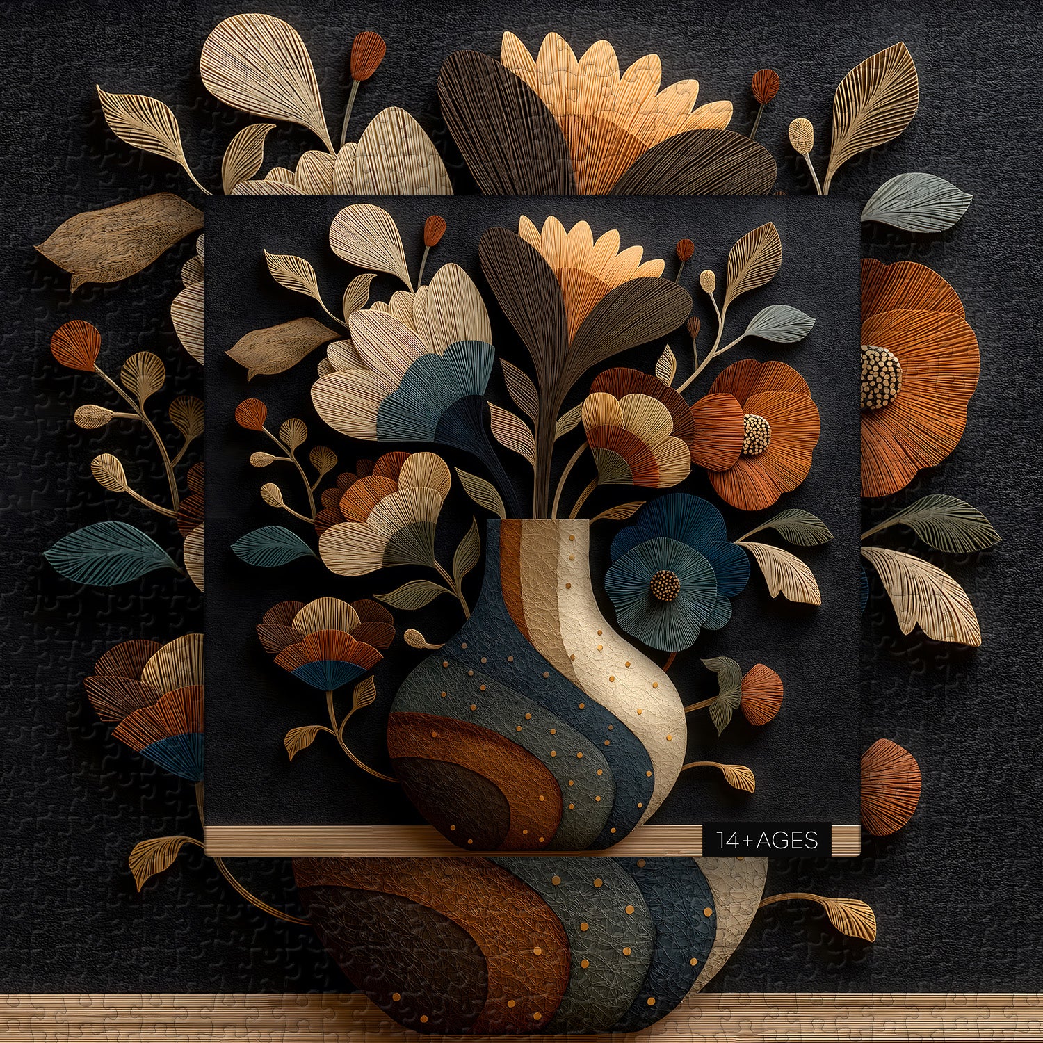 🌼️🌈【Paper VaseThis puzzle centers on a beautiful bouquet of flowers. The floral and foliage patterns are presented in a brocade style, with distinct color layers and clear textures, showcasing a unique artistic quality. From warm browns to deep blues and soft beiges, the color scheme of this puzzle is rich and harmonious, offering a visual feast.💐🌺
