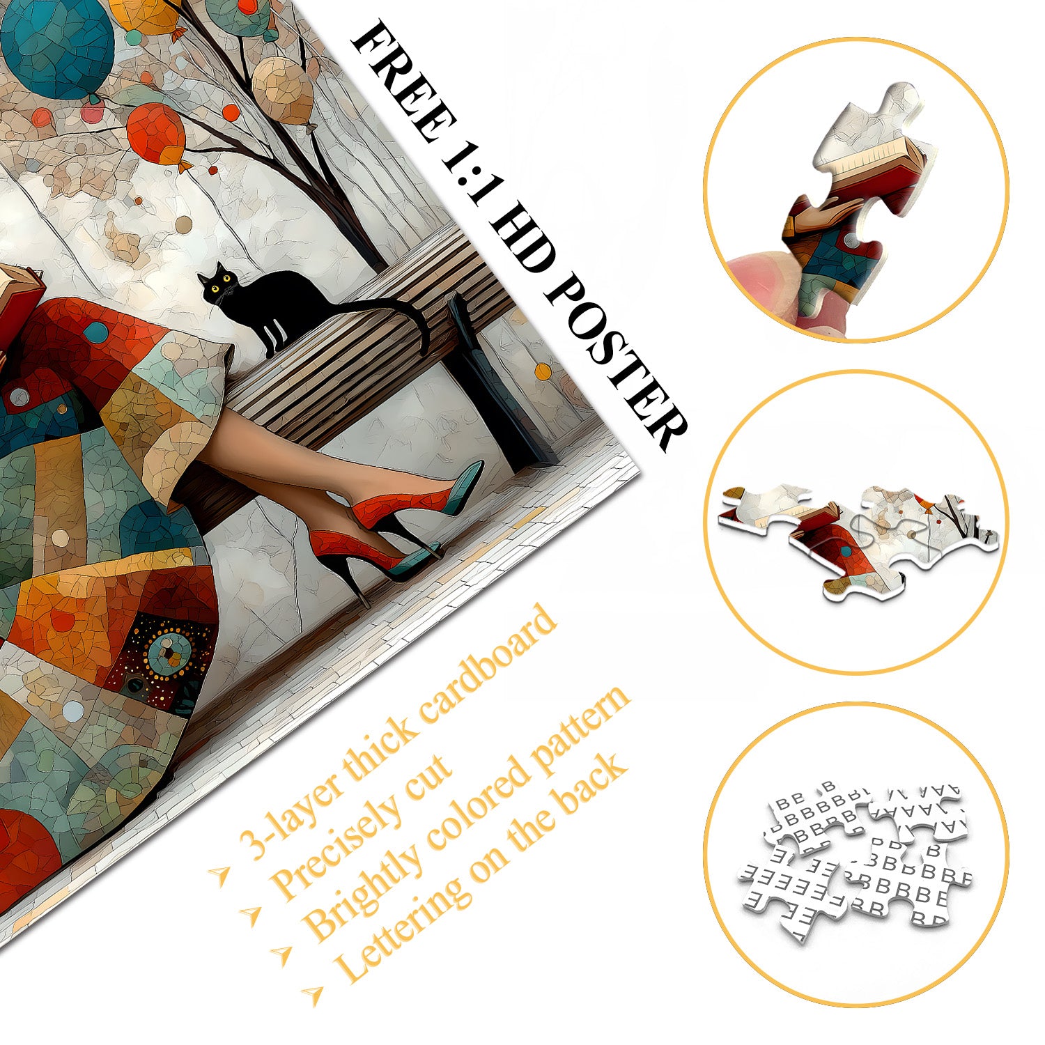 👩👒Tiempo de lectura tranquila: Este rompecabezas representa a una mujer retro con un vestido geométrico de bloques de colores y un sombrero floral de ala ancha, leyendo atentamente, con sus tacones rojos elegantemente apilados. Está sentada con gracia en un banco del parque leyendo. Globos de colores cuelgan de forma realista de las ramitas del fondo, mientras un gato negro con brillantes ojos amarillos la cuida en el otro extremo del banco. Las piezas de mosaico crean un momento de soledad en la ciudad, parecido a un cuento de hadas.🐱📚