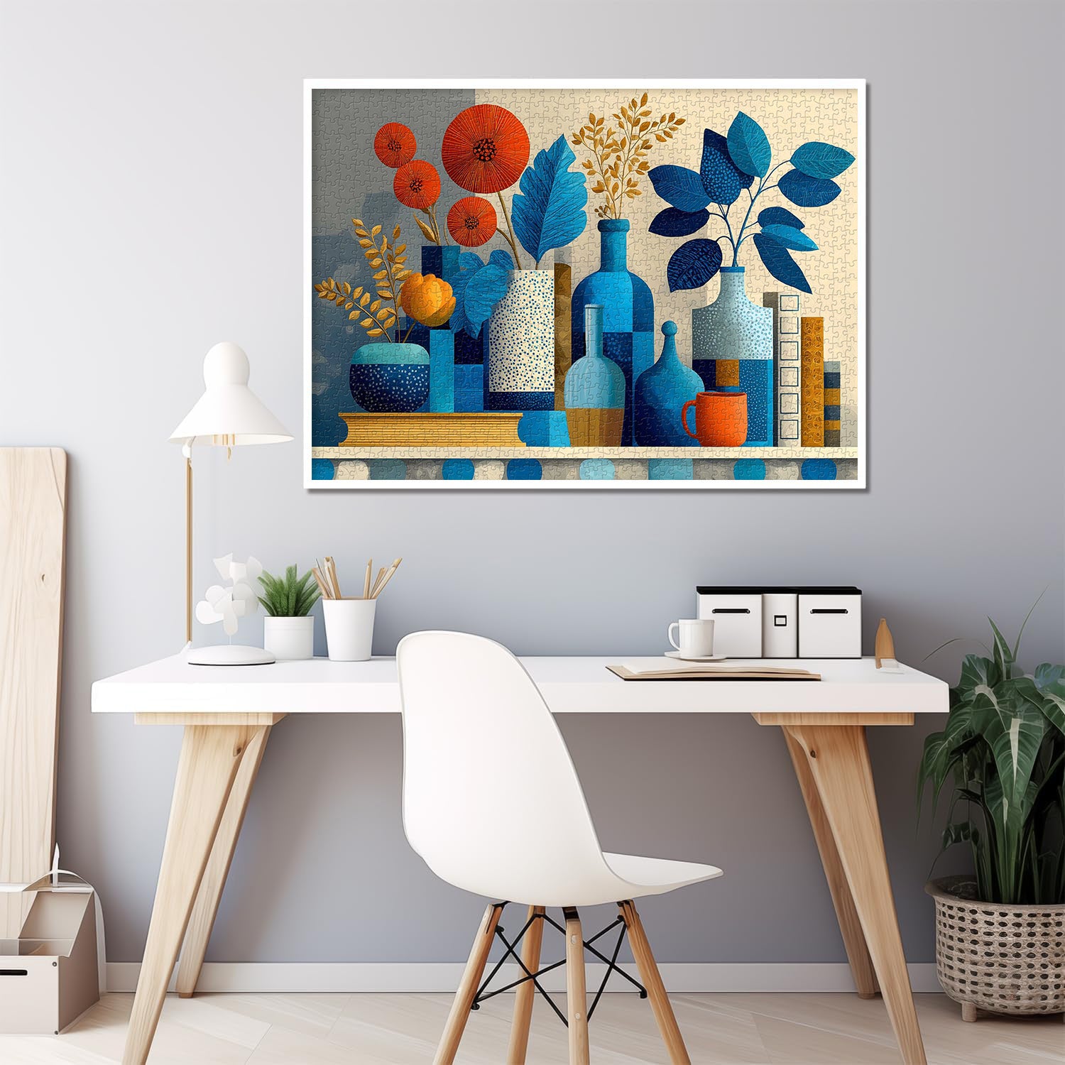 🏺🌈【Variations in Blue 】This puzzle features a vibrant collection of vases and flowers. Each piece is a small painting, creating a vivid work of modern art. From classic blue to warm orange to pristine white, each vase has its own unique design and texture, showcasing a unique style and charm.💐
