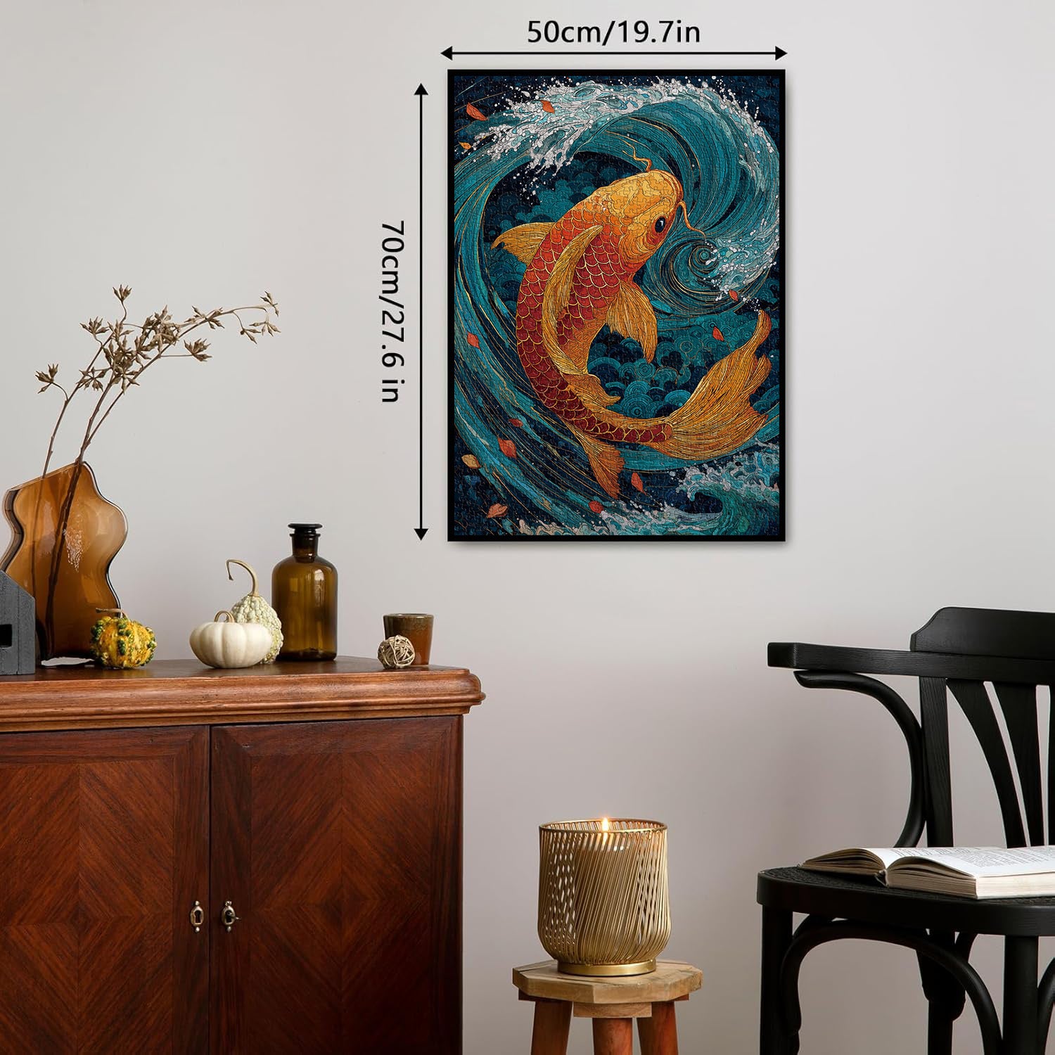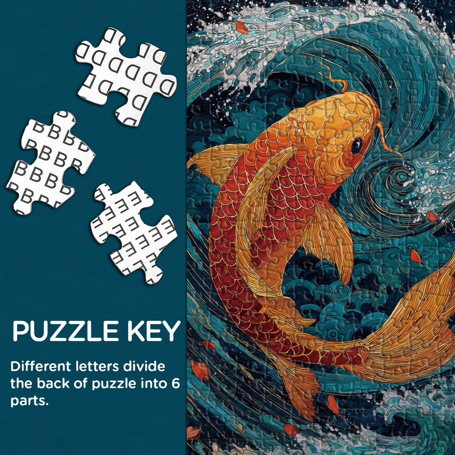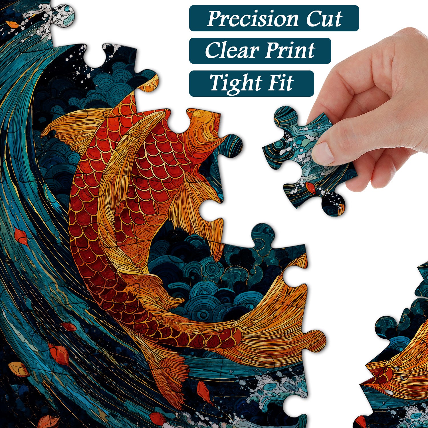 【Koi Wave】This puzzle centers on a vibrant koi carp leaping through the waves, full of life and energy. The koi's scales display rich orange and gold hues, contrasting sharply with the surrounding water and drawing the eye.