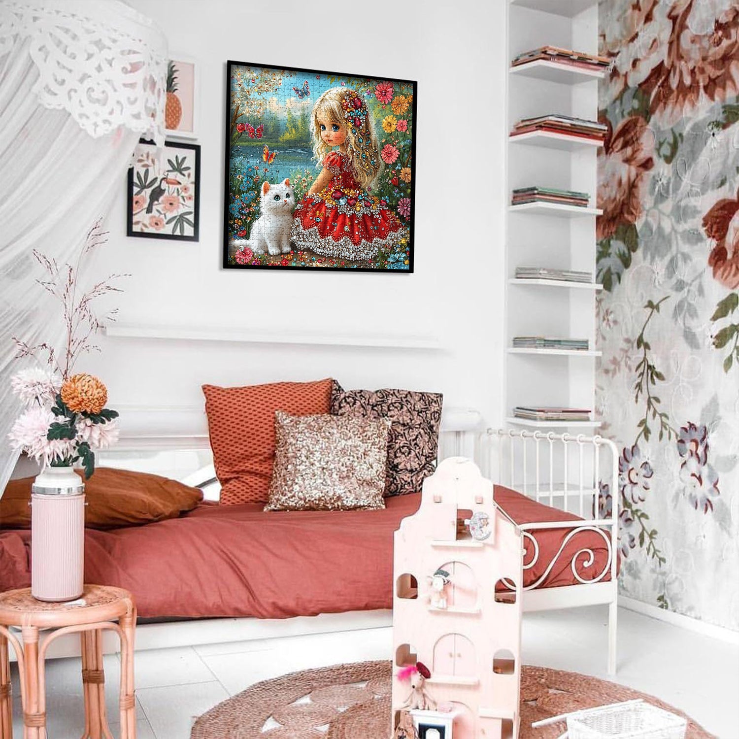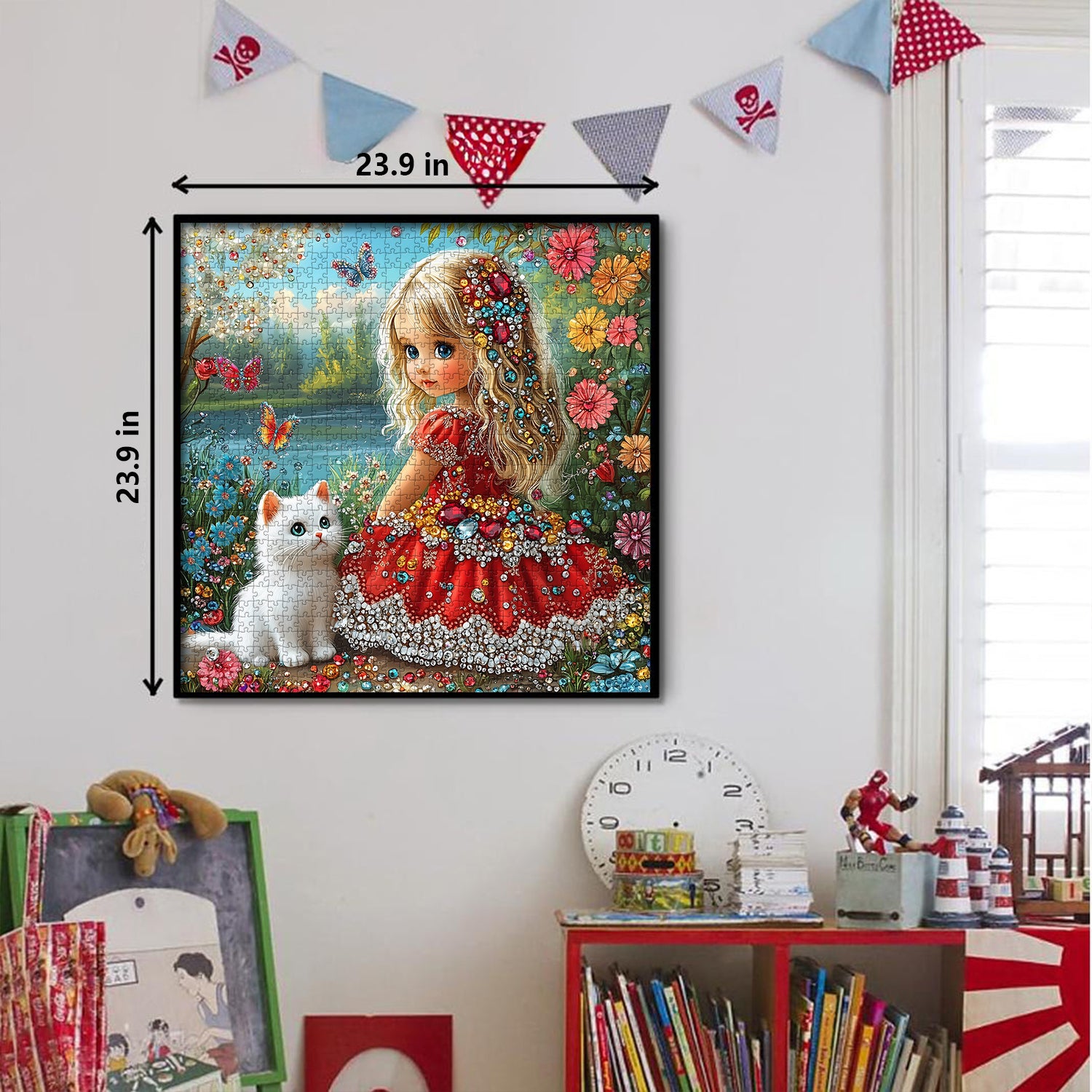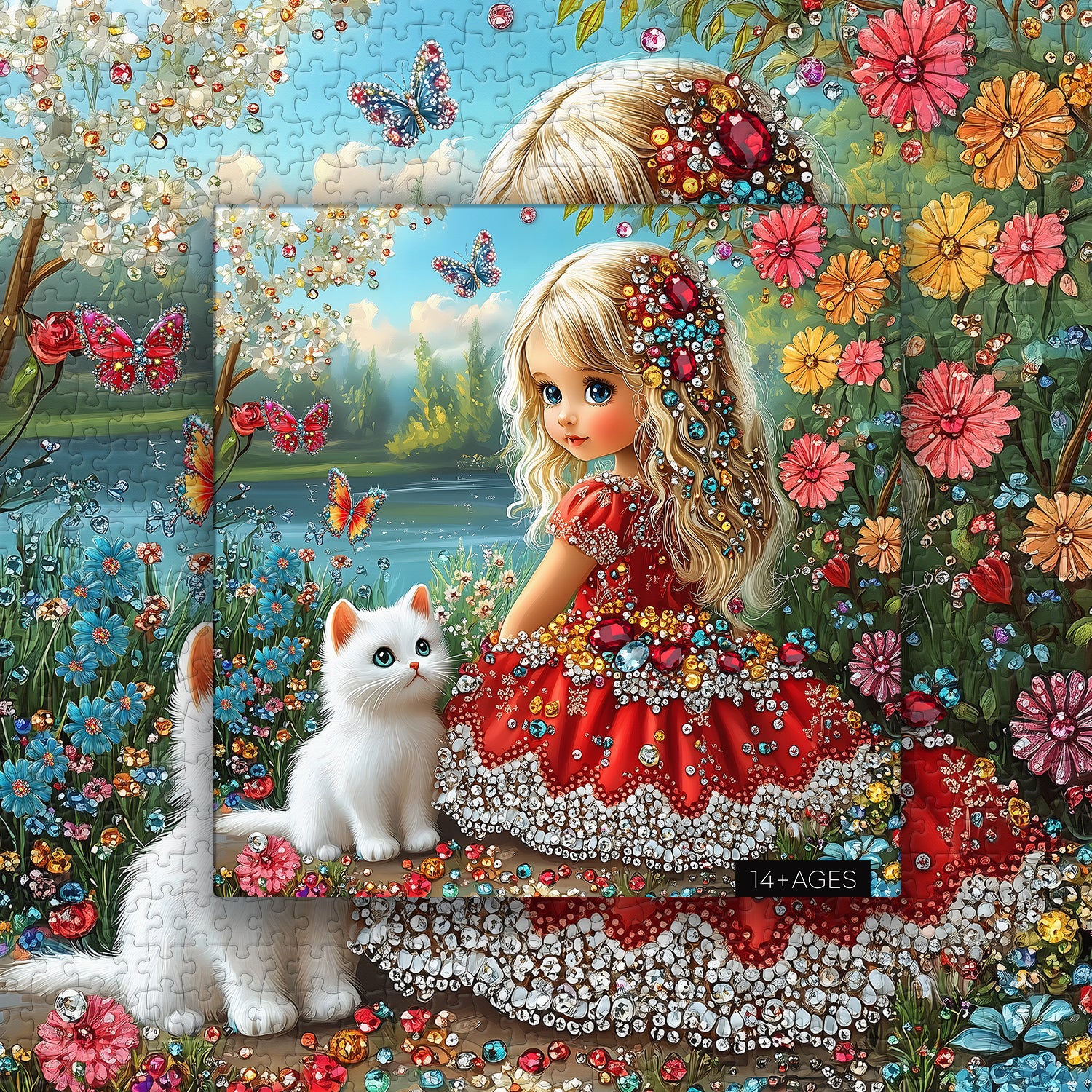 👧🐈【Gemstone Girl】This puzzle features a fairytale girl and her white cat. Dressed in a red dress adorned with gemstones and a garland of flowers, she looks like she's stepped straight out of a storybook. A charming white cat accompanies her, its eyes sparkling with curiosity and wit, adding a touch of warmth and playfulness to the scene.🌼