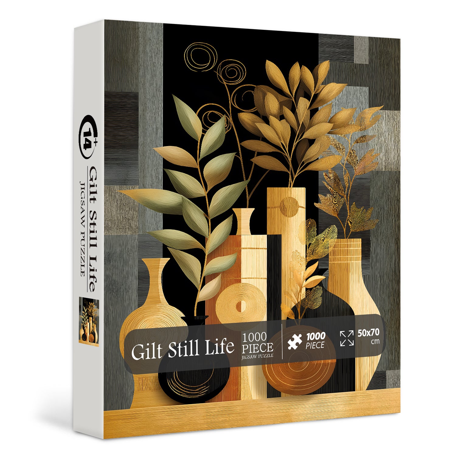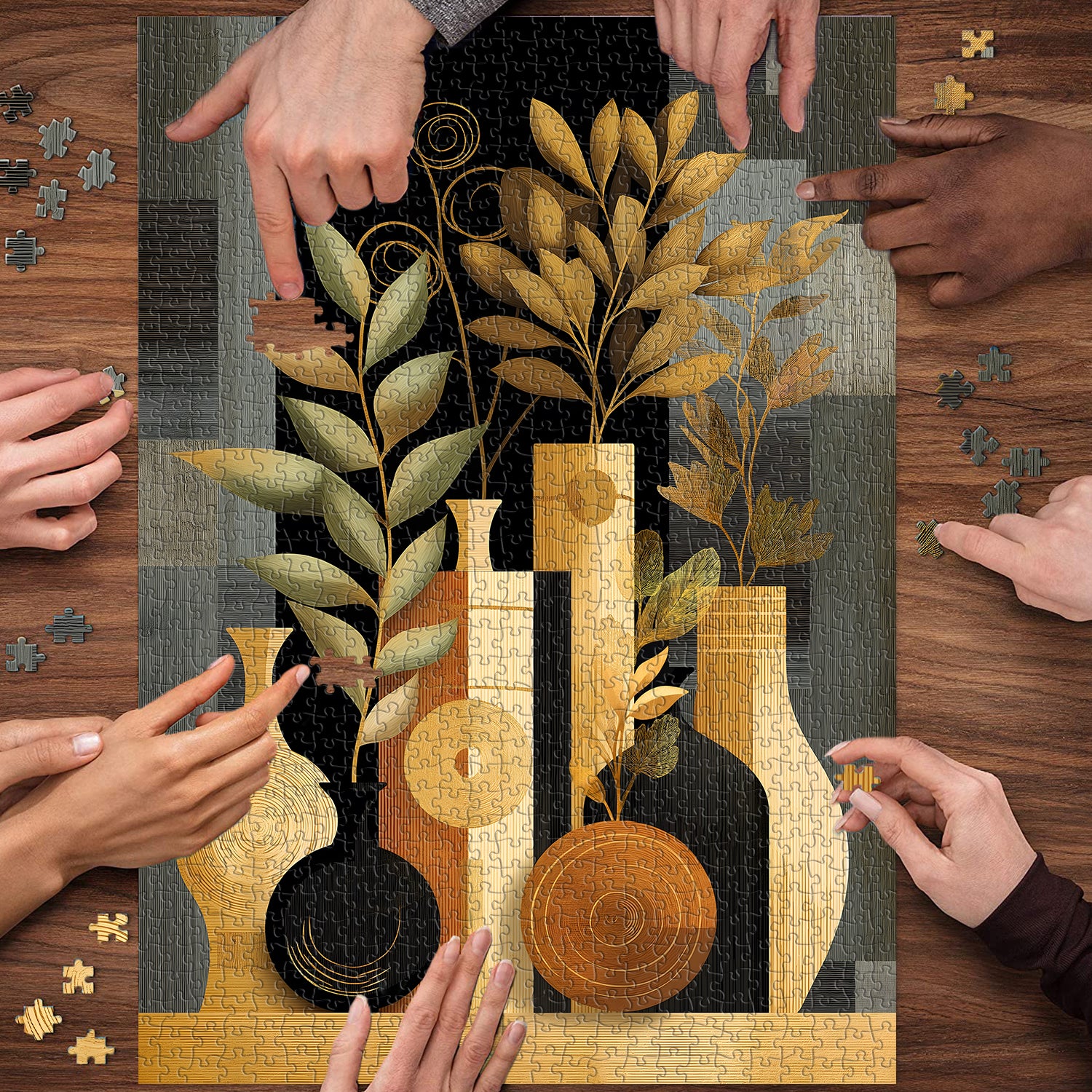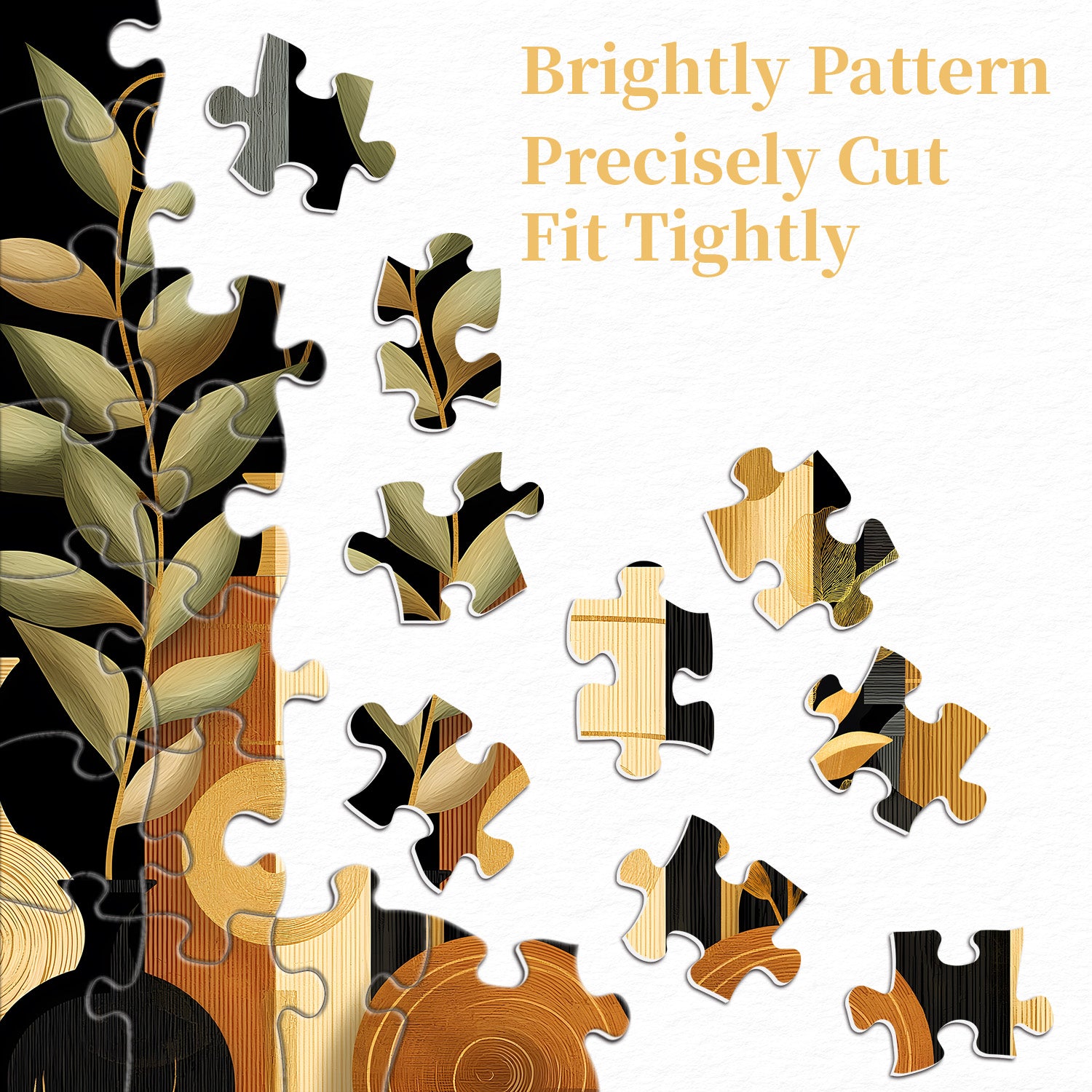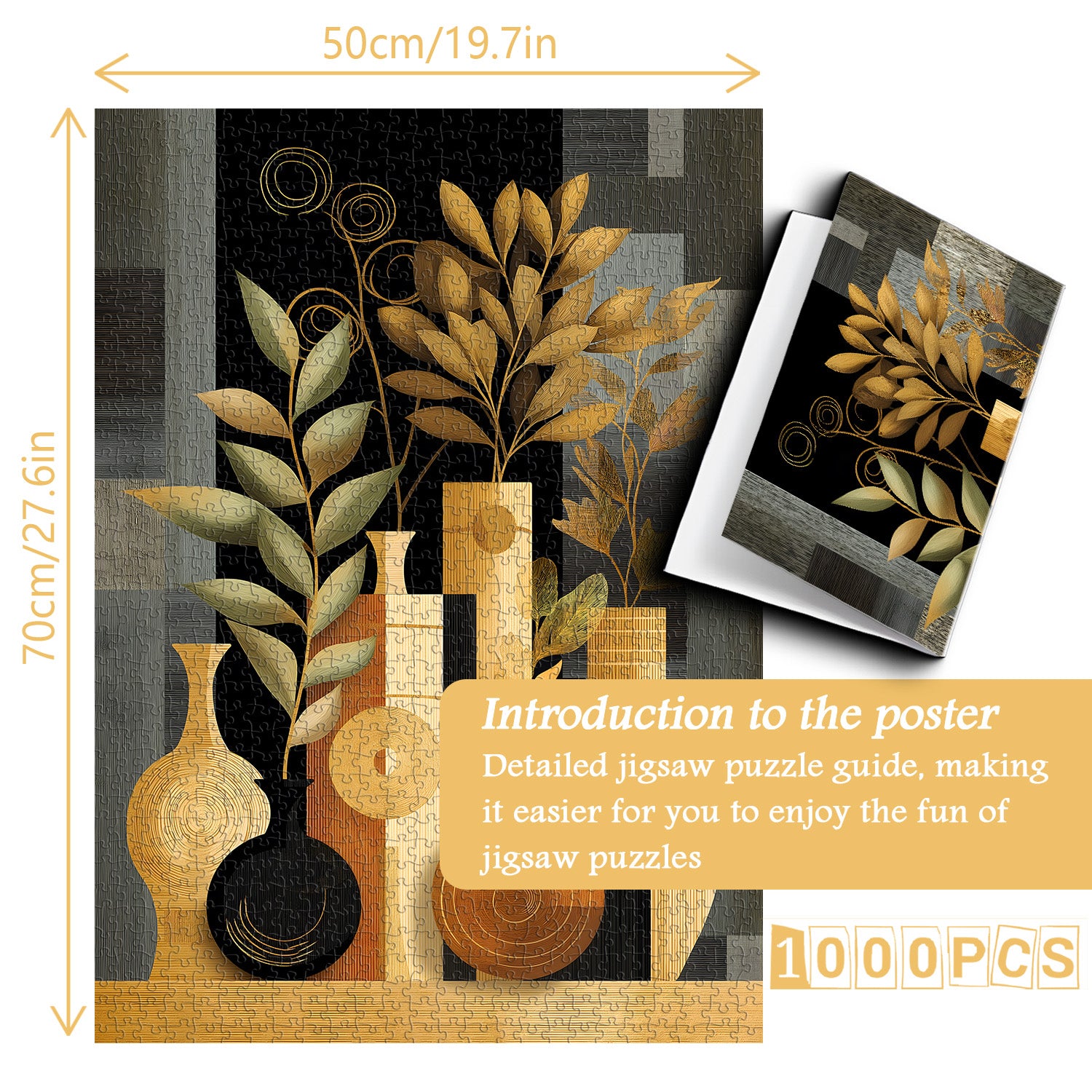 🌼🌿【Bodegón dorado Este rompecabezas presenta un estilo de arte abstracto, combinando jarrones tradicionales con elementos de diseño moderno para crear un efecto visual único. Los jarrones y plantas se presentan en tonos suaves, contrastando con el fondo más oscuro para crear armonía y equilibrio.🎨🌈
