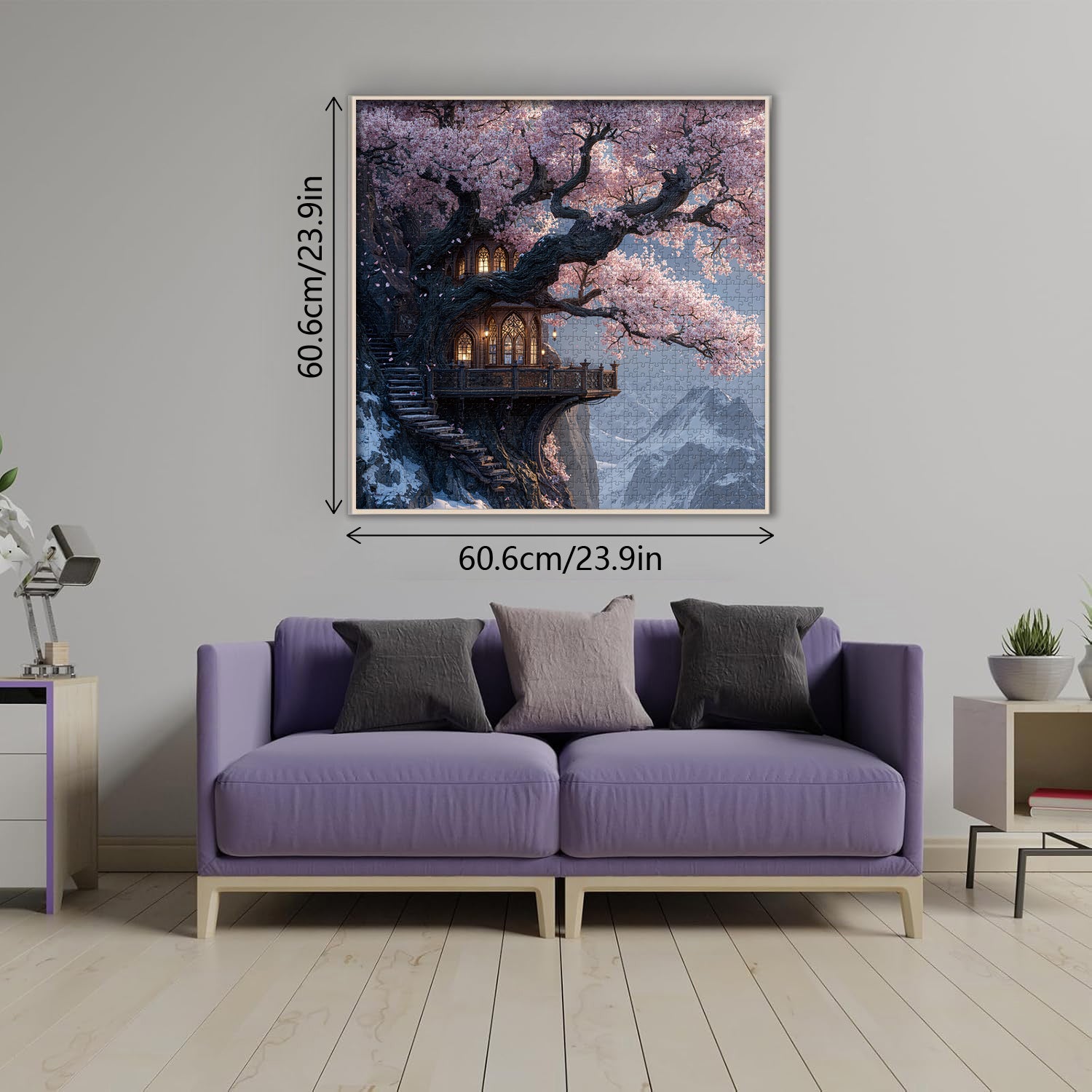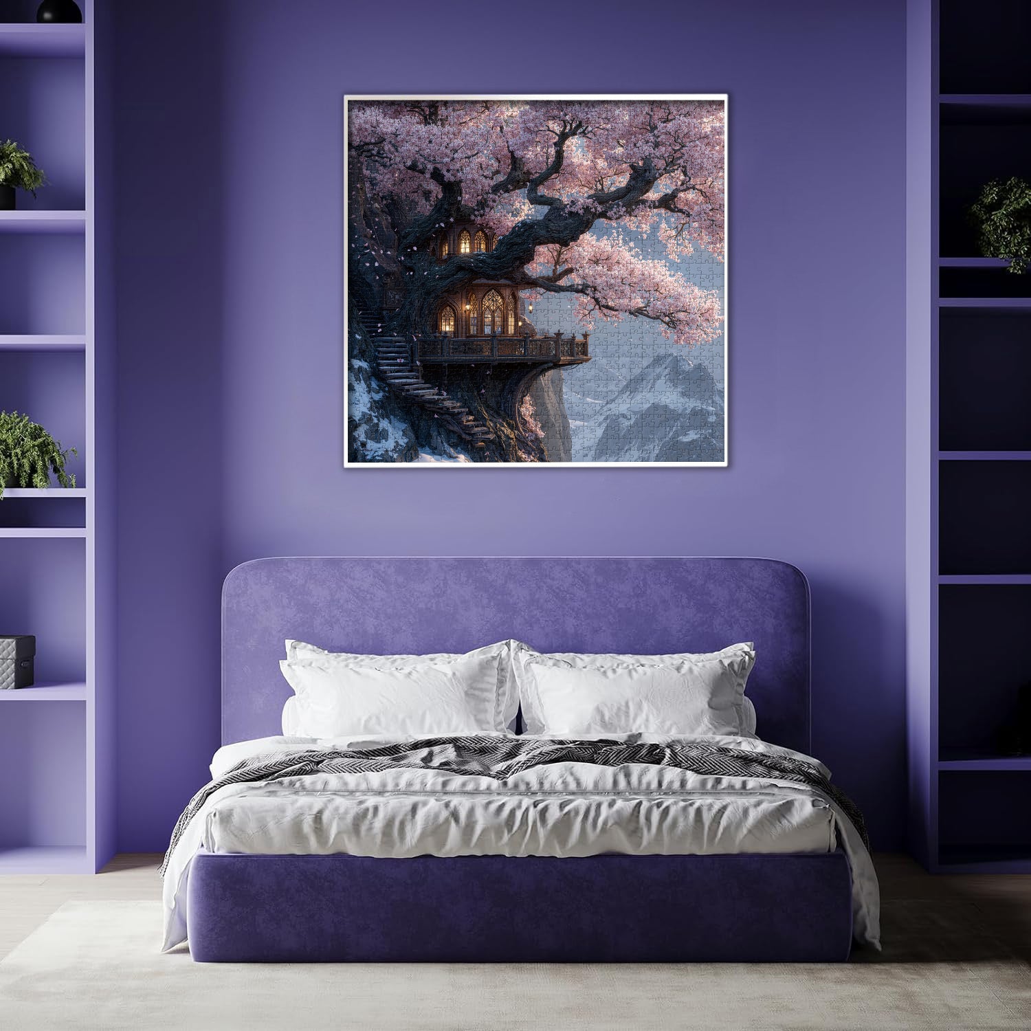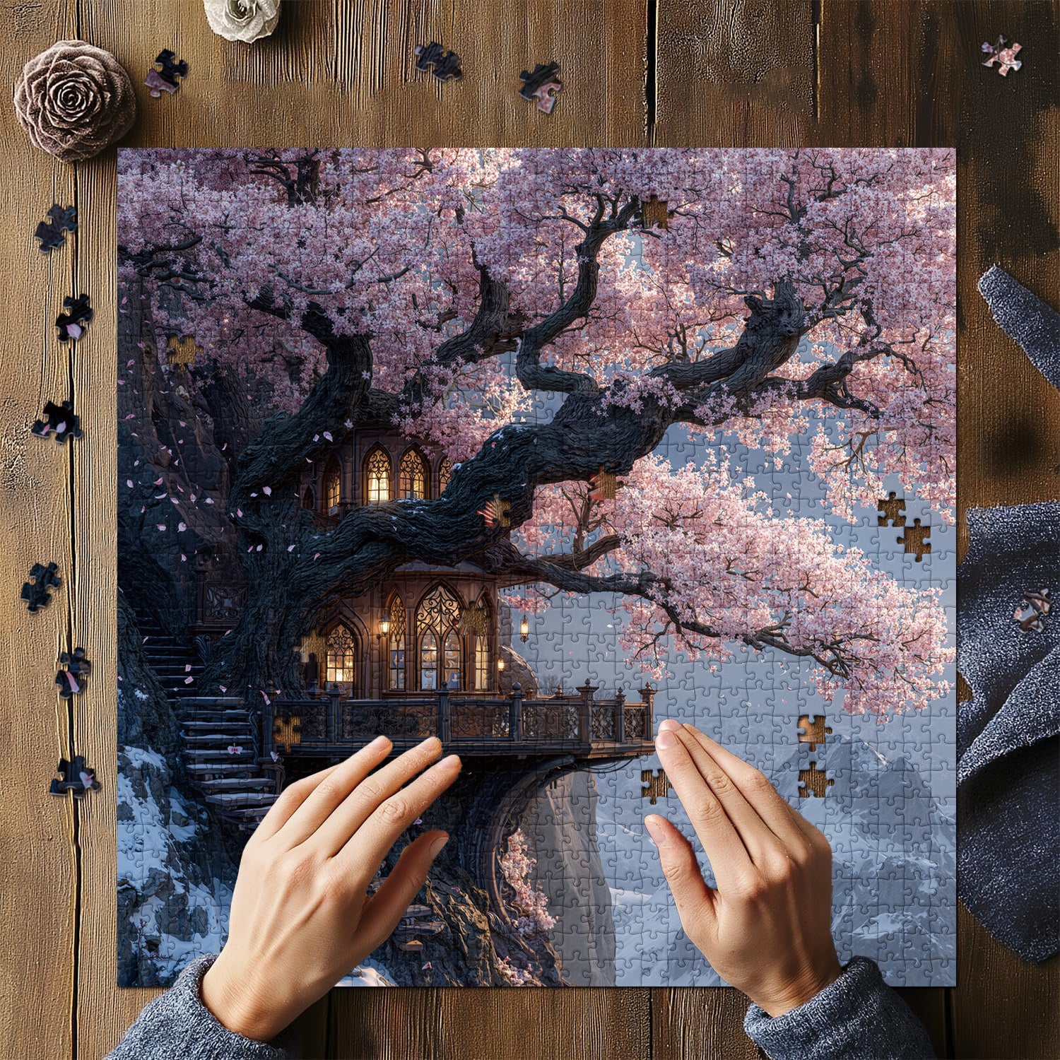 🏰🌳Acantilado de Sakura: Este rompecabezas representa una casa en un árbol de cuento de hadas de dos pisos ubicada dentro de un cerezo milenario: flores de cerezo rosadas se entrelazan con montañas cubiertas de nieve, una cálida luz amarilla brilla a través de las ventanas y escaleras de madera suben por el acantilado, asemejándose a un reino secreto habitado por hadas. El proceso de montaje es como adentrarse en un mundo fantástico donde conviven la primavera y el invierno, culminando con una impresionante pintura decorativa al finalizar.🌸🏔️