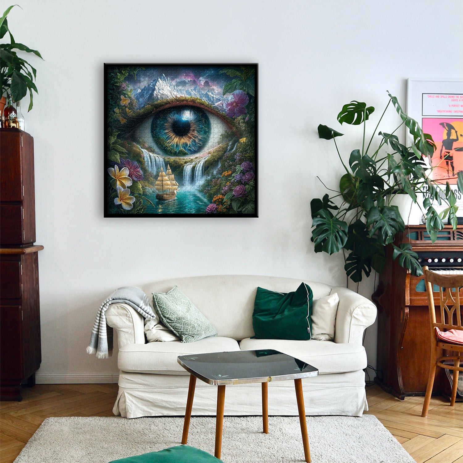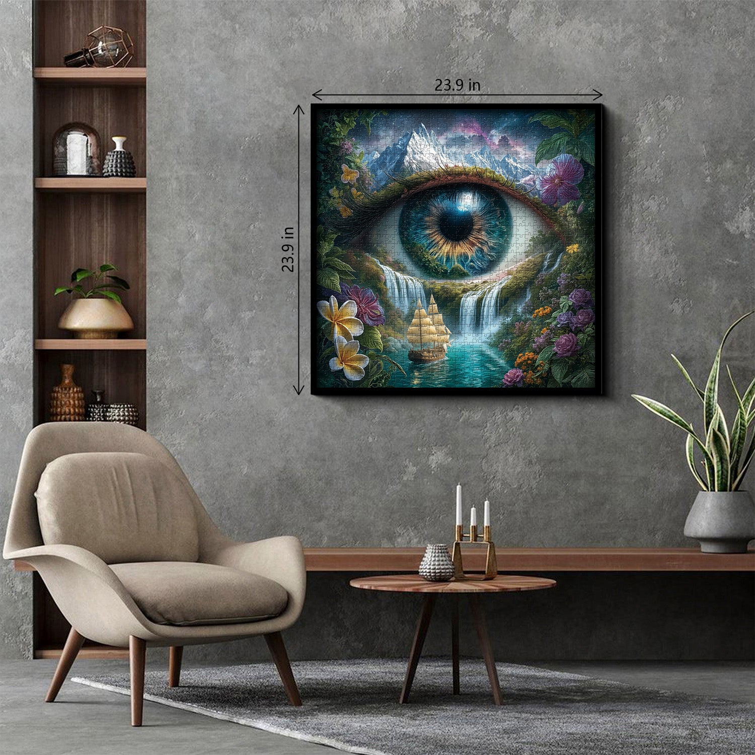 đđČăNature GazeăThis puzzle centers on a giant eye, like a window to another world. The natural landscape surrounding the eye intertwines with fantastical elementsâwaterfalls, sailboats, and blooming flowersâcreating a dreamlike atmosphere.đș