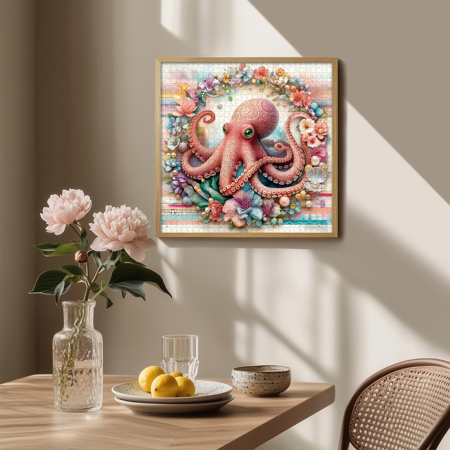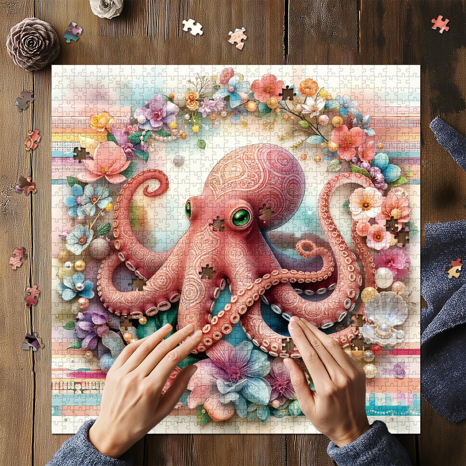đđăDreamy OctopusăThis Floral Octopus Art Puzzle, centered on a pink, vintage-patterned octopus, is surrounded by colorful floral arrangements, pearls, and seashells, set against a vintage checkered background, perfectly blending deep-sea fantasy with floral luxury.đŒđ