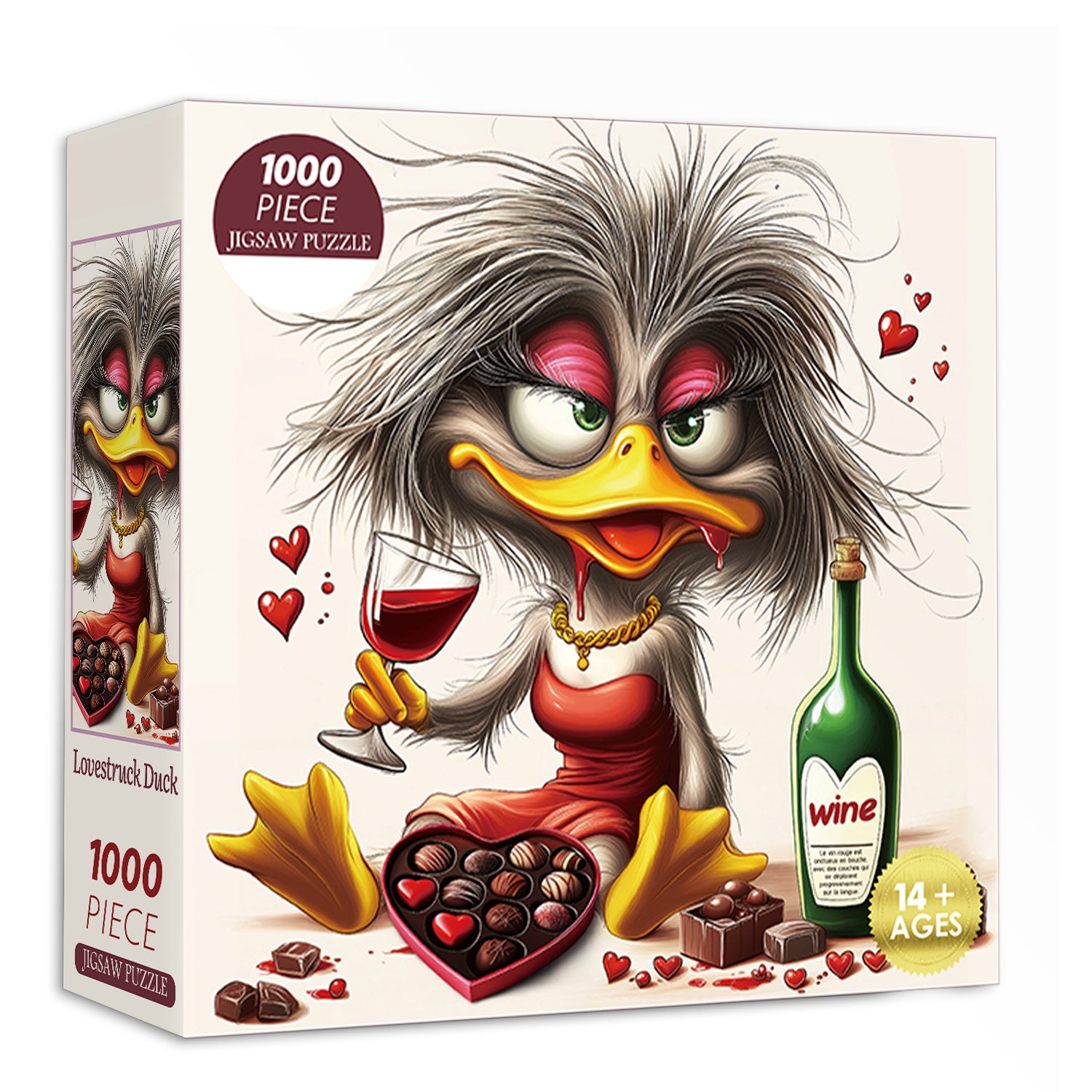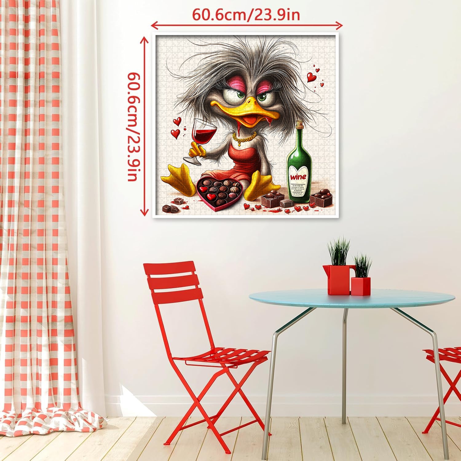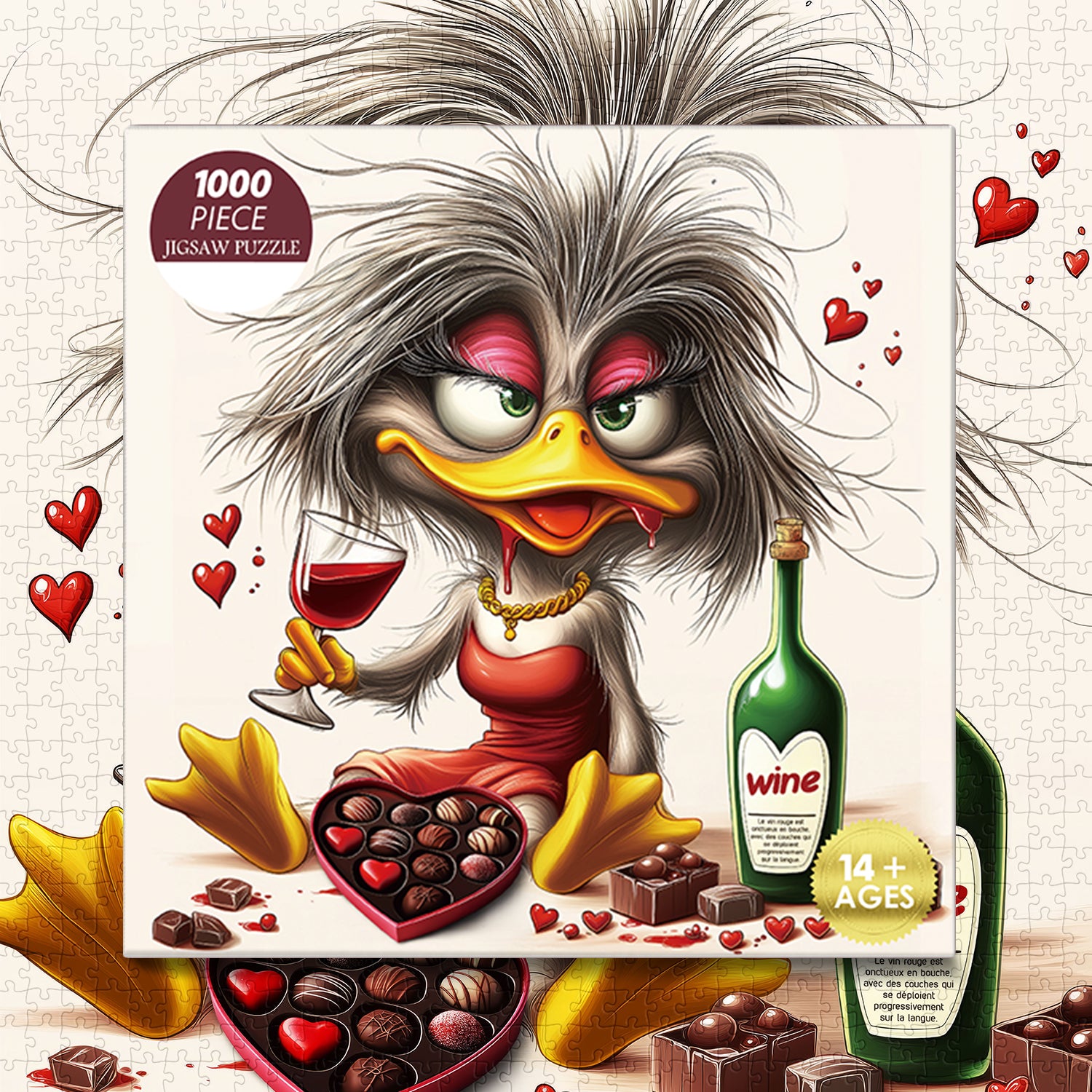 🪿🍷Anatra innamorata: Il puzzle è incentrato su un uccello cartone animato dallo stile unico, vestito con abiti alla moda, con in mano un bicchiere di vino, circondato da simboli d'amore. Sparsi attorno all'uccello dei cartoni animati ci sono cuori, cioccolatini e vino, che creano un'atmosfera romantica e dolce. L'espressione di questo uccello è esagerata e divertente; i suoi grandi occhi e il suo ampio sorriso sono irresistibili.🍫❤️
