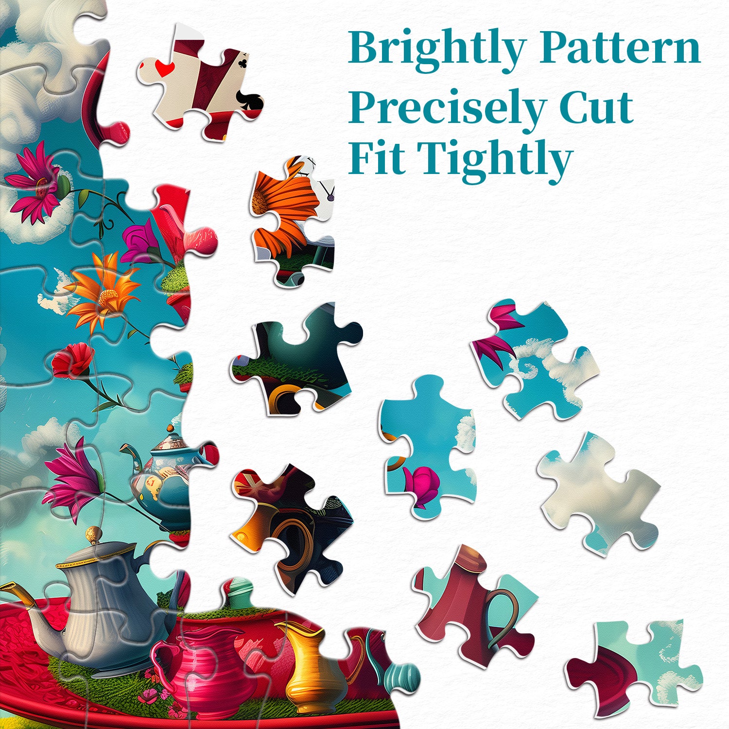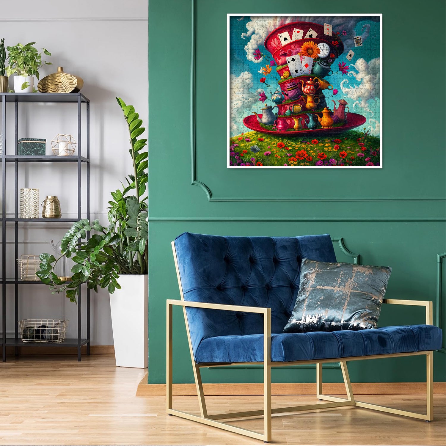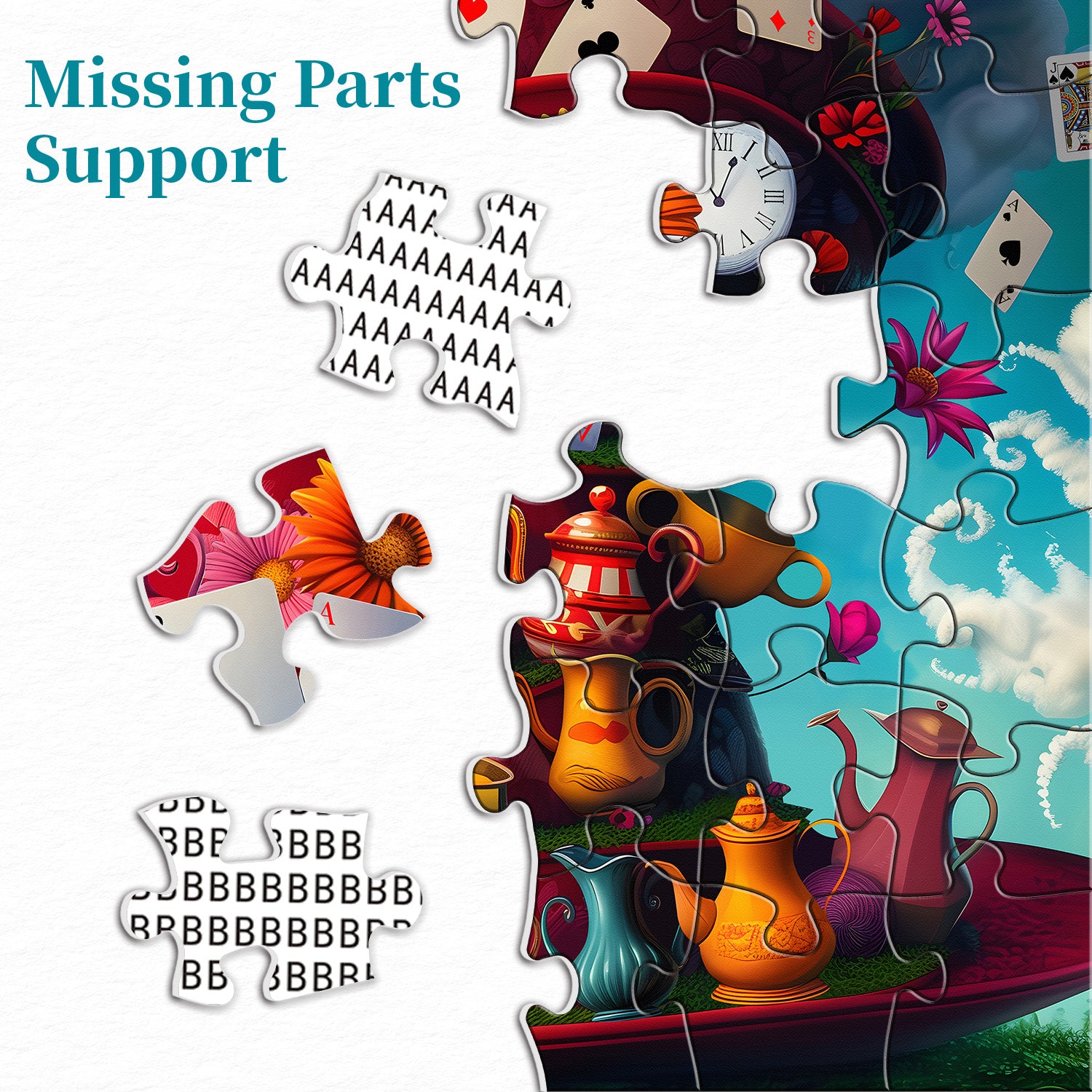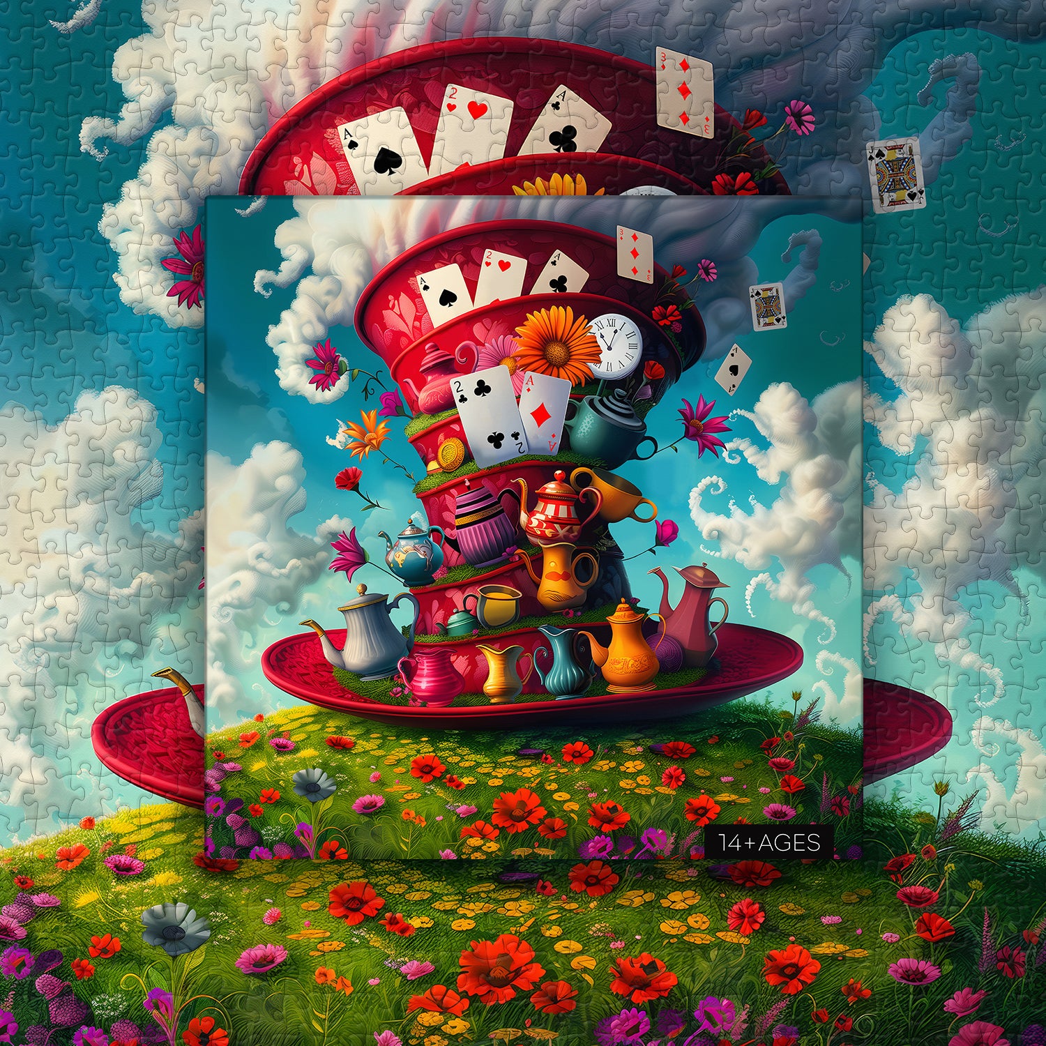 🎩【Magic Card Hat Jigsaw Puzzle】A red magical hat, topped with a teapot, playing cards, flowers, and more, evokes a sense of fantasy, as if plucked from a fairytale. From the delicate pattern of the teapot to the details of the playing cards, each puzzle piece is filled with detailed depictions.🃏