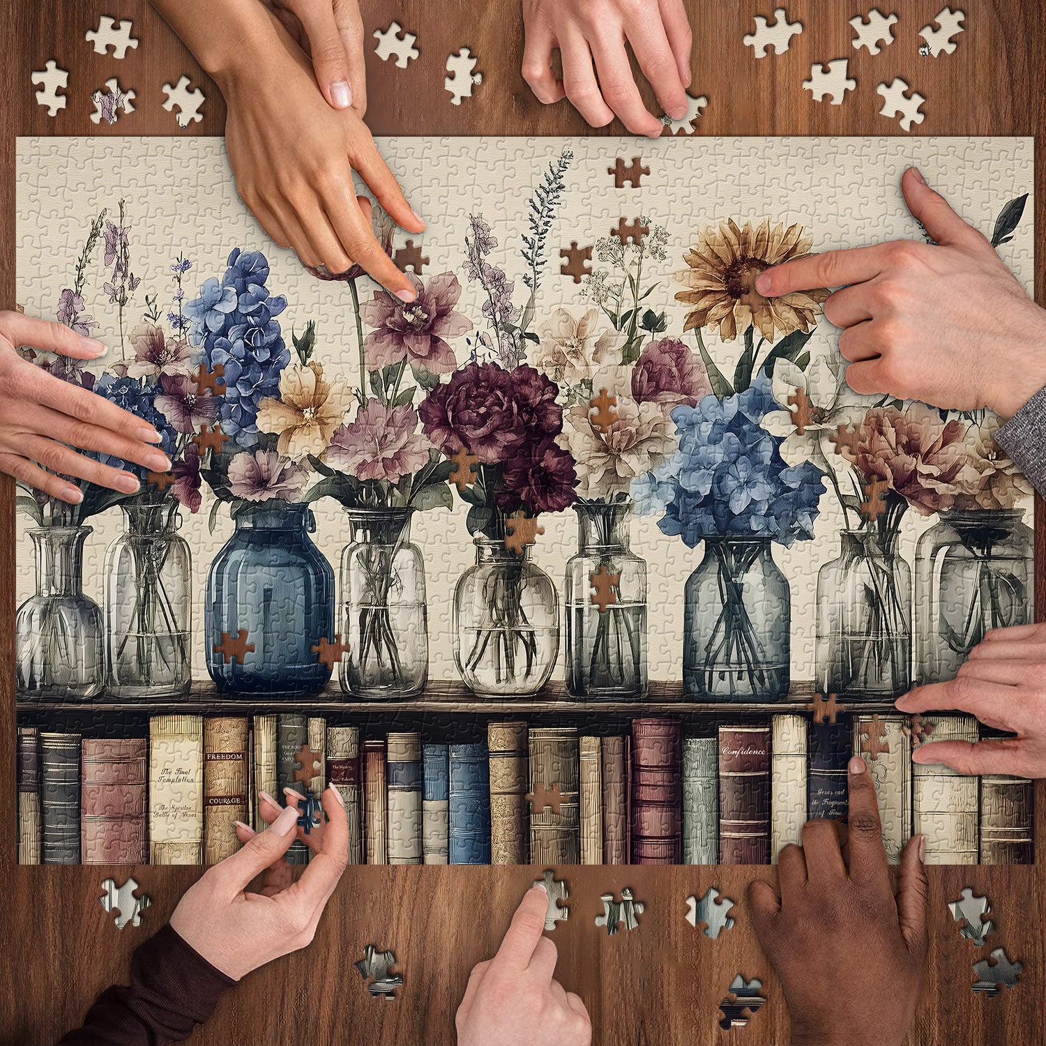 📚Libri e fiori: Immerso nel doppio godimento del profumo di libri e fiori, questo puzzle ti porterà in un tempio di conoscenza vintage ed elegante, il puzzle di Jigsaw mostra una libreria con file di libri vintage, la scaffale è ordinatamente organizzata con vasi squisiti, i vasi sono pieni di fiori colorati, che aggiungono un tocco di bellezza naturale a scaffale. Lasciati sperimentare la risonanza armoniosa della cultura e della natura nel patchwork!💐❤️