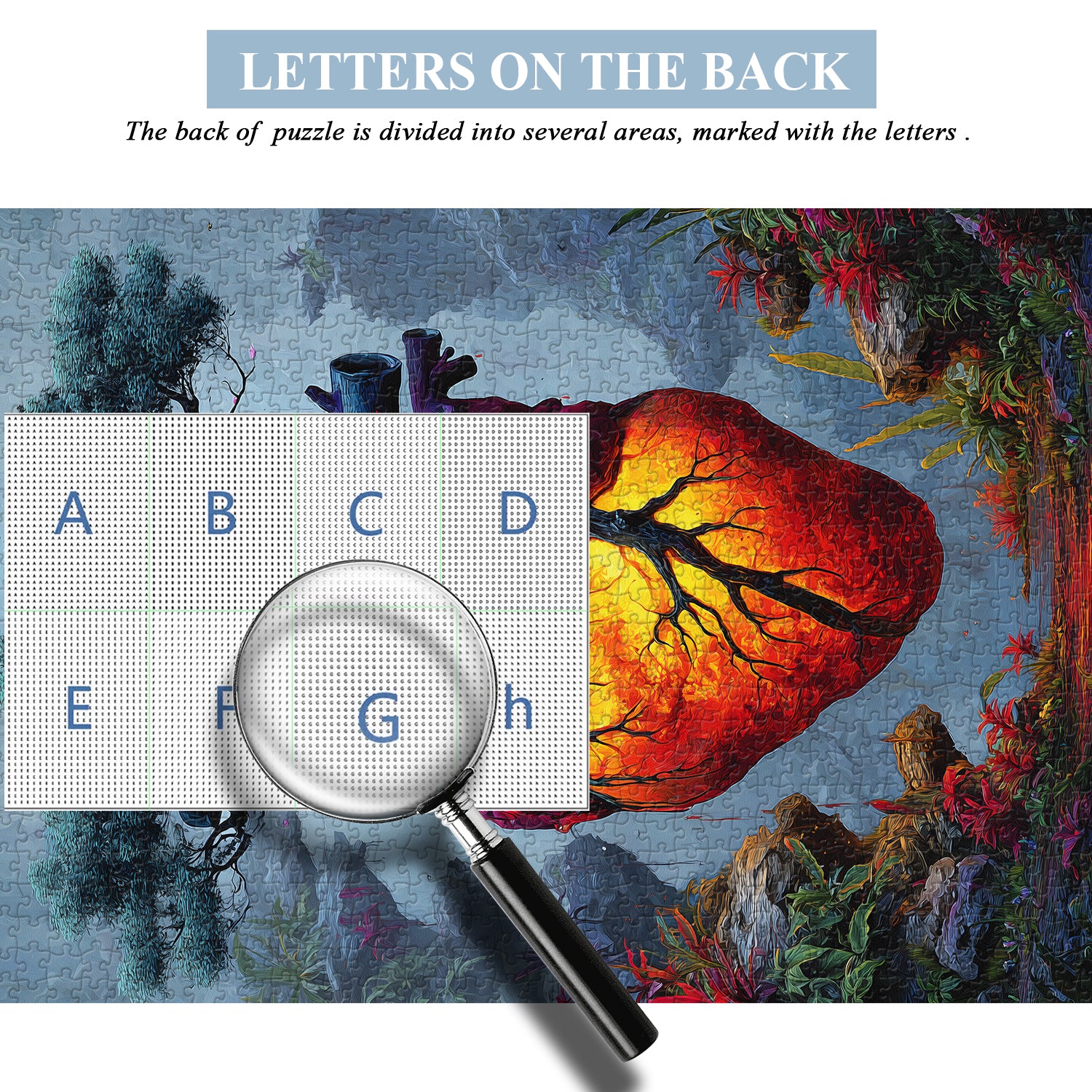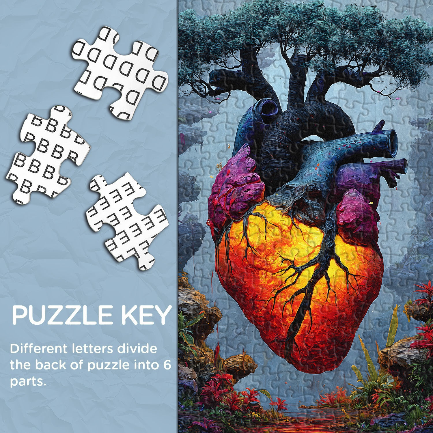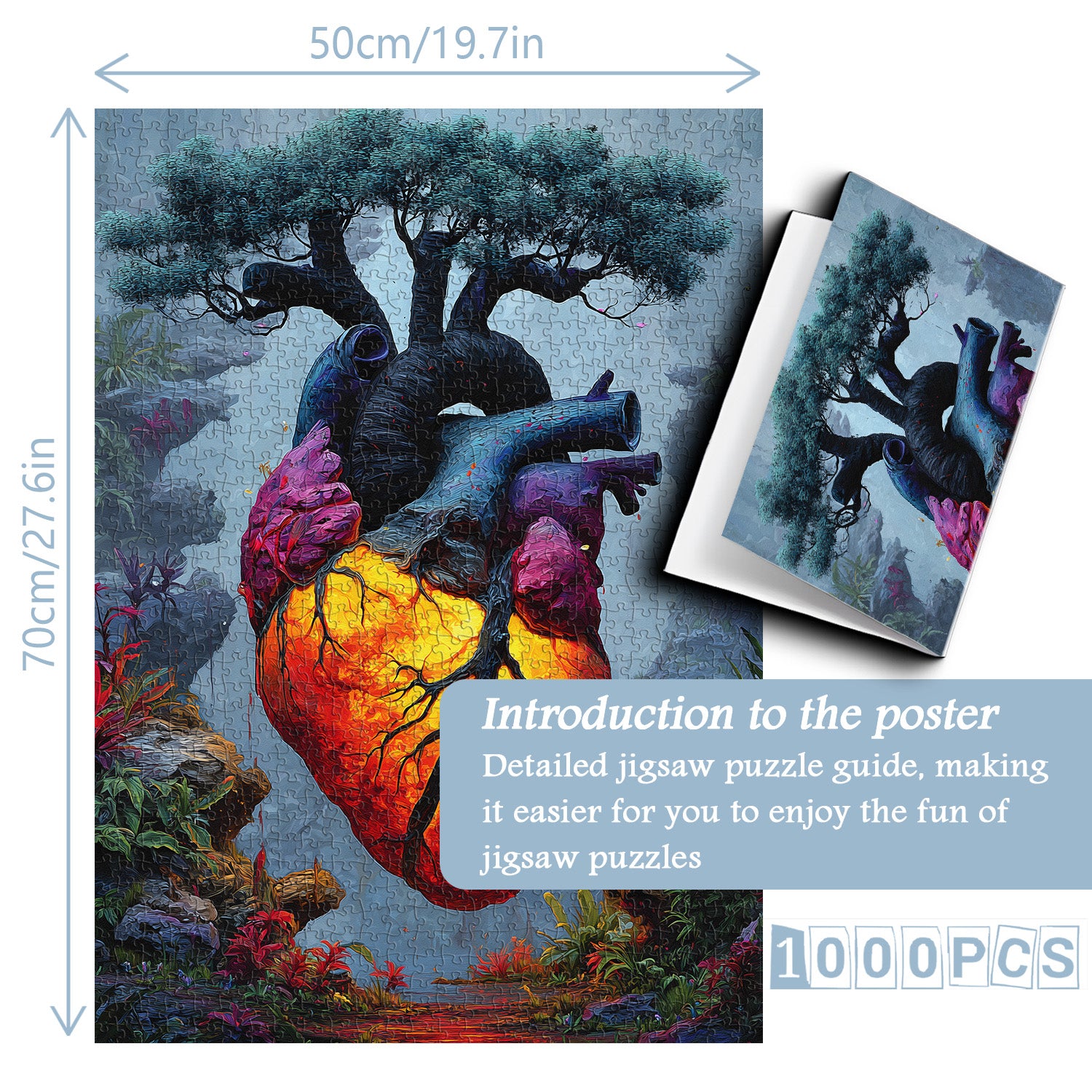 🌲❤️【Cuore della foresta】Il puzzle raffigura un albero vibrante con un cuore luminoso che cresce dal tronco, a simboleggiare l'amore e il potere della vita. I colori sono ricchi e armoniosi, passando dal blu intenso delle radici al verde smeraldo della corona, e infine al bagliore rosso e giallo del cuore.✨