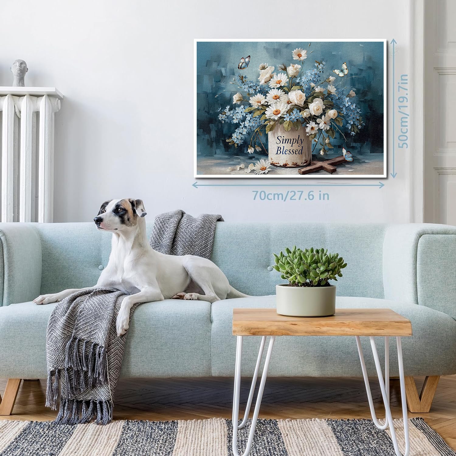 🌼🦋【 Simple Blessed】This puzzle features a vase emblazoned with the words "Simply Blessed" as its centerpiece. The vase is filled with a variety of flowers, including pristine white daisies, elegant white roses, and fresh blue flowers. Several colorful butterflies flutter among the blossoms, adding a touch of vividness and energy to the scene. It conveys warm and sincere blessings.💐