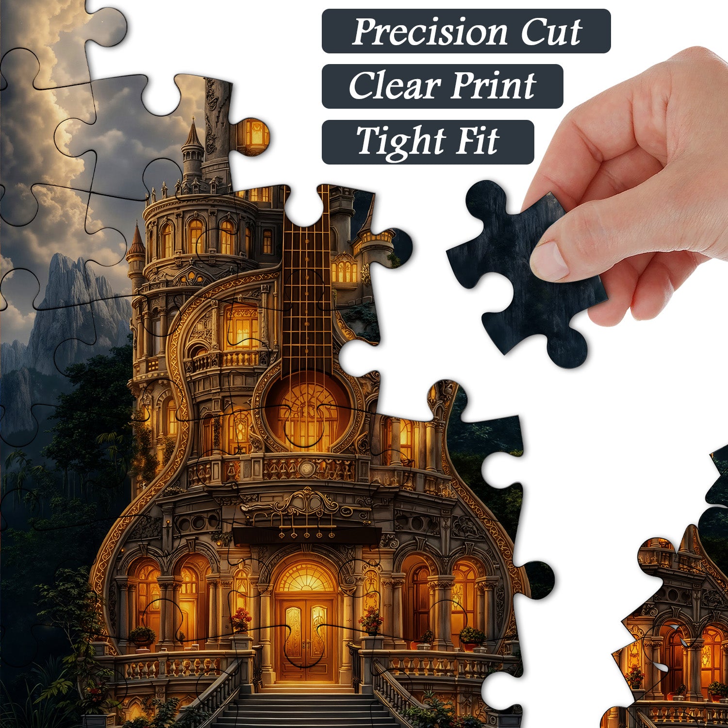 🎸🏰【Guitar ManorThis guitar castle fantasy art puzzle uses the outline of a guitar as its framework, incorporating a retro castle with gilded carvings. Warm yellow light spills from the window frames, and behind it are verdant peaks shrouded in mist, perfectly blending the dynamism of music with the solemnity of architecture.😎✨
