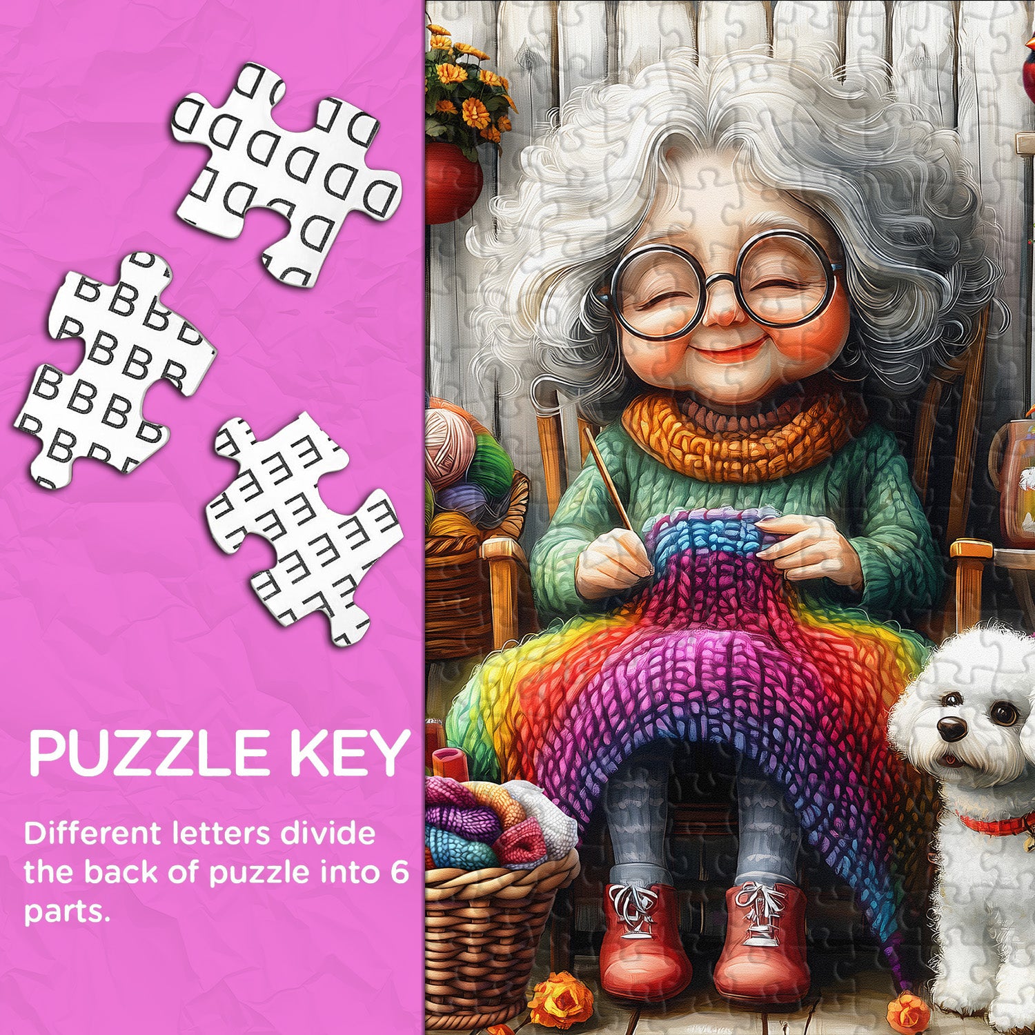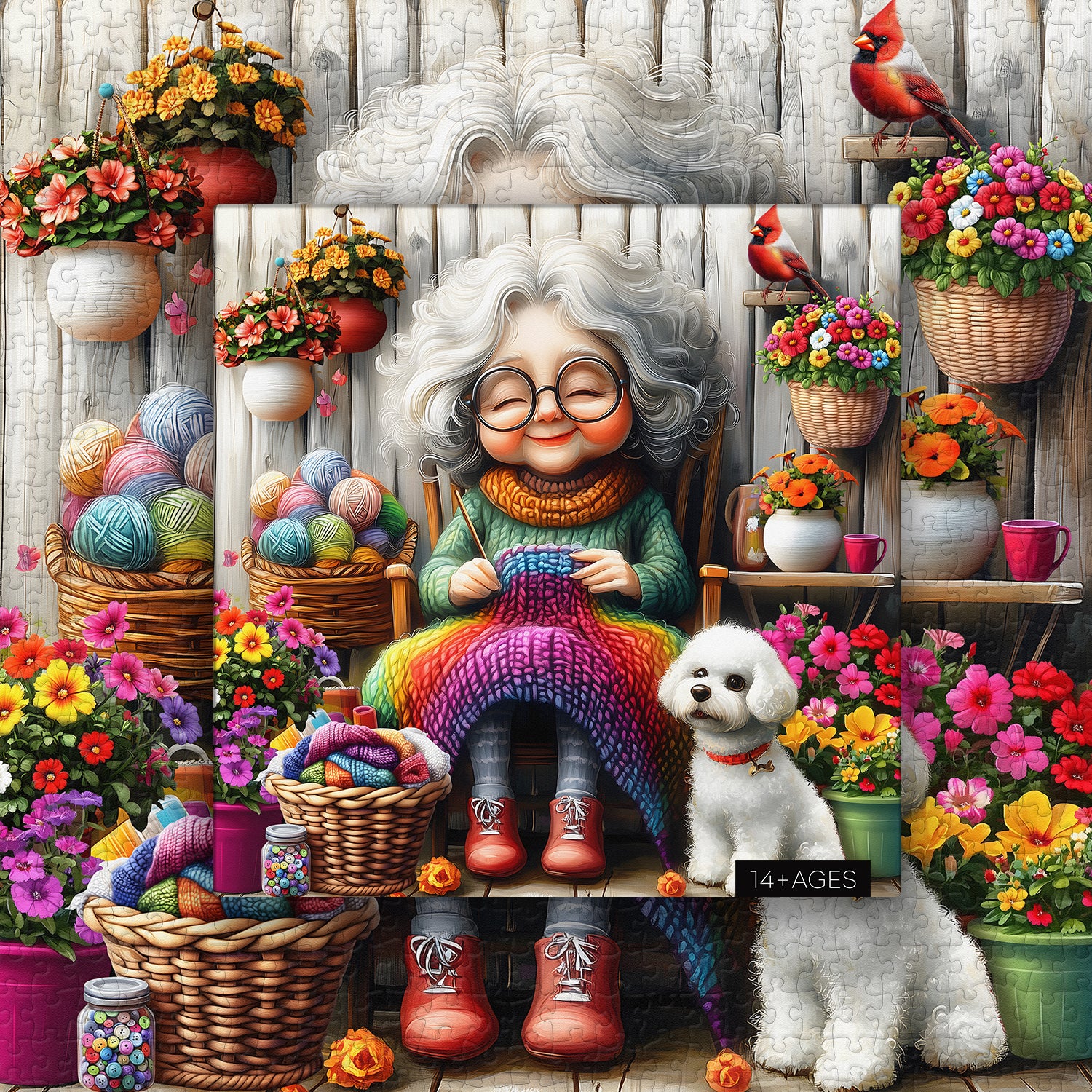 【Grandma’s Cozy Knit】The puzzle depicts a kind grandmother sitting at home, intently knitting a colorful scarf. The environment around her is full of color, from colorful balls of yarn to blooming flowers, each radiating the warmth of life. A cute white dog sits at her feet, keeping her company as she enjoys this peaceful time.