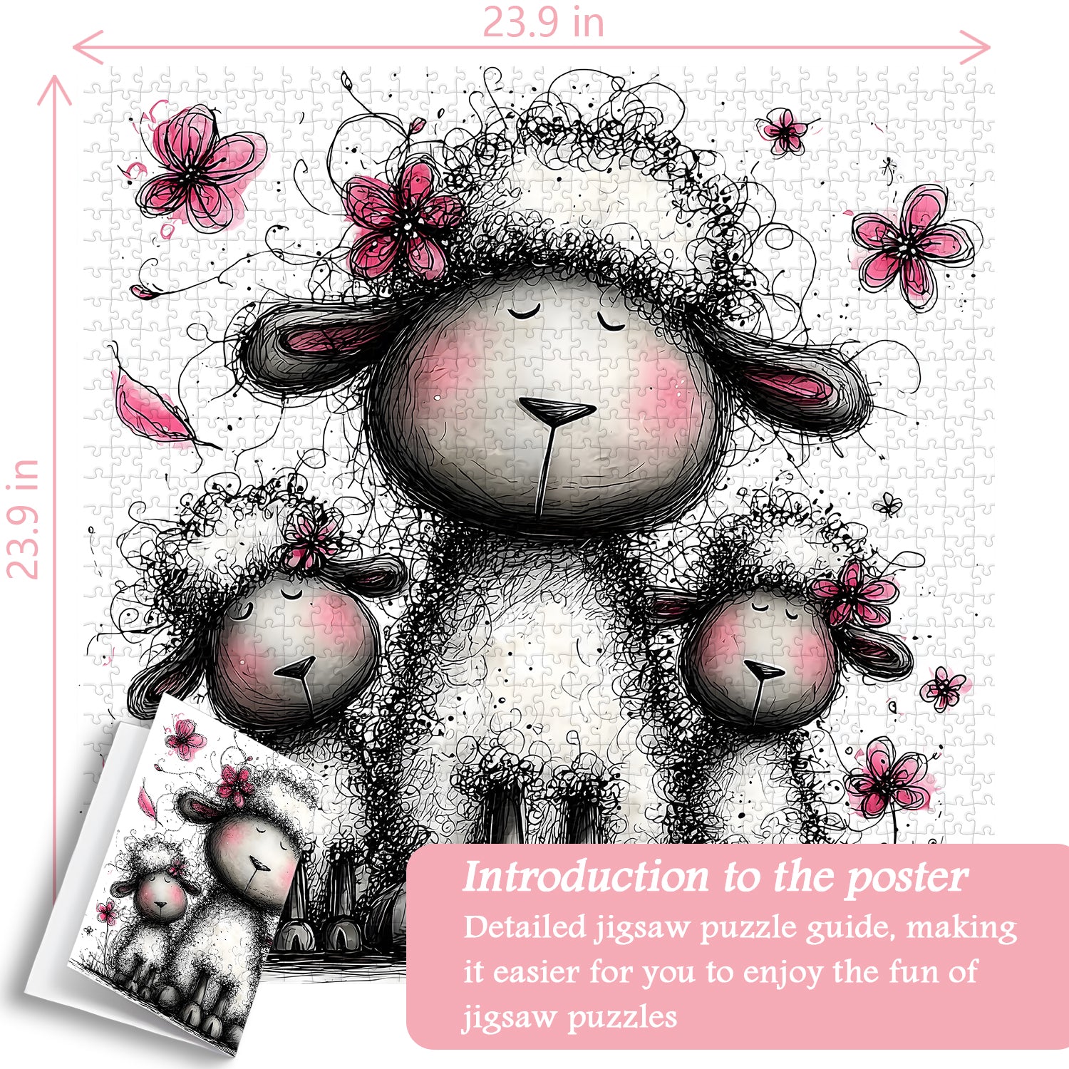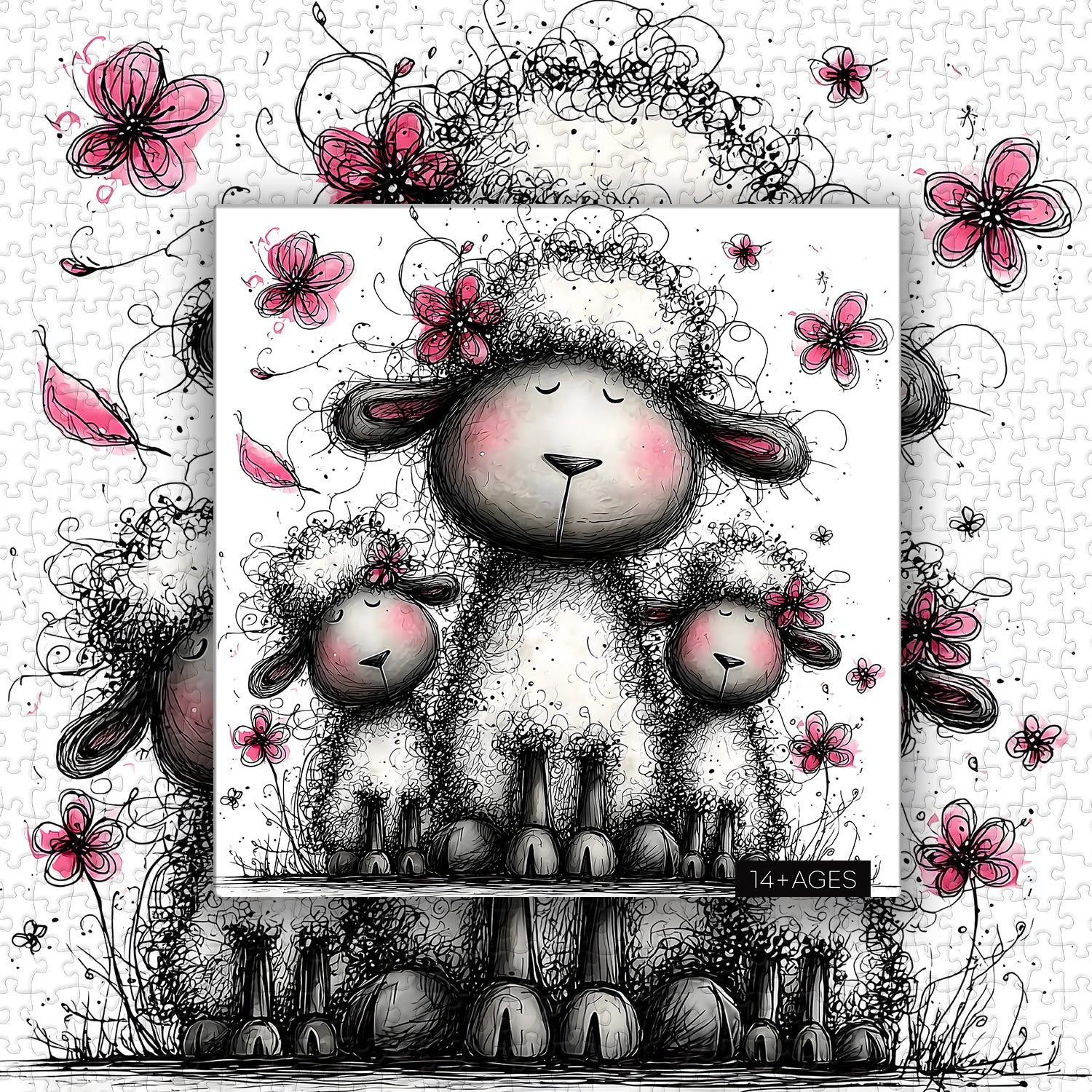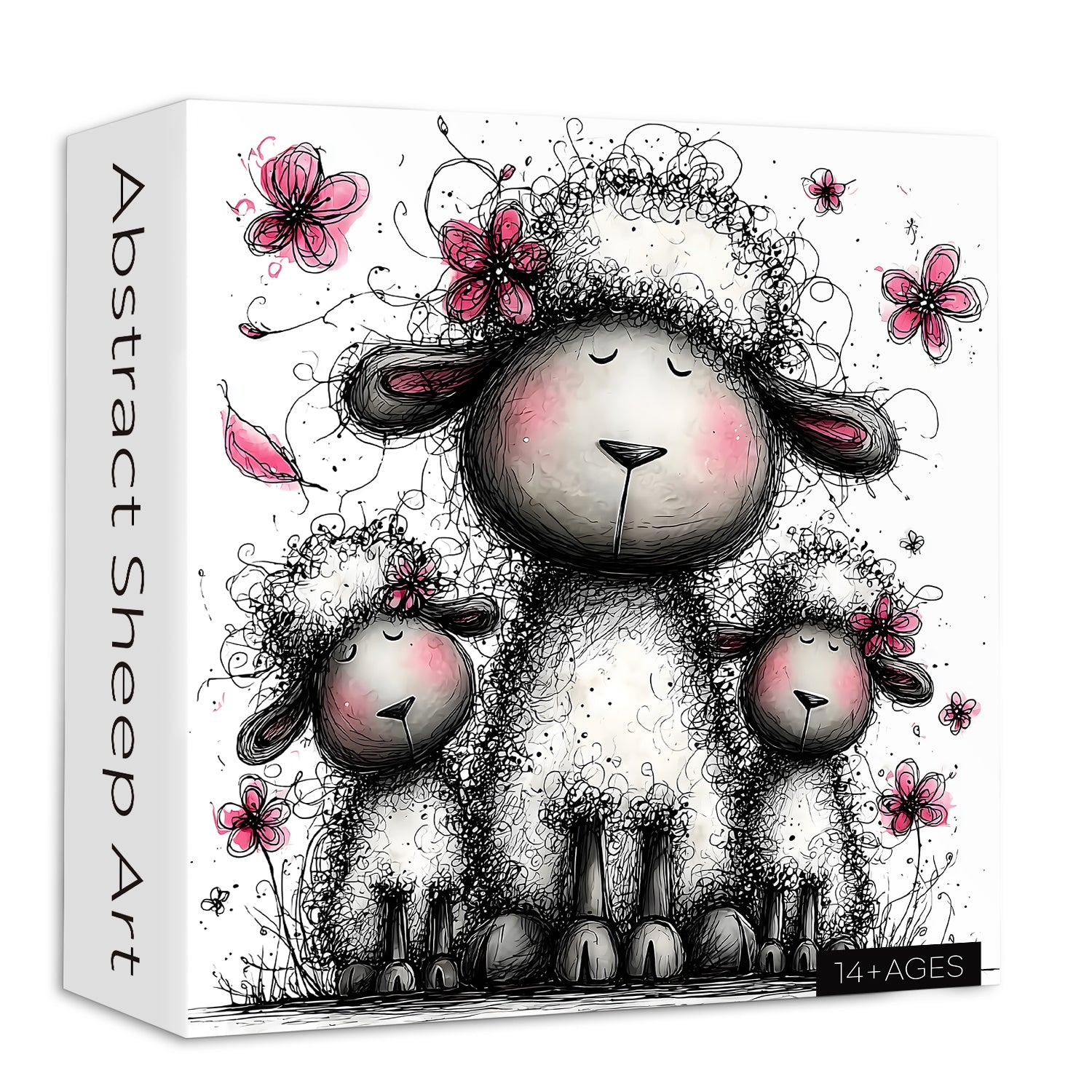 🐑🌸Arte astratta delle pecore: Questo puzzle raffigura tre adorabili pecore dai capelli ricci, con la mamma pecora saldamente al centro, i suoi capelli afro ornati di fiori rosa, gli occhi chiusi in un sorriso come se avesse appena ascoltato una bella canzone. Ai lati sono appesi due agnelli, anch'essi con gli occhi strabici e le guance rosee, una combinazione di genetica e stemma di famiglia.🌺✨