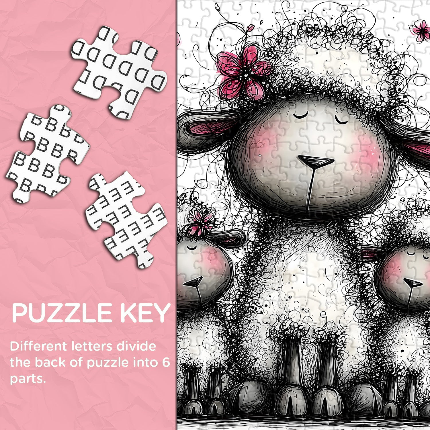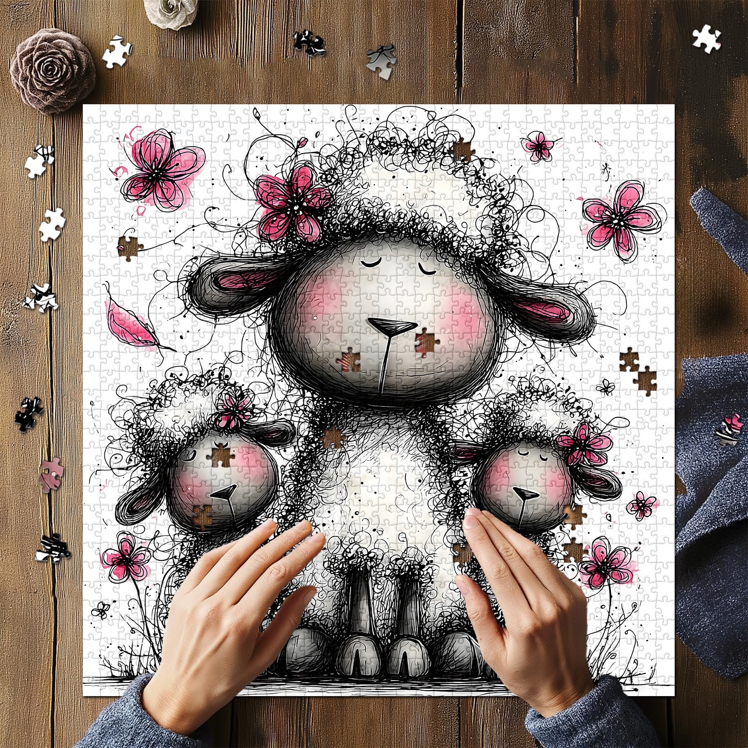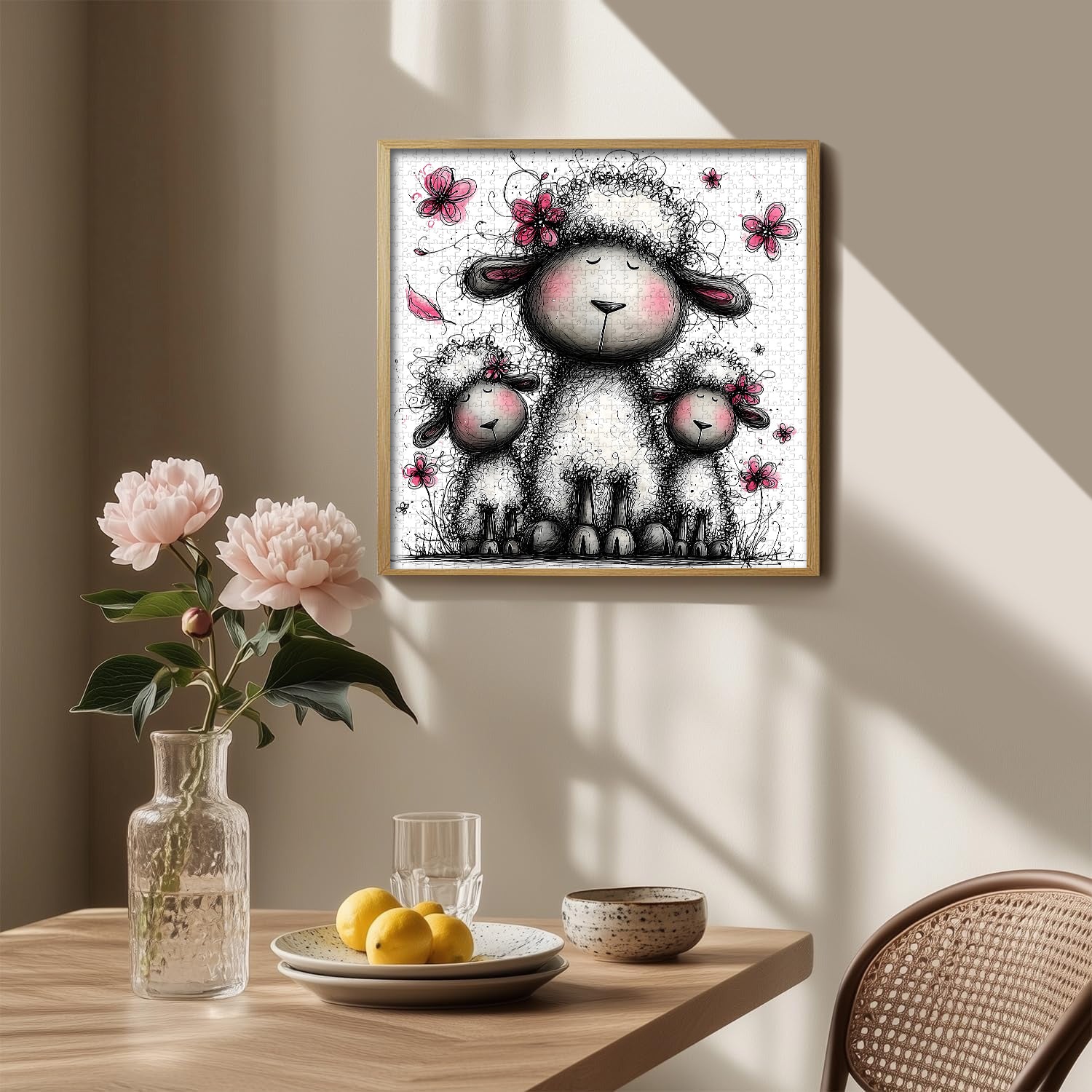 🐑🌸Arte astratta delle pecore: Questo puzzle raffigura tre adorabili pecore dai capelli ricci, con la mamma pecora saldamente al centro, i suoi capelli afro ornati di fiori rosa, gli occhi chiusi in un sorriso come se avesse appena ascoltato una bella canzone. Ai lati sono appesi due agnelli, anch'essi con gli occhi strabici e le guance rosee, una combinazione di genetica e stemma di famiglia.🌺✨