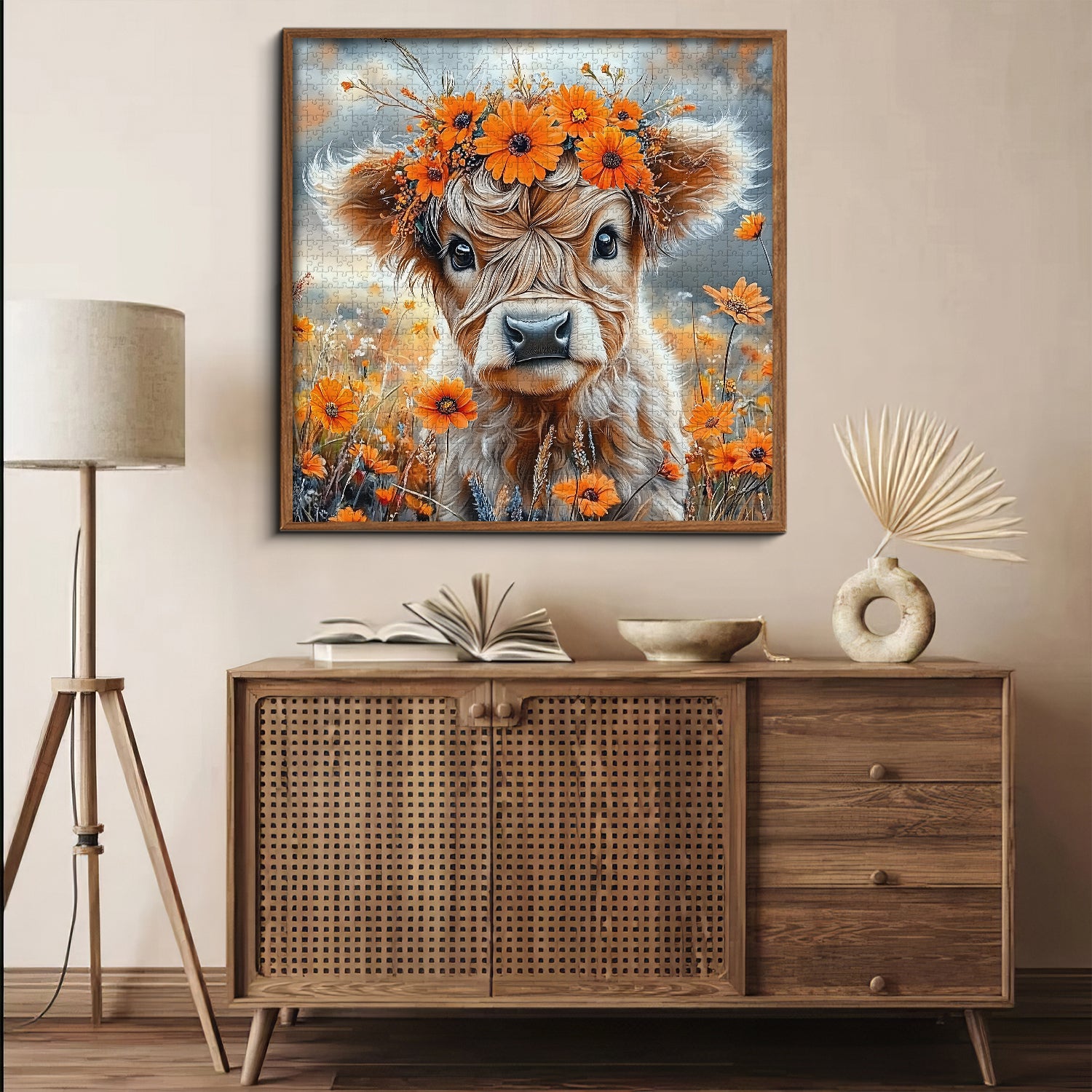 🐮🌺Vitello Floreale: Un toro delle Highland soffice e dal pelo morbido occupa la posizione centrale, i suoi occhi grandi, gentili e acquosi sembrano parlare a volume, guardando dritto nel tuo cuore. Una vibrante ghirlanda arancione adorna la sua testa, con grandi fiori di cosmo e calendule in lizza per l'attenzione, completati dal delicato alito di un bambino e ramoscelli di erba selvatica, come se il calore del sole autunnale fosse stato intessuto nella sua pelliccia.🌾🌼