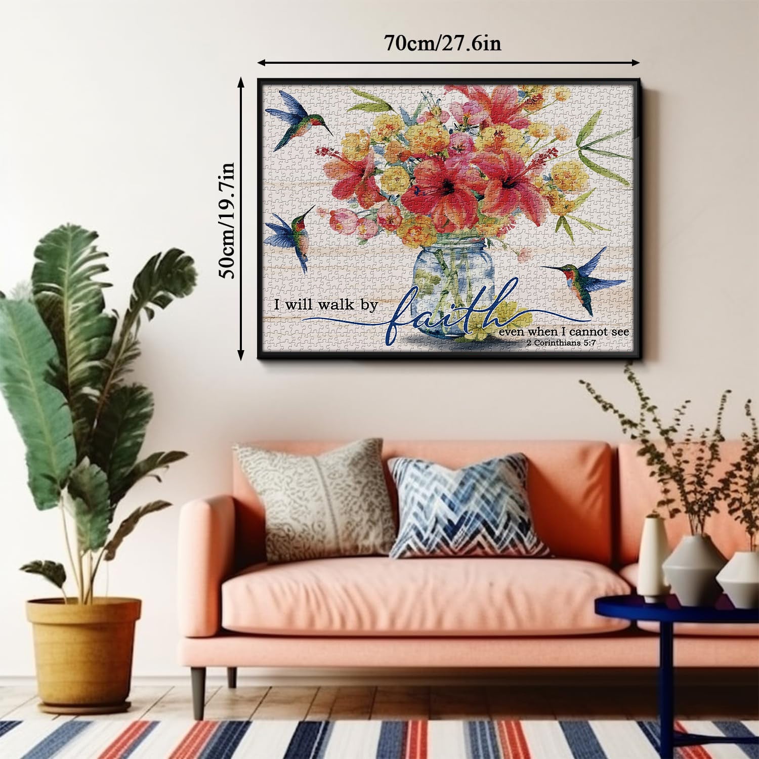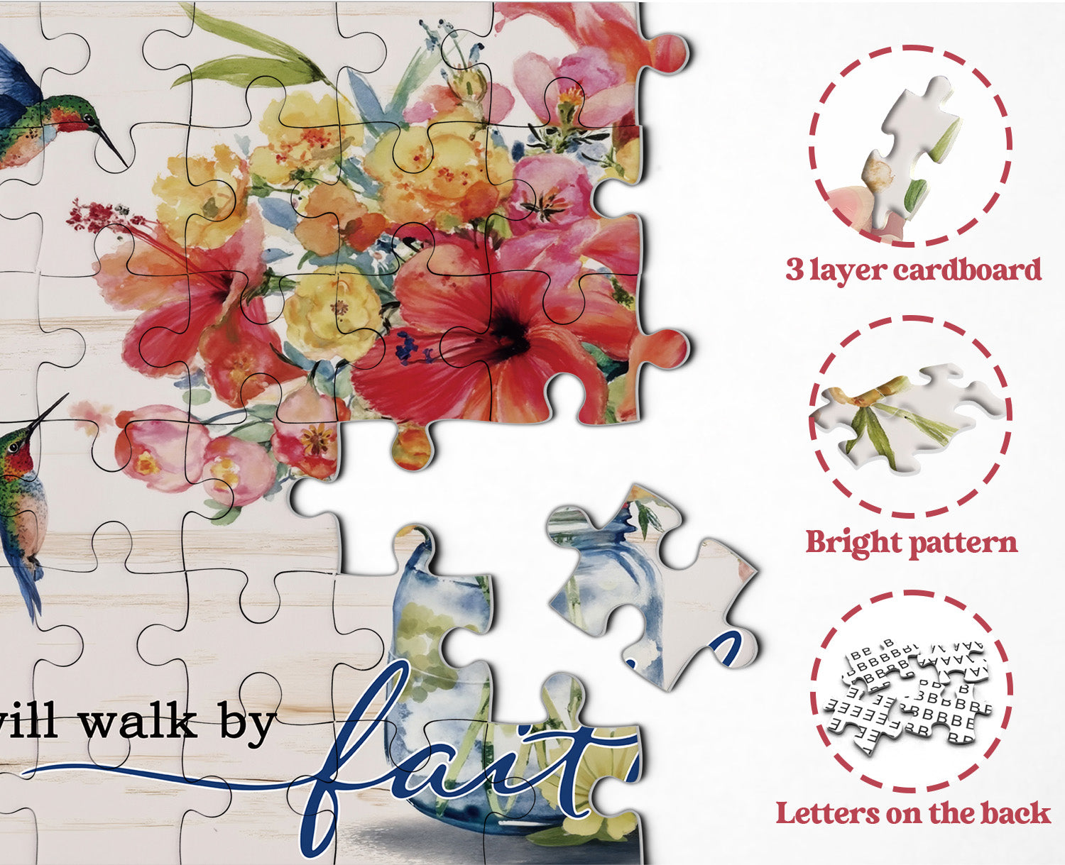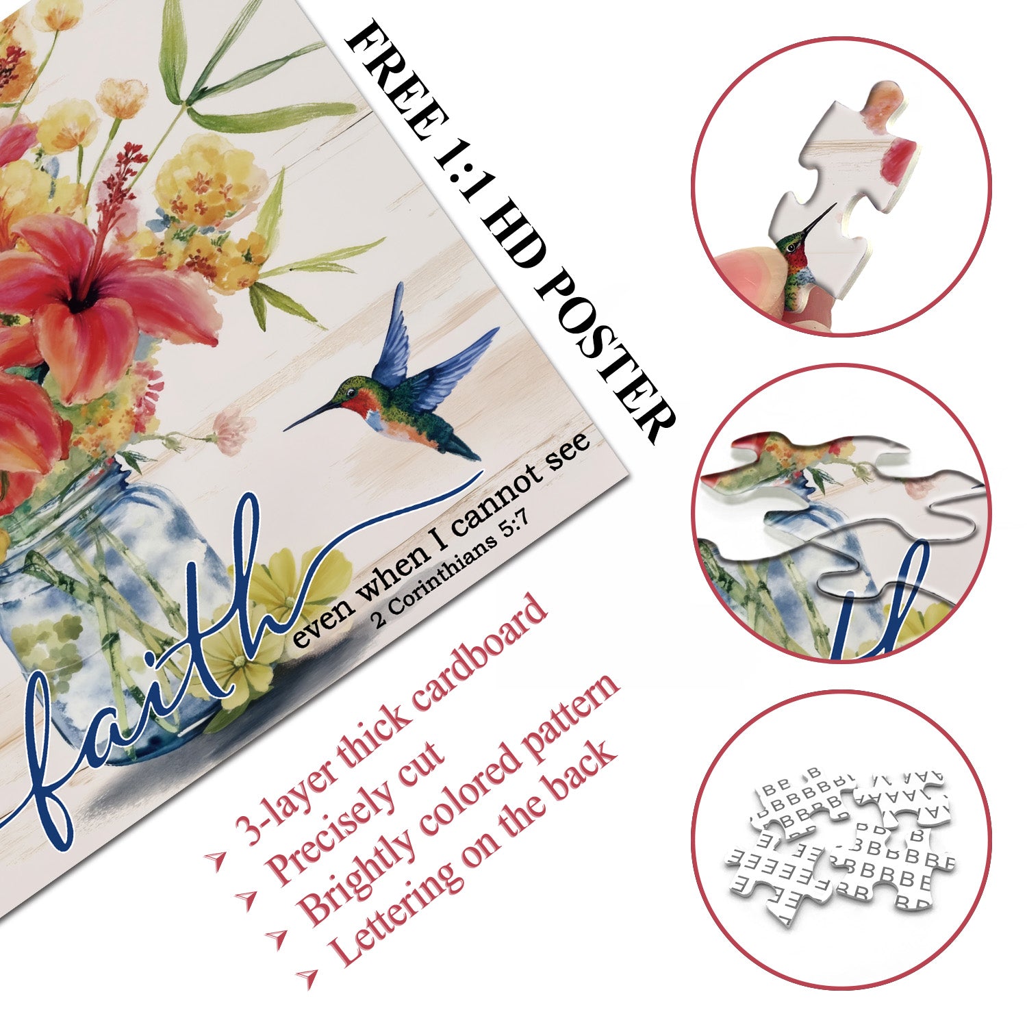 🐦💐Sentiero della fede: Questo puzzle presenta una rilassante natura morta ad acquerello: un barattolo di vetro trasparente contiene un vibrante ibisco rosso e delicate rose gialle, con tre colibrì appollaiati sopra, con le ali scintillanti come gioielli. Lo sfondo presenta venature del legno chiaro, intervallate dalla scrittura scritta a mano "Camminerò per fede anche quando non posso vedere". Il processo di assemblaggio è come una meditazione e il pezzo completato è un'opera d'arte che porta pace e forza.🌺✝️