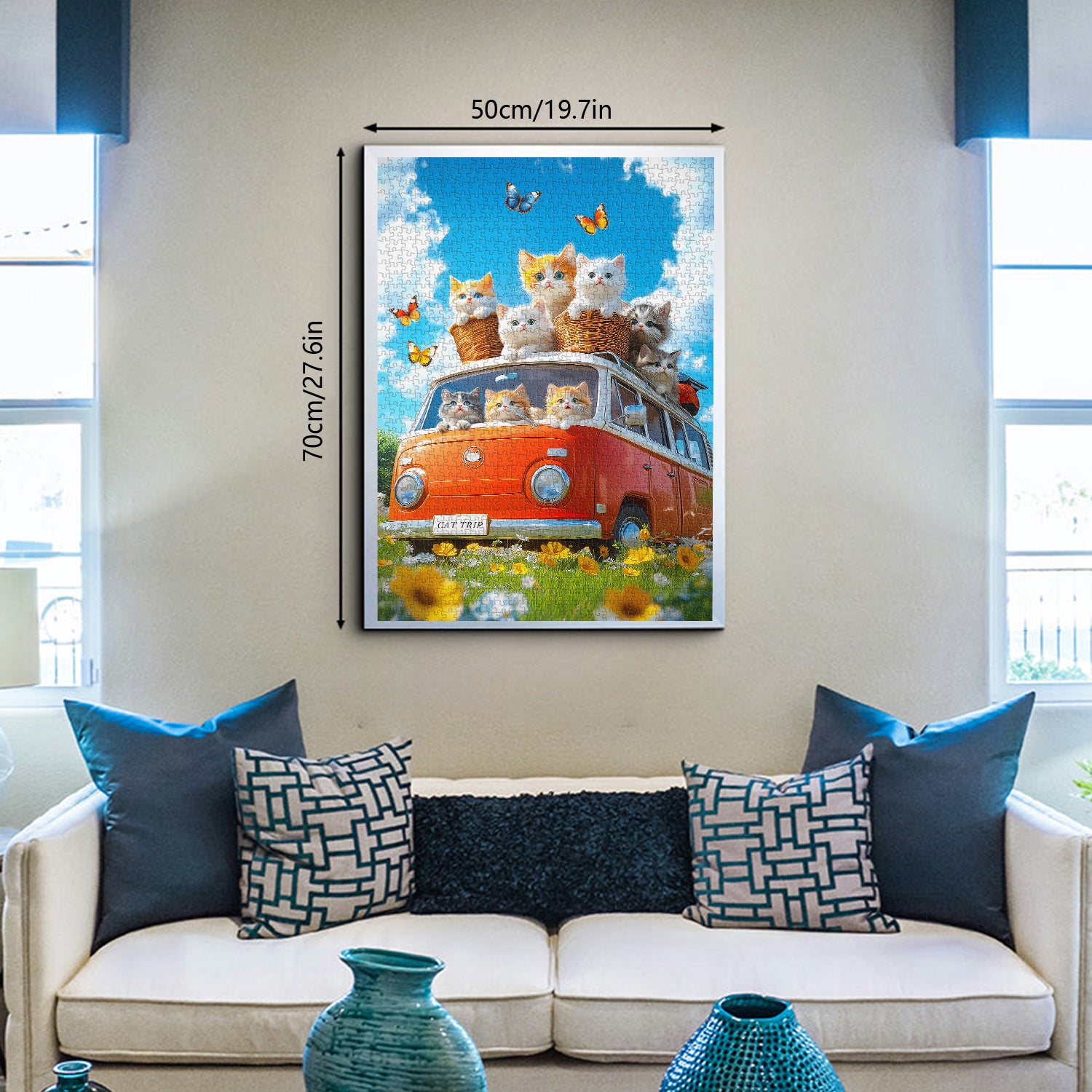 🚐🐱【Giro in gatto soleggiato】Questo è un puzzle per gatti in viaggio su strada: nove adorabili gatti si infilano in un minivan retrò rosso-arancione, sbirciando da un cestino sul tetto, scortati da farfalle colorate, con fiori di campo che aprono la strada e cieli azzurri e nuvole bianche come sfondo. La targa "CAT TRIP" dichiara che si tratta di un viaggio di laurea senza patente né destinazione, solo tutta l'estate e un cuore che vuole volare.🦋🌼