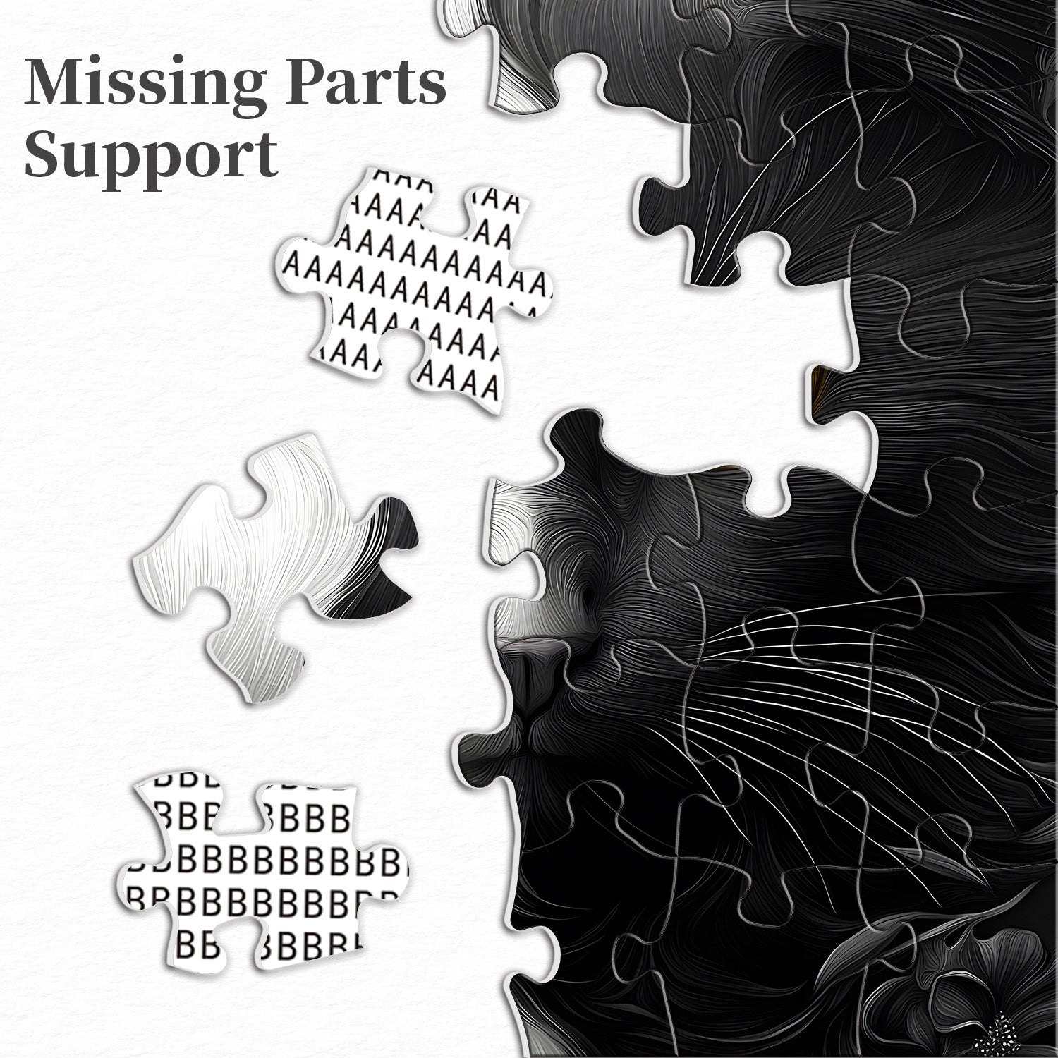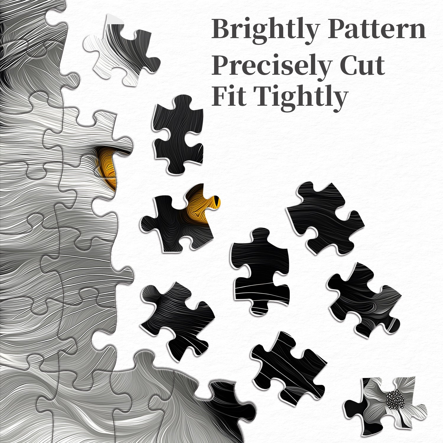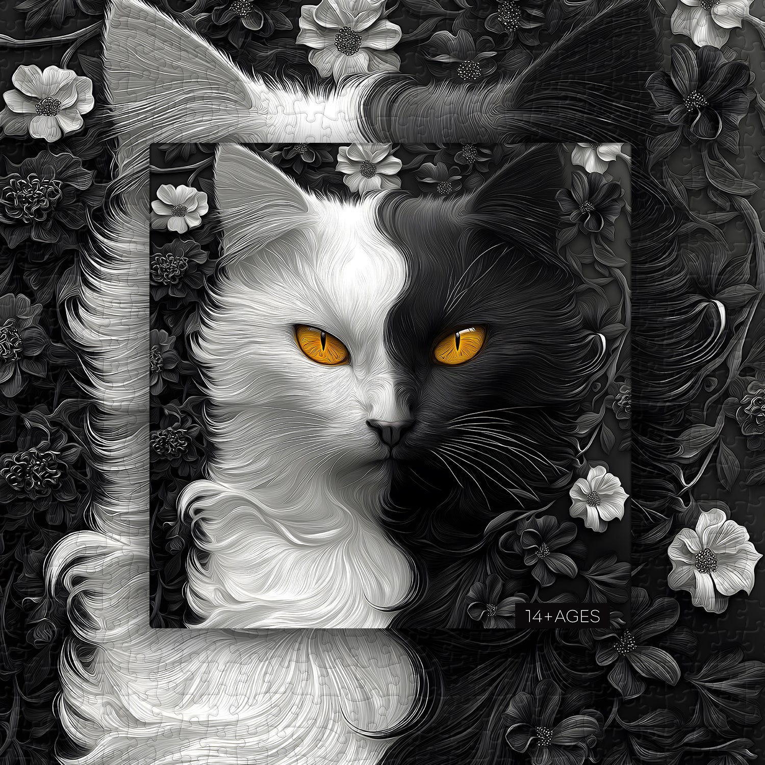 Gatto Yin Yang: Il puzzle raffigura una coppia di gatti gemelli bianchi e neri che condividono un unico volto, creando un'immagine misteriosa e accattivante. Il sorprendente contrasto tra bianco e nero, insieme all'oro scintillante negli occhi dei gatti, rende l'intera immagine vivida e accattivante.