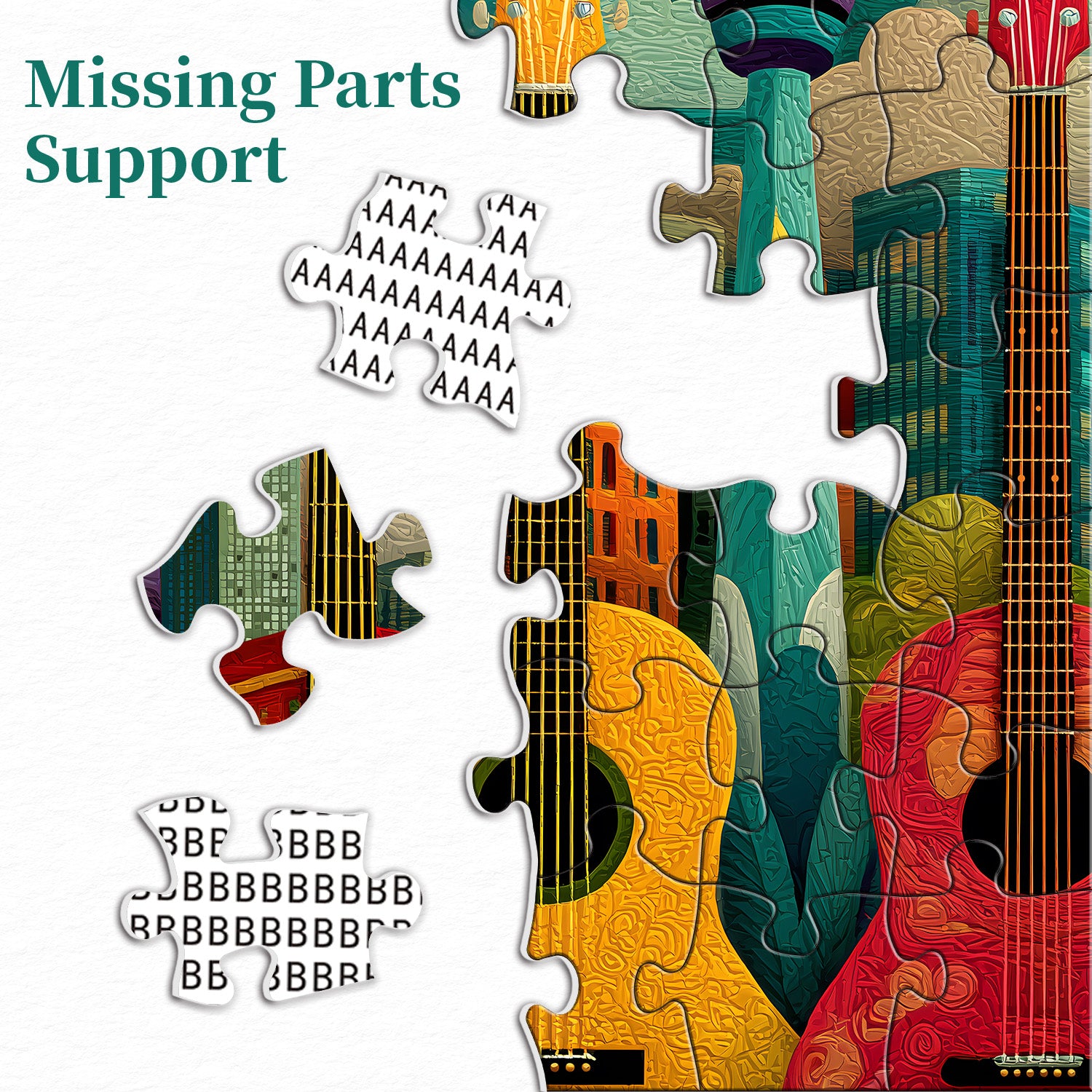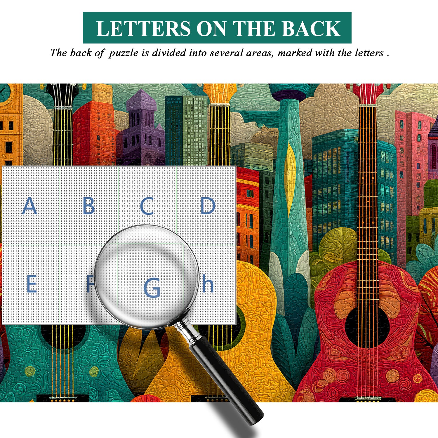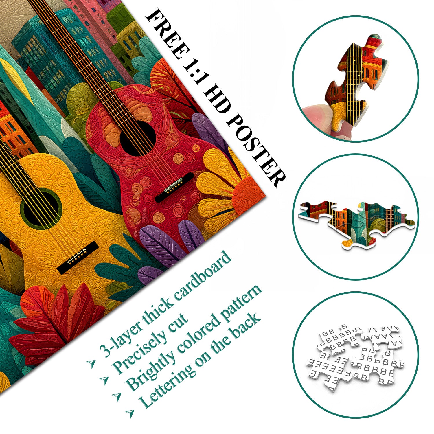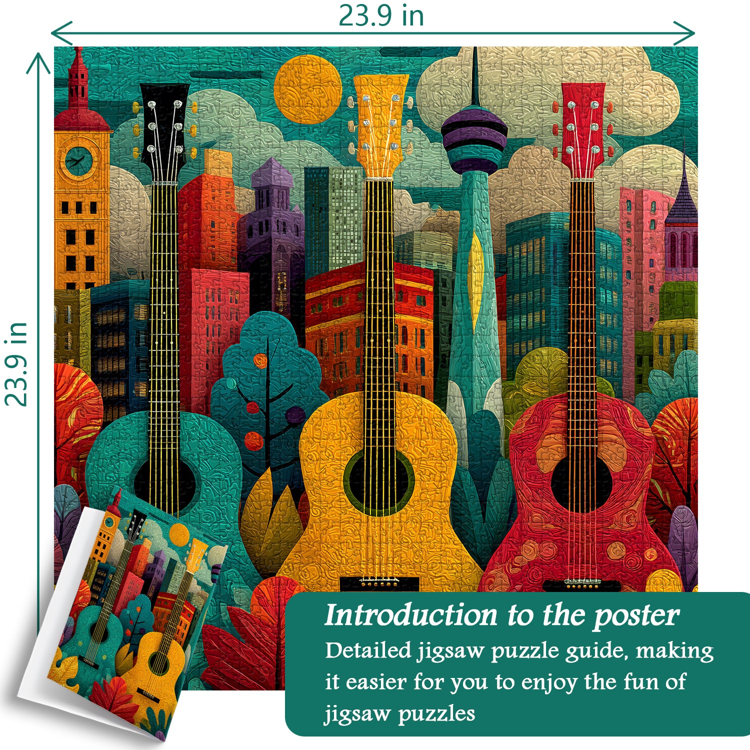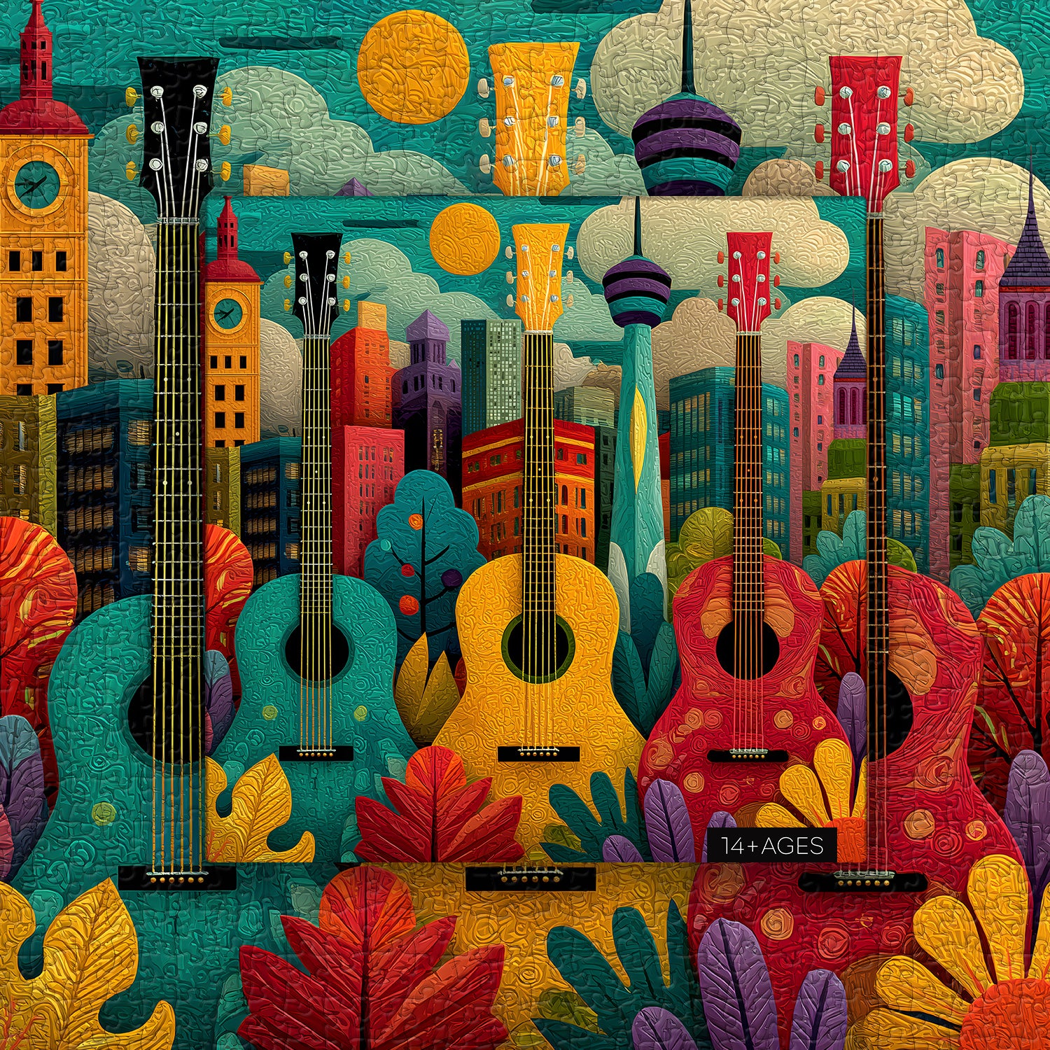 🎸🌆Chitarra e città: Questo puzzle combina abilmente lo skyline della città con tre chitarre colorate, creando un vivace paesaggio urbano ricco di musicalità. La chitarra è circondata da piante rigogliose, che simboleggiano l'armoniosa convivenza tra natura e musica, aggiungendo un tocco di vitalità alla città.🌈🌳