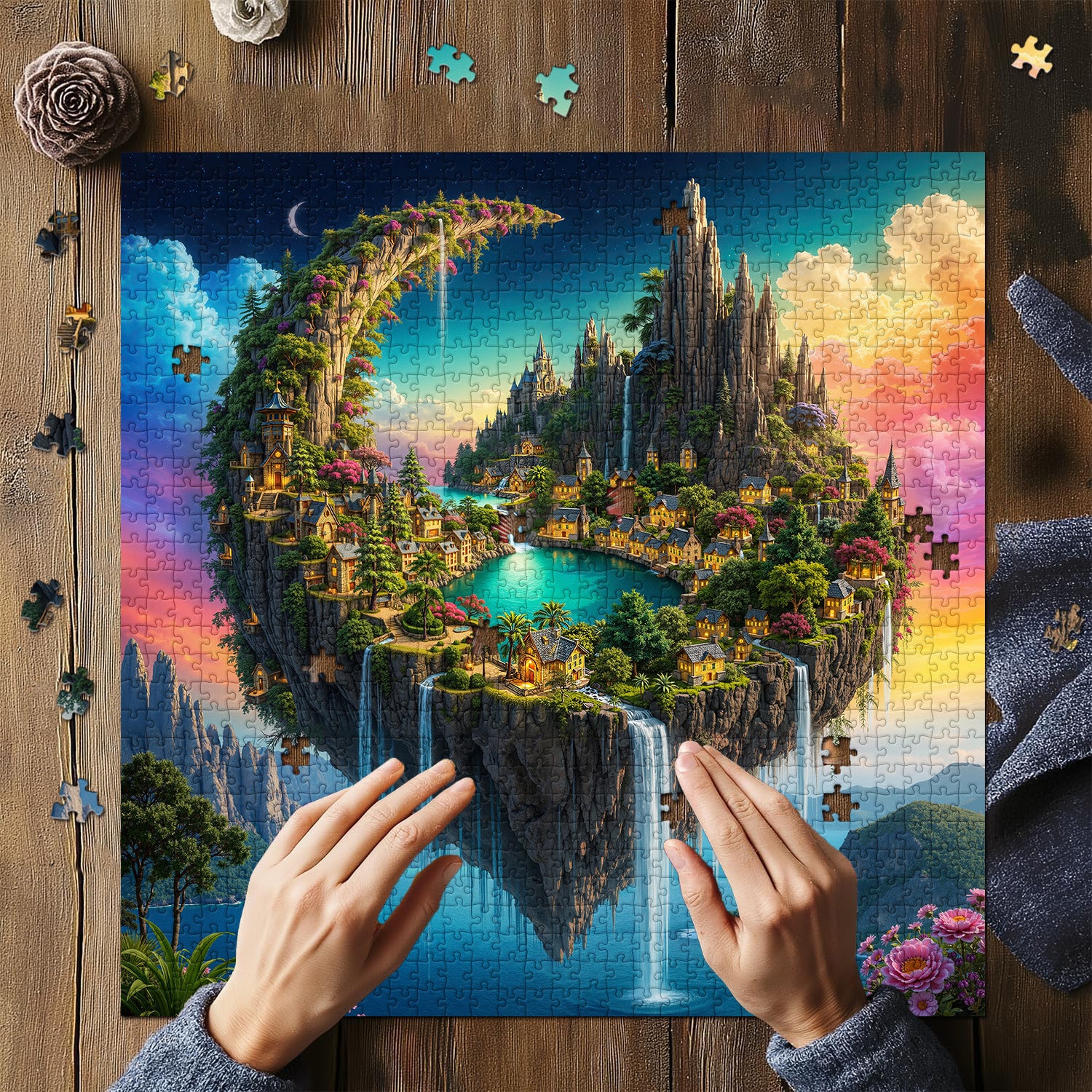 🏰🌅Regno galleggiante: Questo è un puzzle di una fantastica città nel cielo: gigantesche isole galleggianti che sfidano la gravità, cascate che precipitano nella nebbia, calde casette illuminate di giallo e castelli appuntiti sparsi tra loro, alberi secolari inclinati e fiori che sbocciano come cascate. A sinistra, una notte stellata e una falce di luna; a destra, un tramonto d'oro fuso; in basso, un lago a specchio riflette perfettamente l'illusione. Completare il puzzle è come prendersi un giorno libero per rilassarsi sull'isola galleggiante.🏝️💧