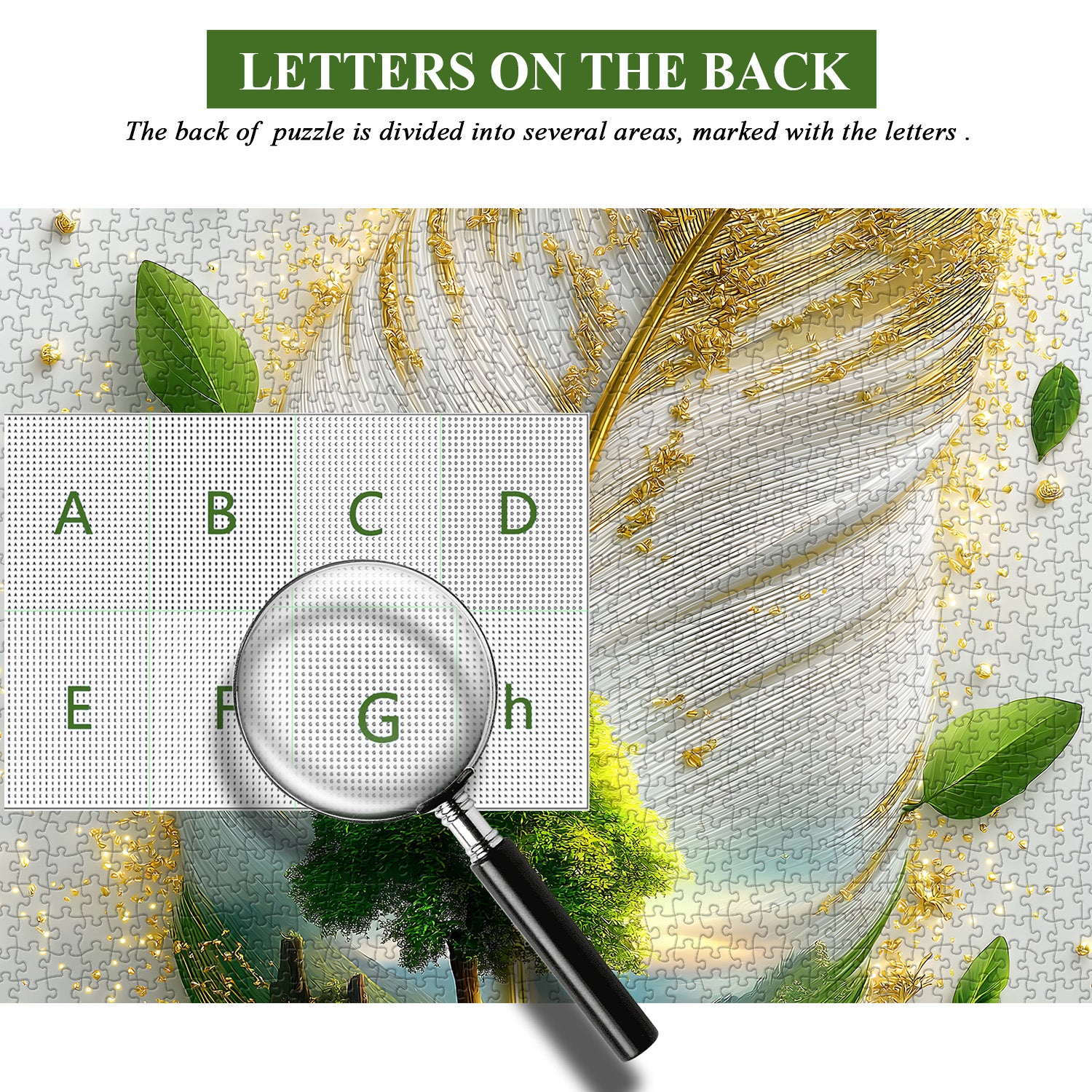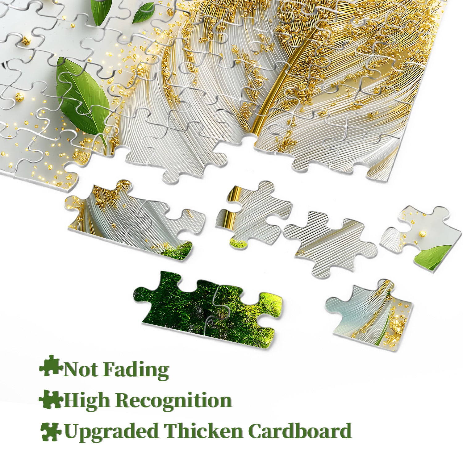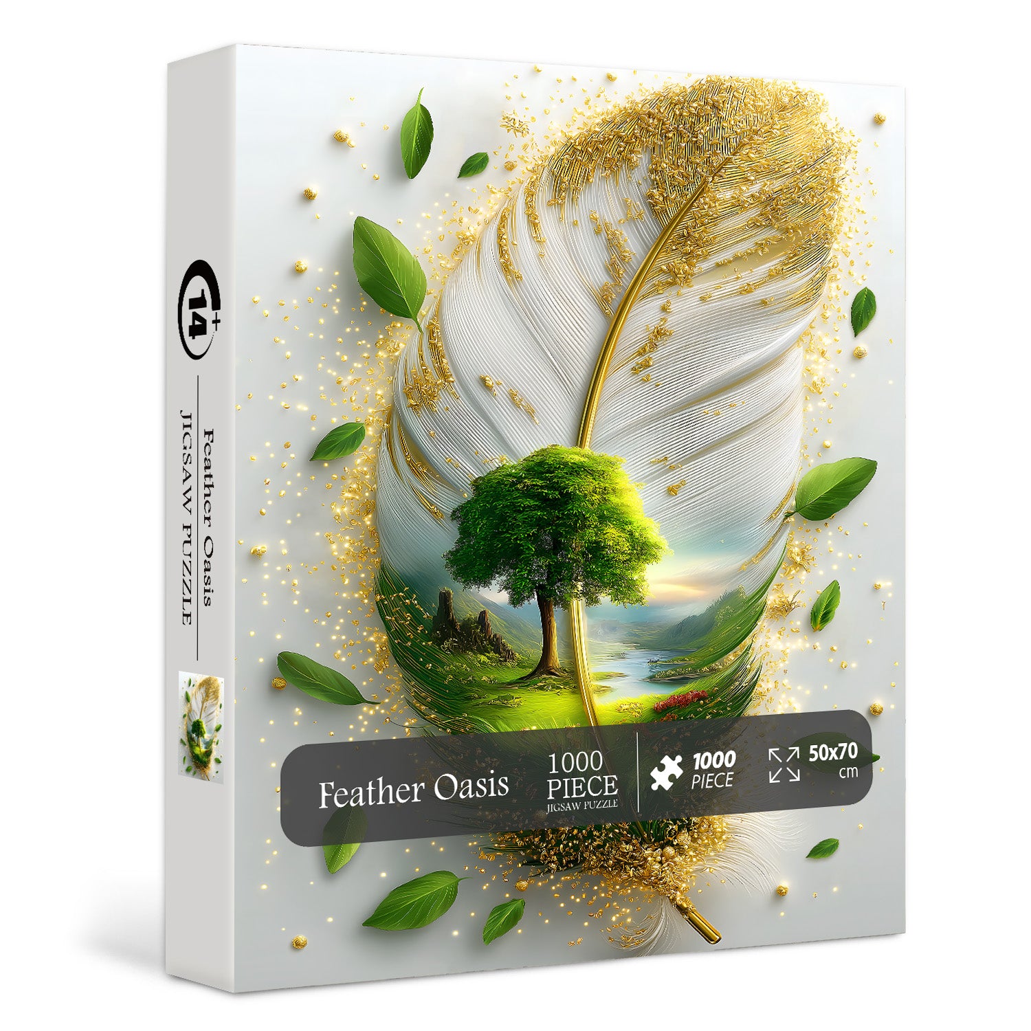 【Oasi delle piume】Questo puzzle presenta una grande piuma come elemento centrale, che raffigura delicatamente una tranquilla scena naturale. Il motivo sulla piuma mostra un albero rigoglioso, un lago limpido e montagne lontane, come un microcosmo della natura.