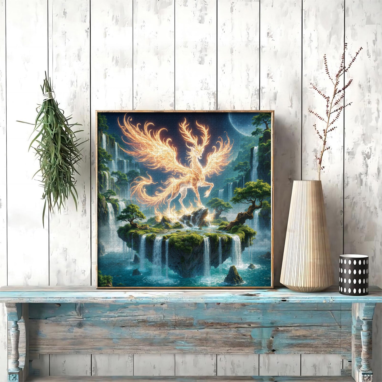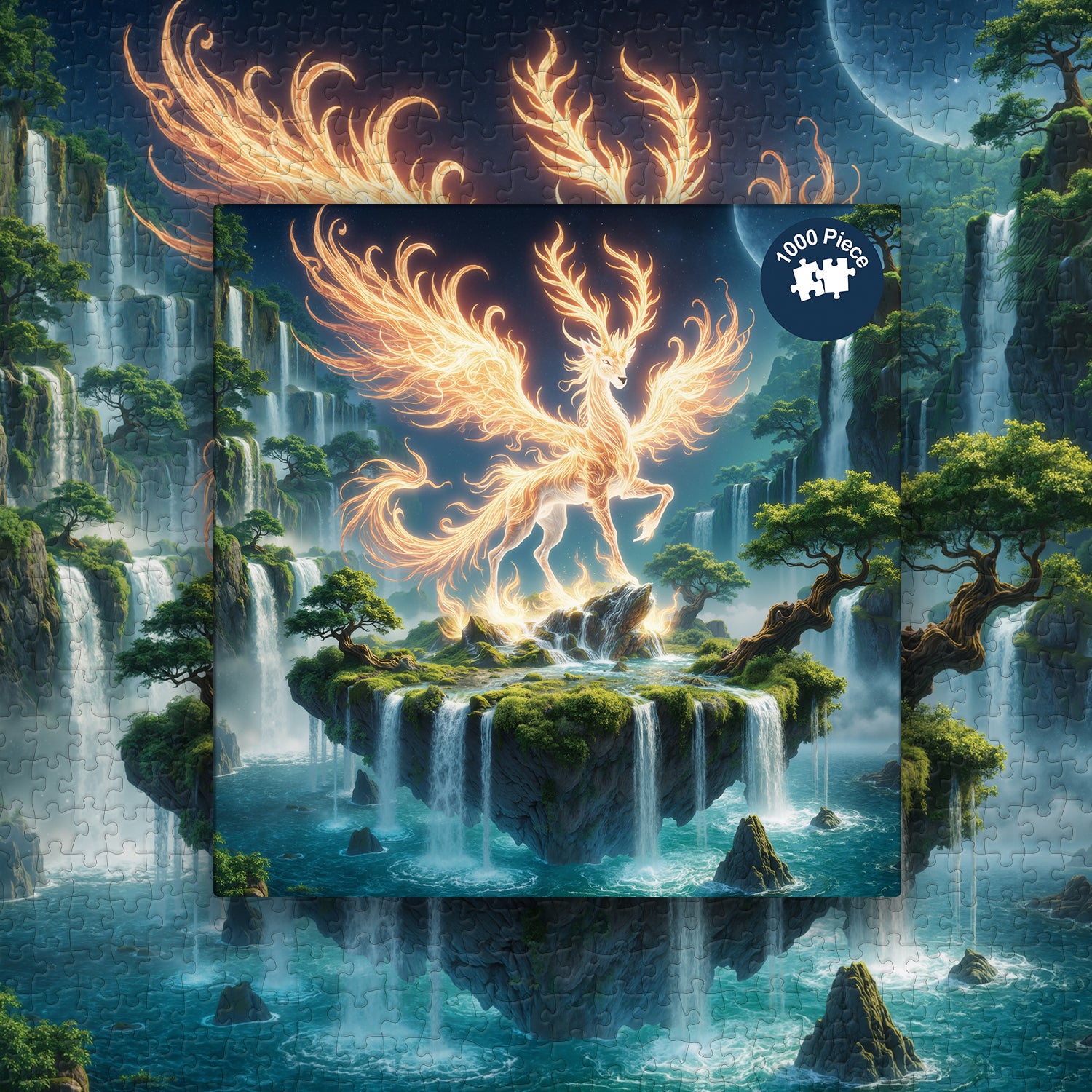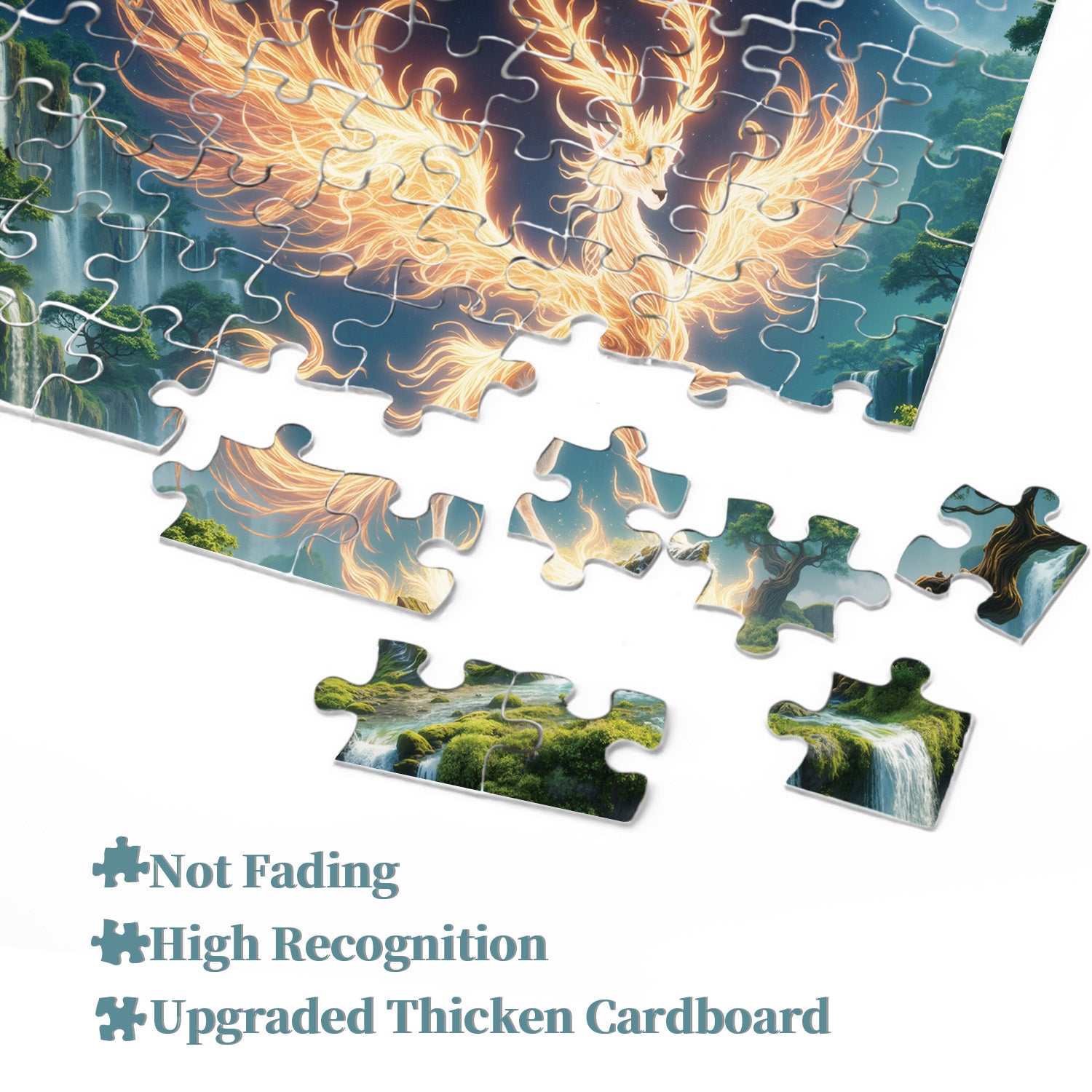 🫎🌳Fiamma EternaQuesto puzzle è incentrato su un cervo divino con le ali spiegate, le sue piume vibranti come fiamme, che simboleggiano rinascita e speranza. Il cervo appare ancora più misterioso al chiaro di luna. Cascate, alberi verdi e rocce circondano il cervo, creando un paesaggio naturale armonioso che ti trasporta in un mistico paese delle fate.🏞️🌌