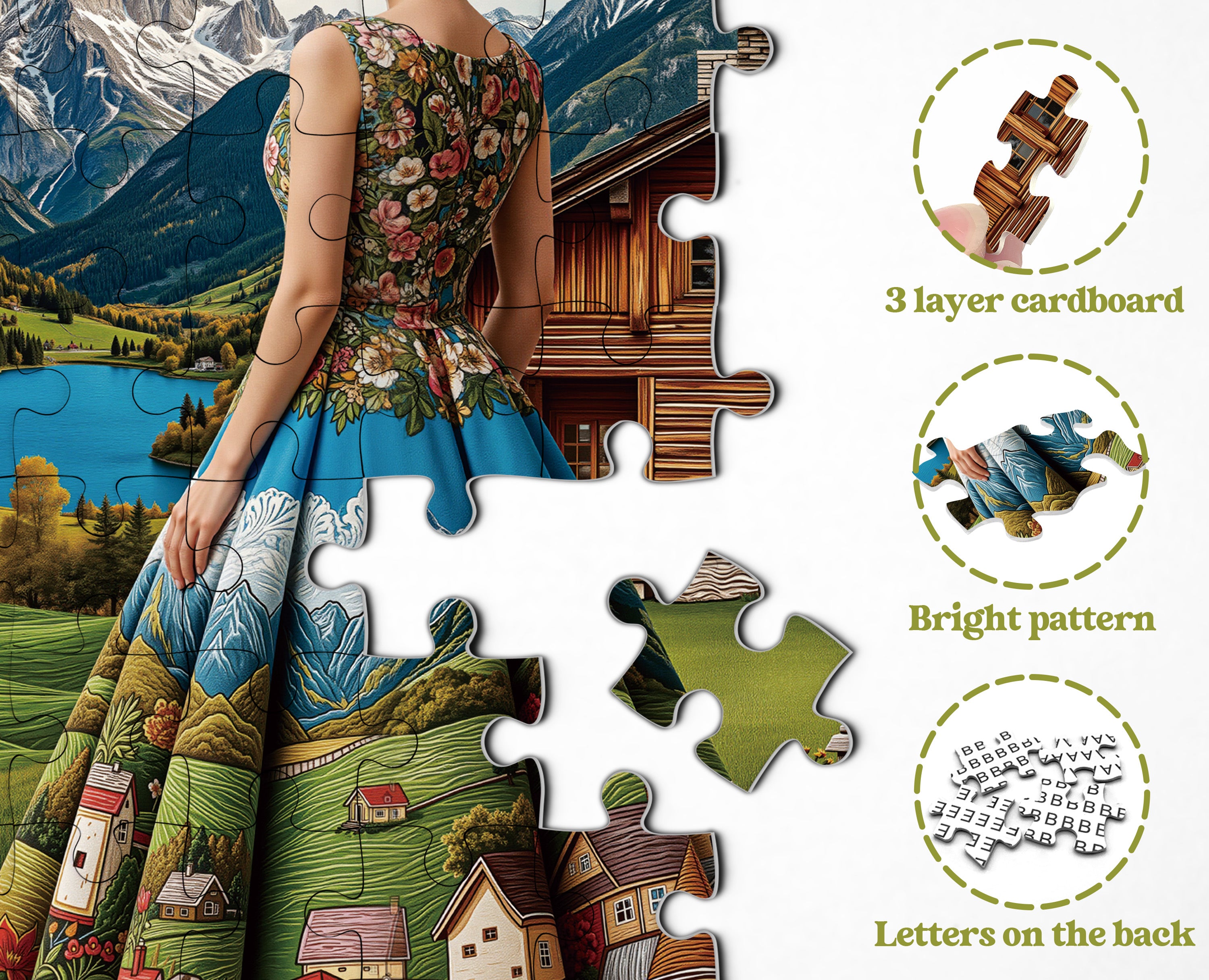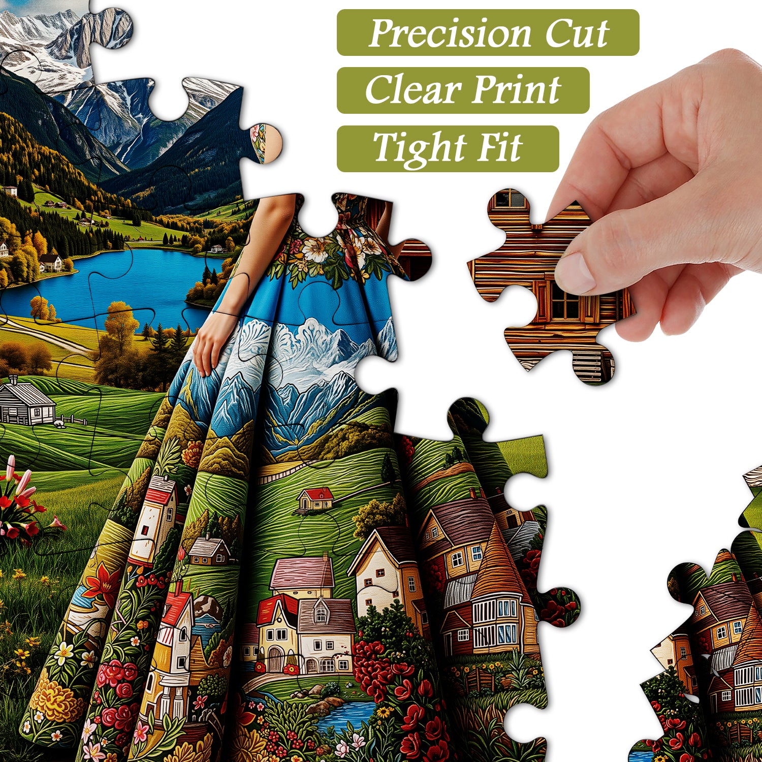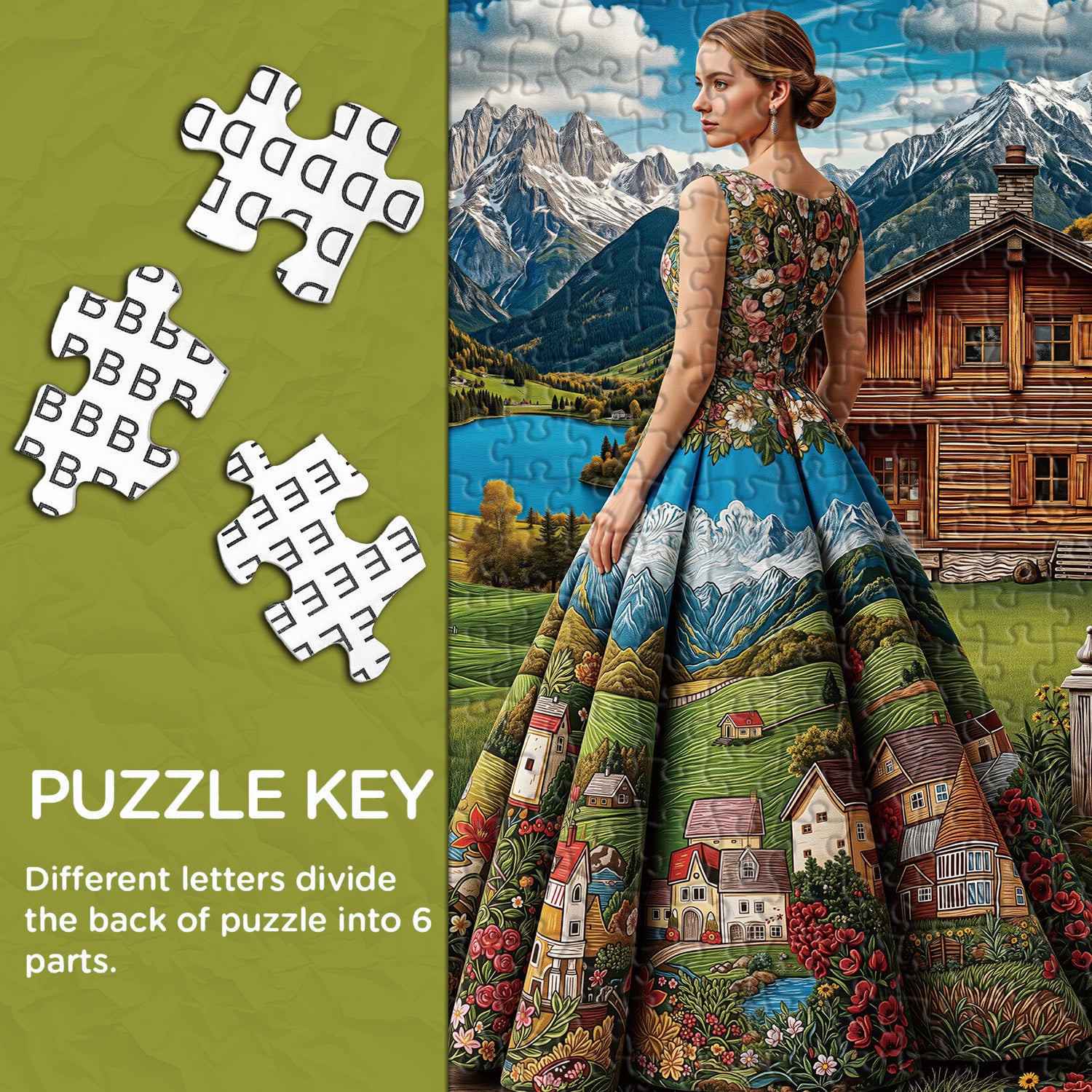 👗🏞️【Signora scenica】Questo puzzle raffigura una donna con uno splendido abito lungo ornato con squisiti motivi paesaggistici, come se indossasse la bellezza della natura. Il cottage di montagna e il limpido lago sullo sfondo creano un'atmosfera rurale tranquilla e pacifica.💐🌄