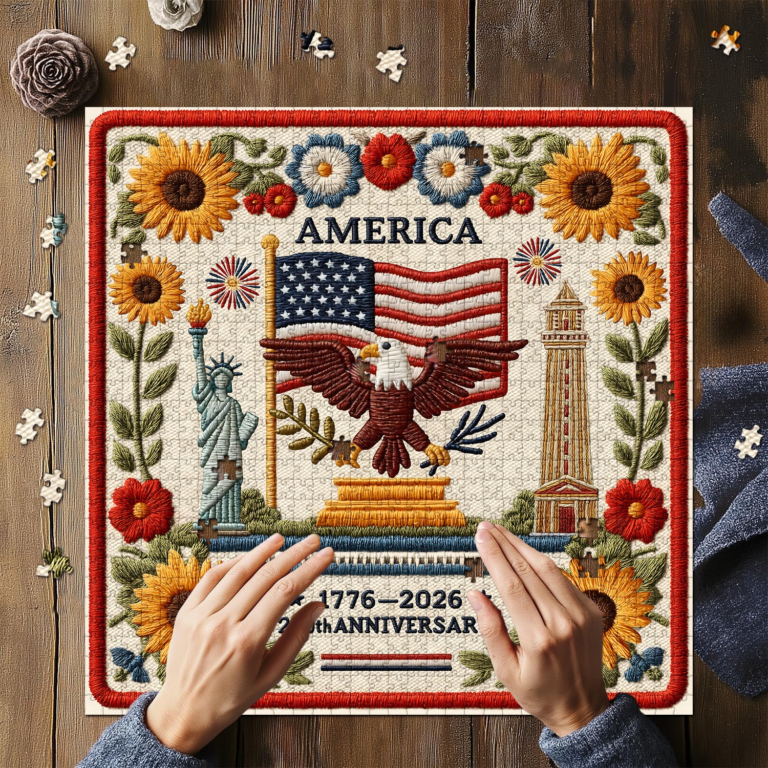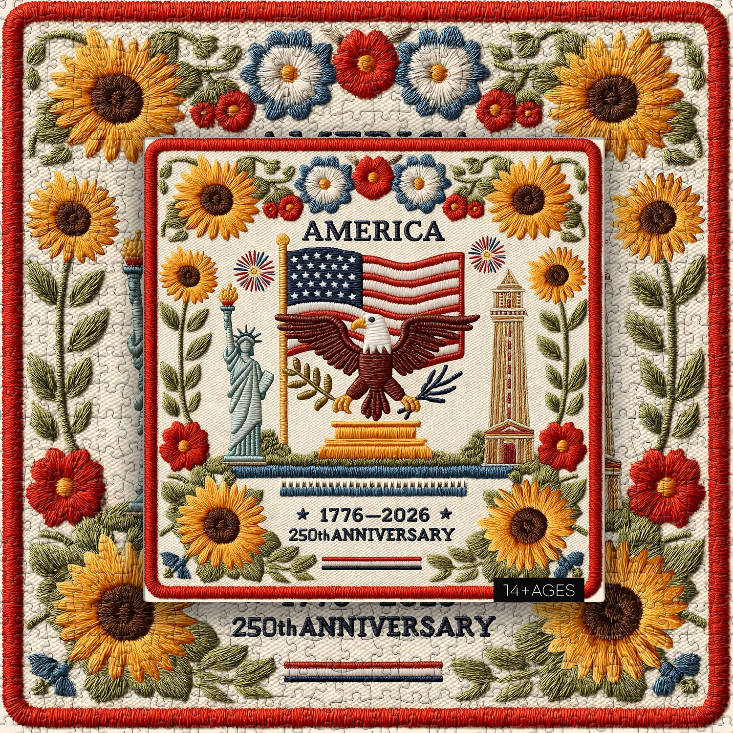🗽🦅Stelle, strisce e libertà: L'uccello nazionale, con le ali spiegate, stringe un ramoscello d'ulivo e delle frecce, la sua schiena svolazza con le stelle e le strisce, un duplice simbolo di pace e forza, il fulcro dell'intero dipinto. A sinistra la Statua della Libertà tiene alta la sua fiaccola, mentre a destra si erge maestosa la guglia del Campidoglio. Girasoli dorati circondano i quattro angoli, adornati con margherite rosse, blu e bianche, e fuochi d'artificio sbocciano su entrambi i lati.🌻🧵