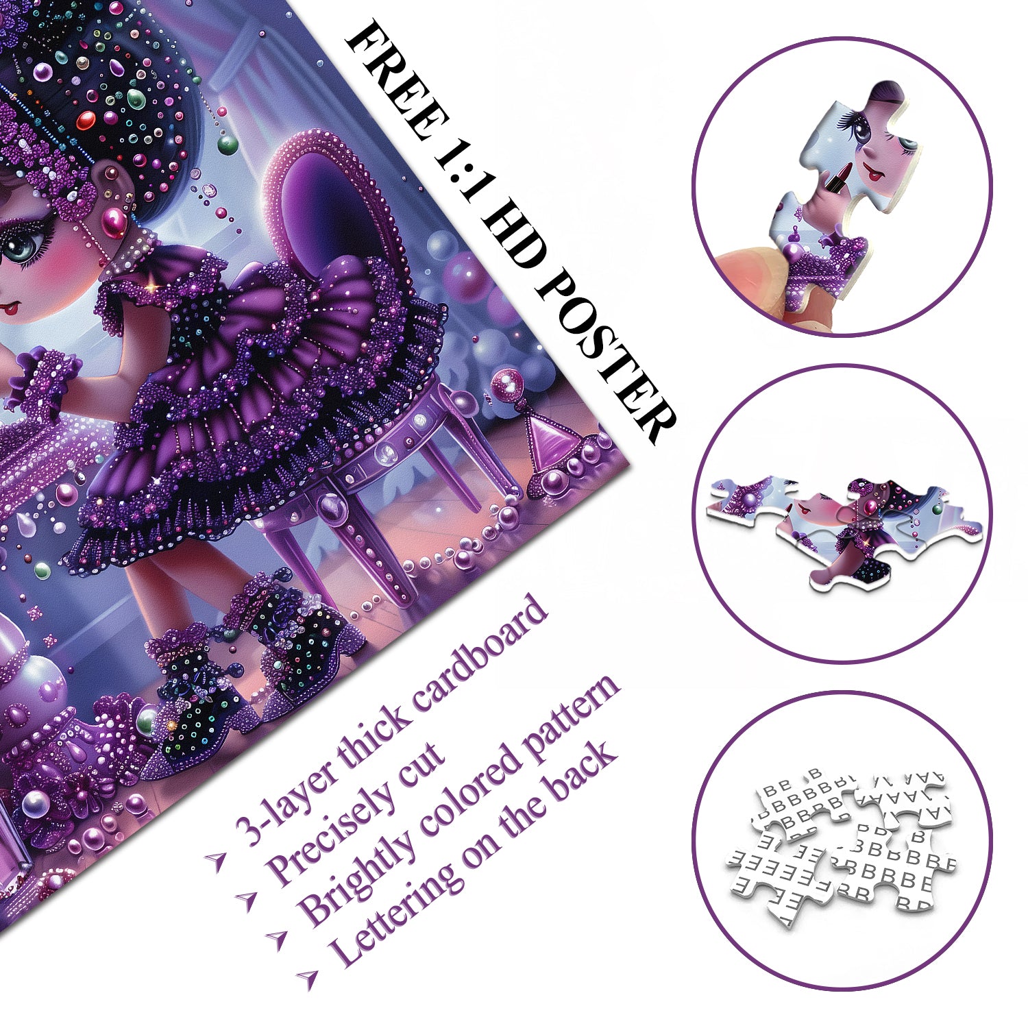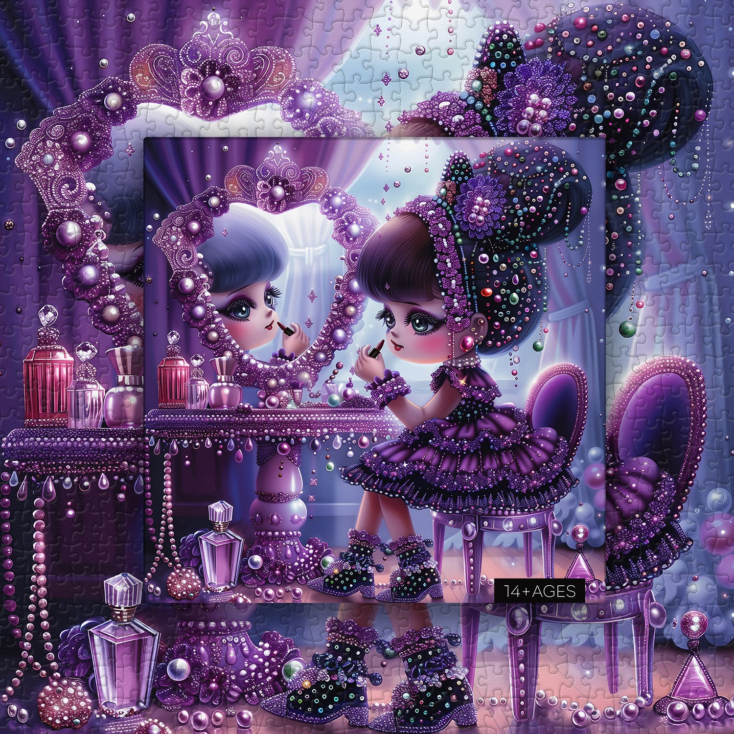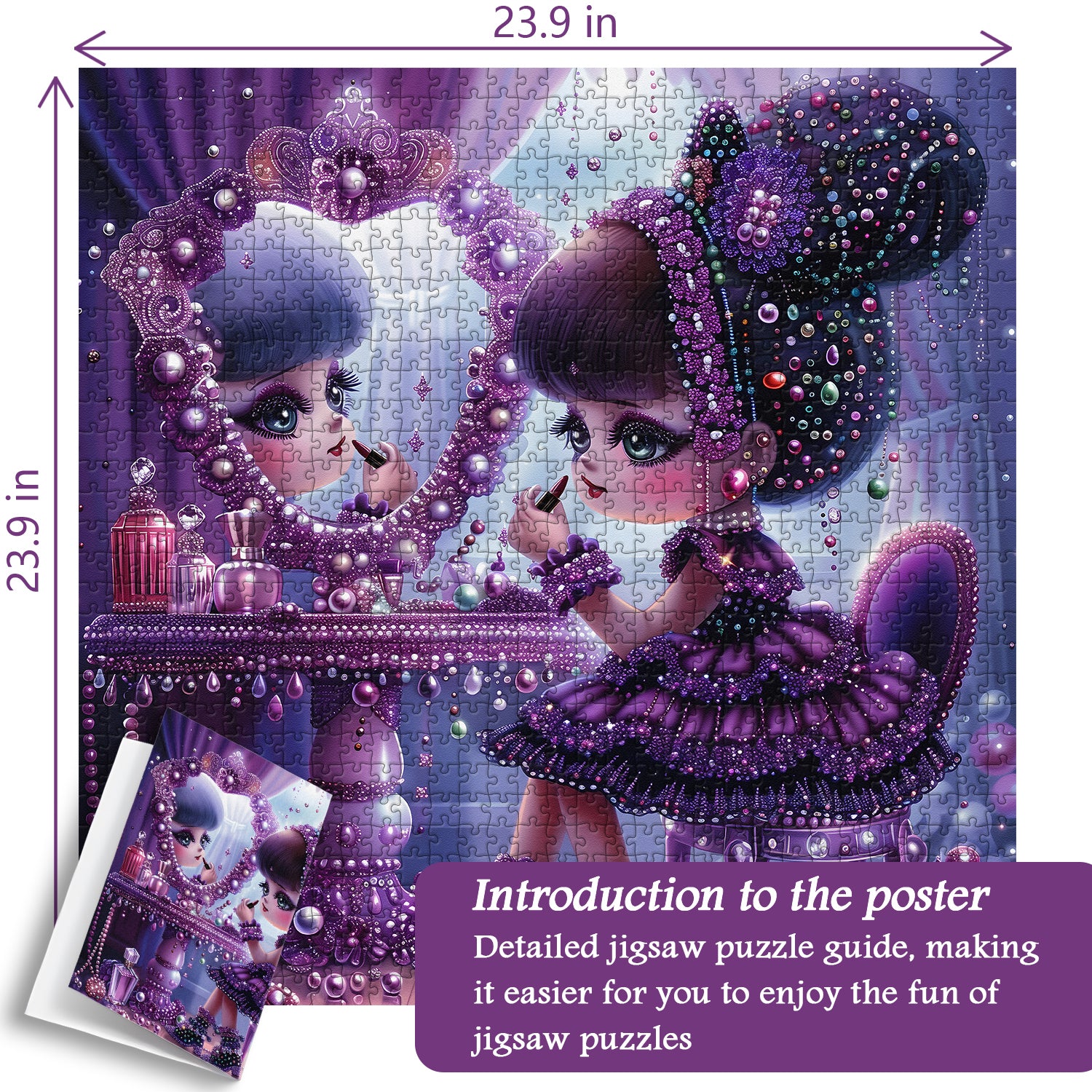 👸👑【Il paese dei sogni delle fiabe】Questo puzzle raffigura un mondo da favola da sogno, in cui una principessa si traveste davanti a una toletta decorata, piena di giocosità e immaginazione infantile. Vestita con uno splendido abito viola e una corona abbagliante, la principessa trasuda nobiltà ed eleganza reali.👗🌈